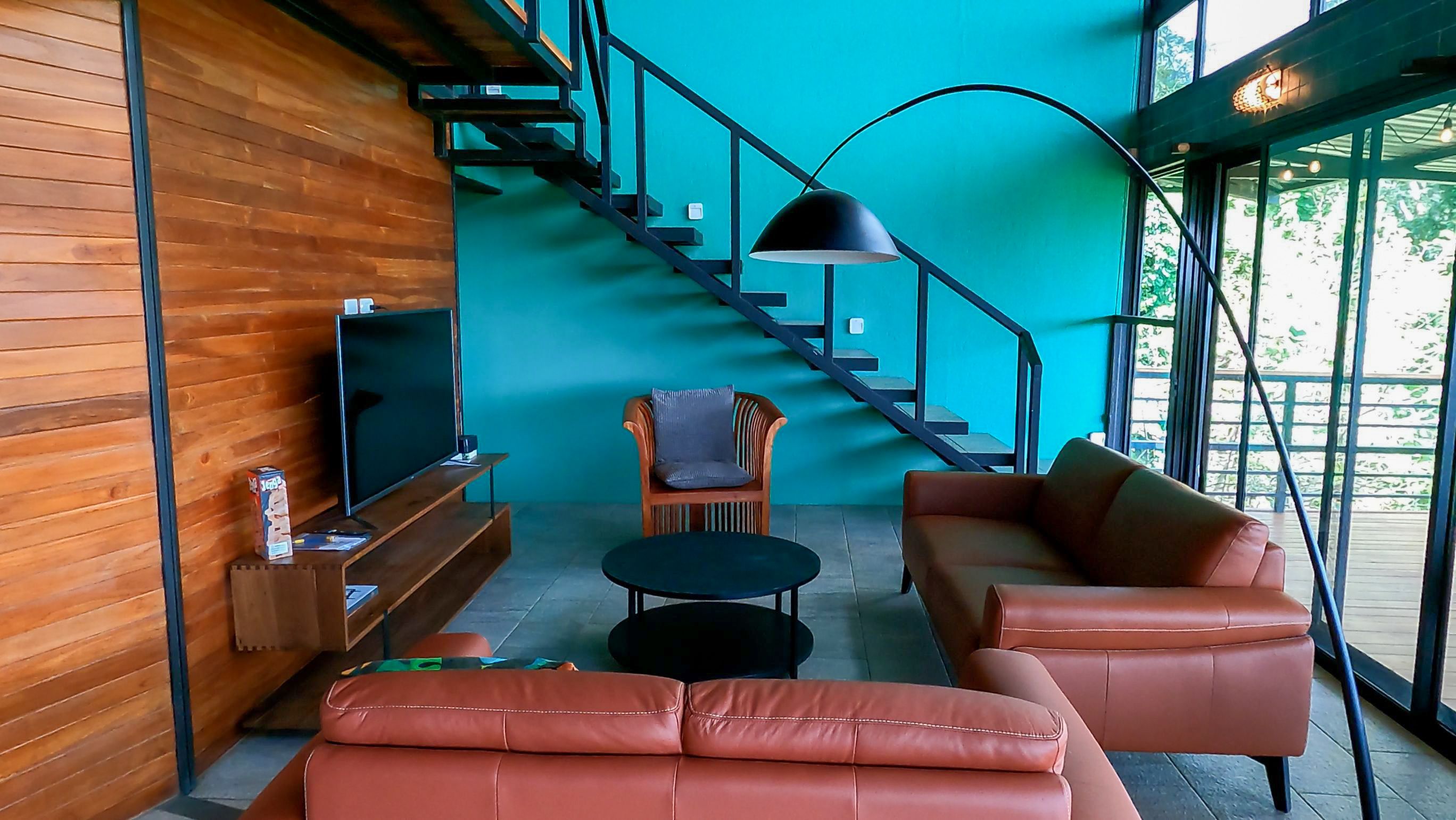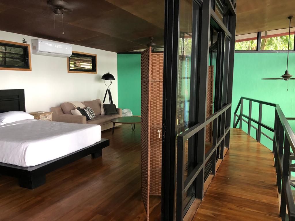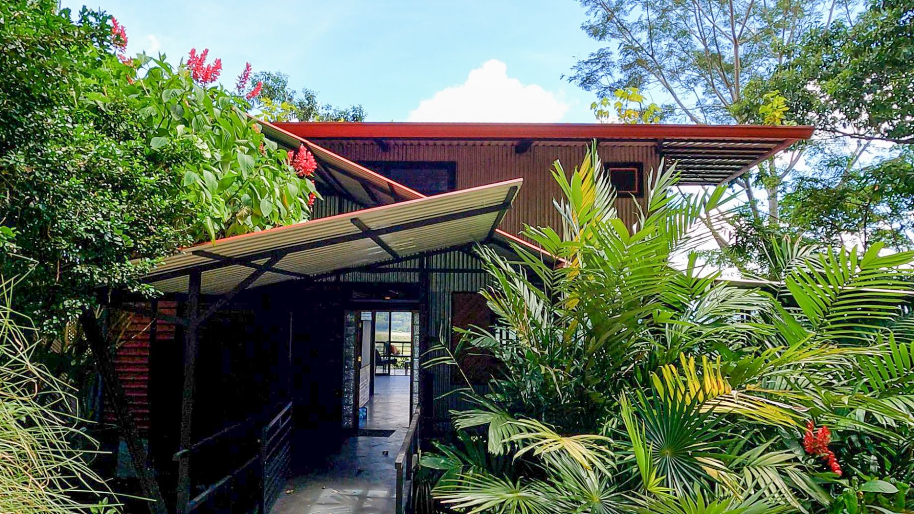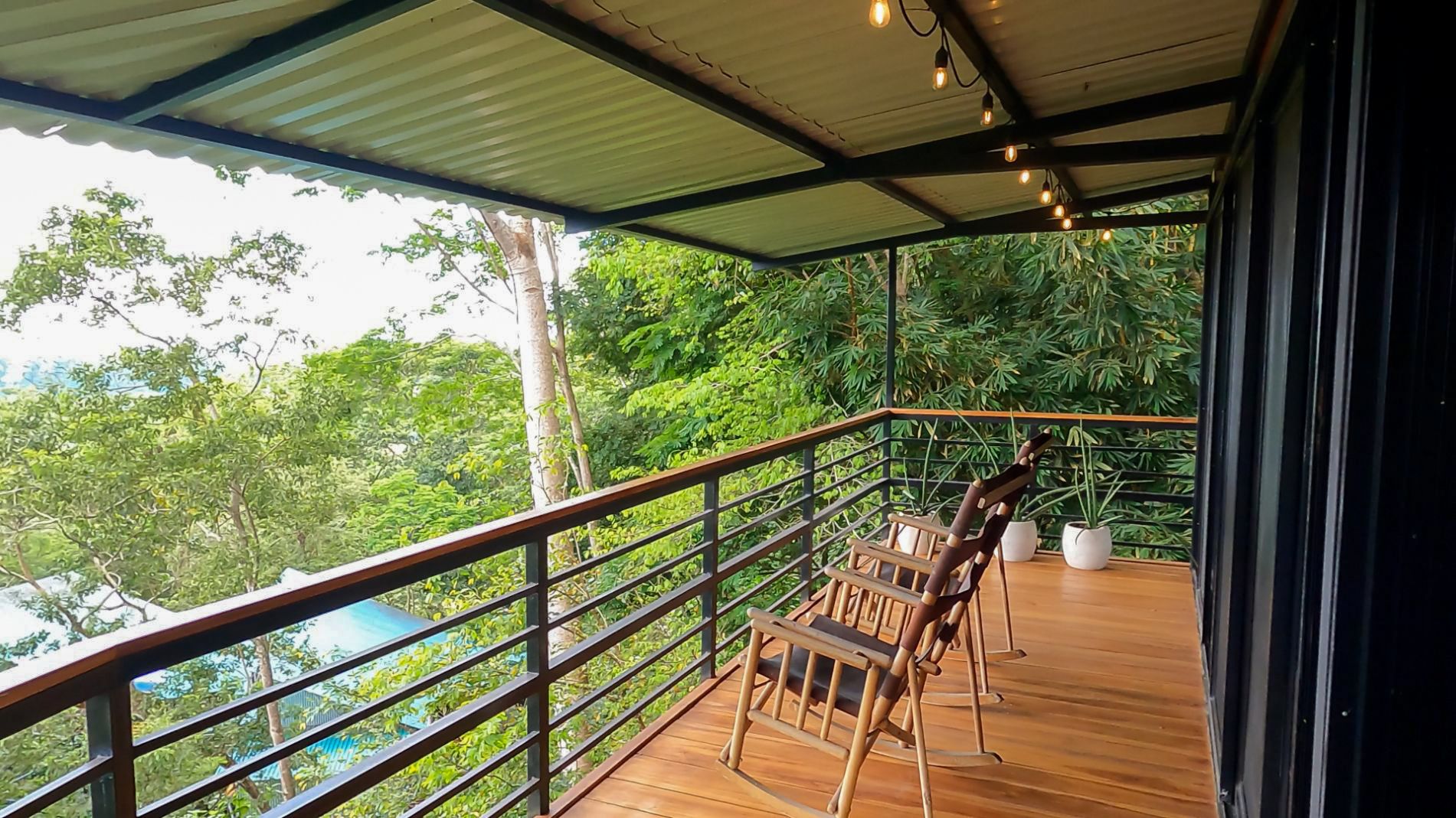 Upstairs there are three bedrooms with one full bath and an additional half bath. All three rooms upstairs are accessed directly by stairs and also by a catwalk running the length of the upstairs. All three upstairs rooms overlook the living room below with glass sliders and curtains to close the view if needed for sleep. When opened they offer the same stunning valley, river, and mountain views as the floor below. You will delight in waking up each day to the most expansive and amazing sunrise view! And a brand new balcony was recently added so you can enjoy your morning coffee perched high above the rainforest canopy and stunning river valley view. The home is designed for energy efficiency and is cool, even at midday. The master bedroom suite is air-conditioned. With small modifications, the remaining living space in the house can be air-conditioned with split AC units. Built with galvanized steel beams and panels, the home is easy to maintain with no worries about mold or termites in the tropical environment.