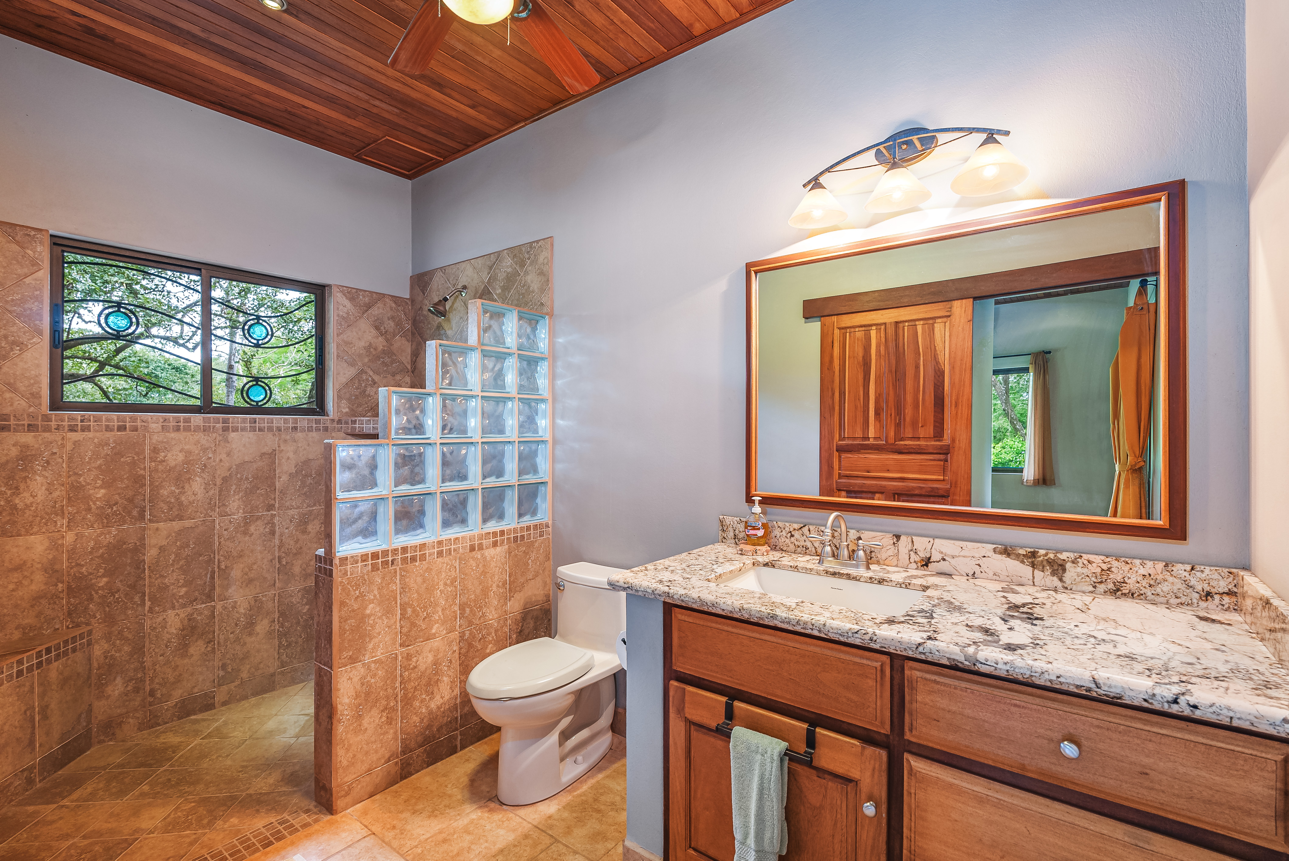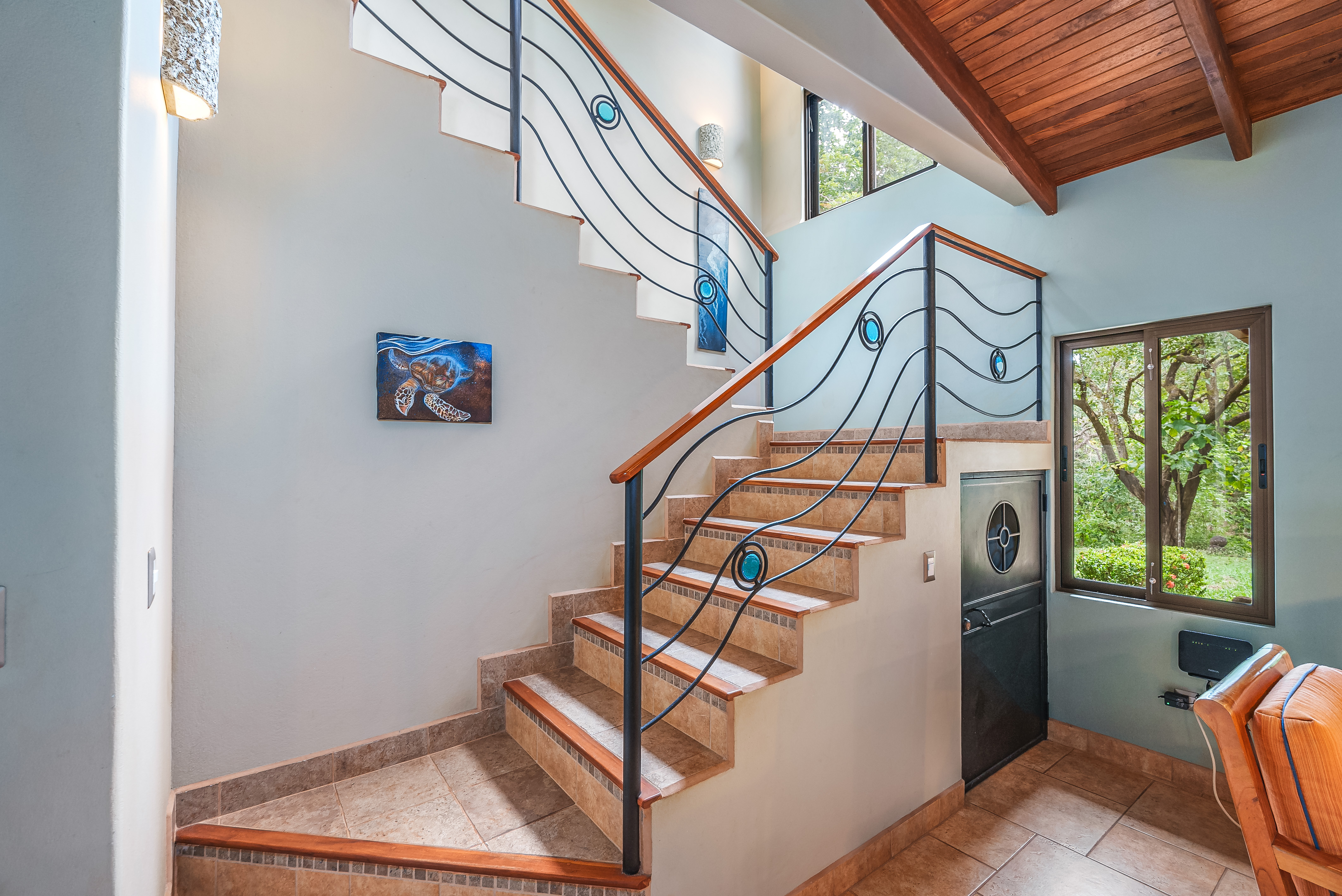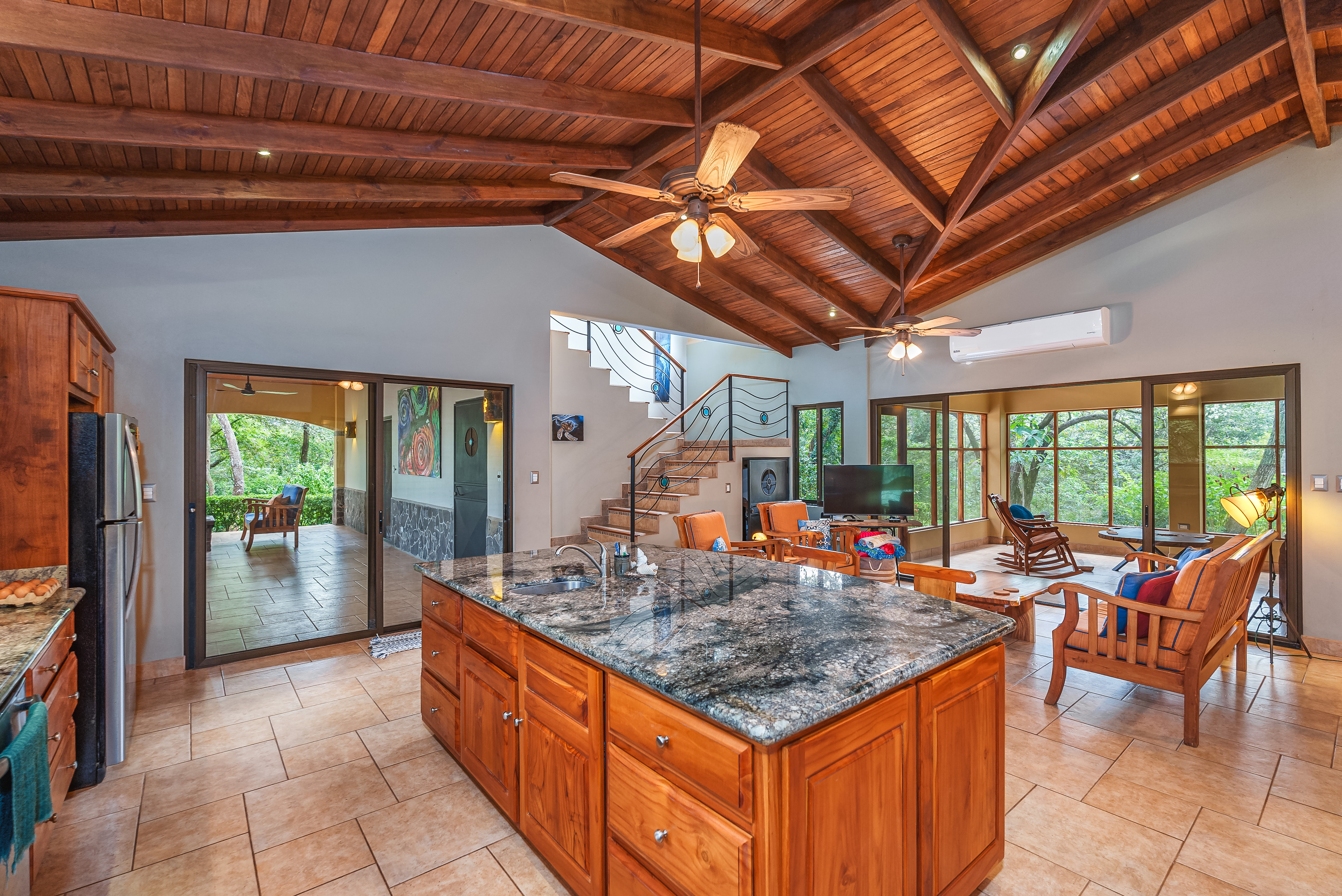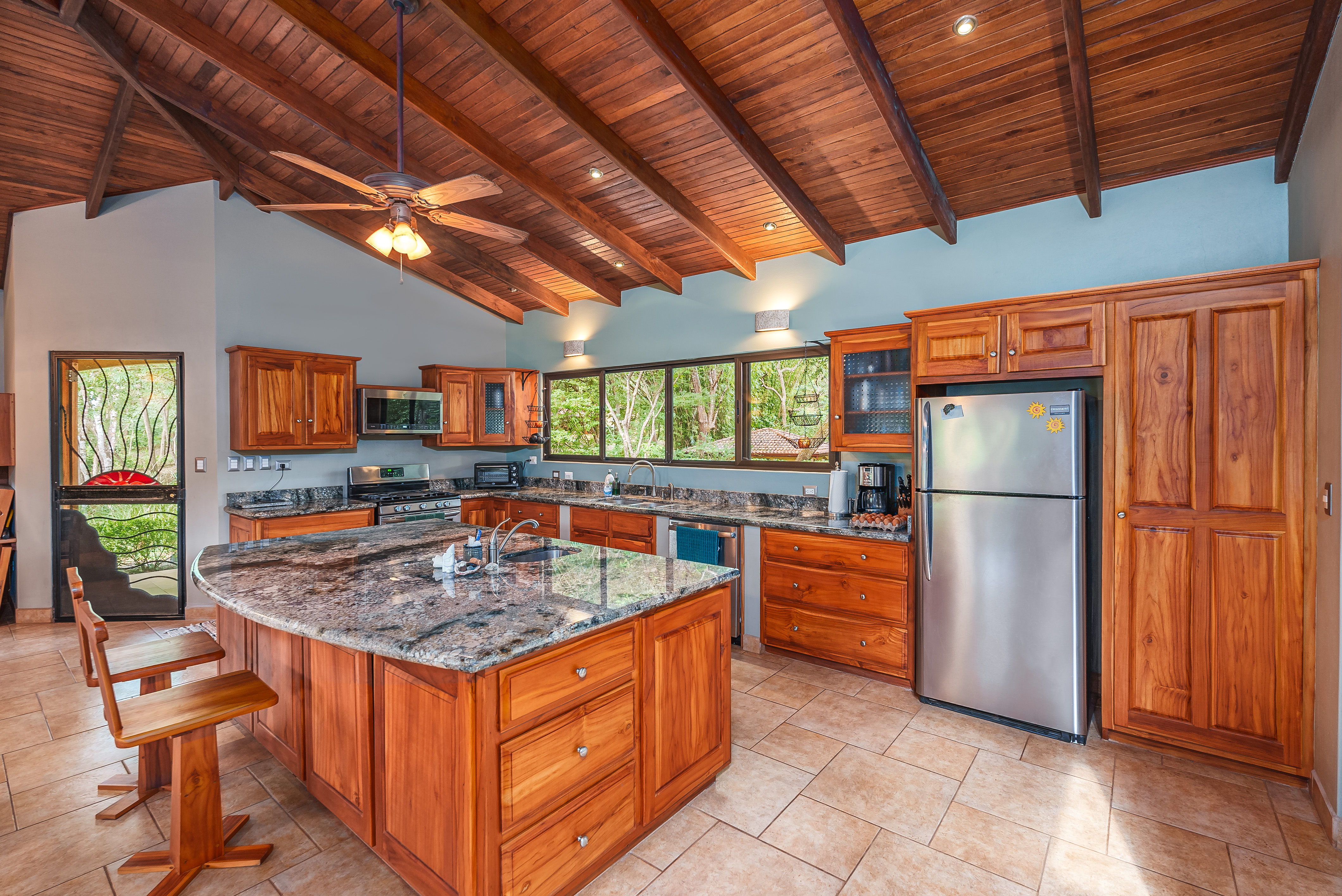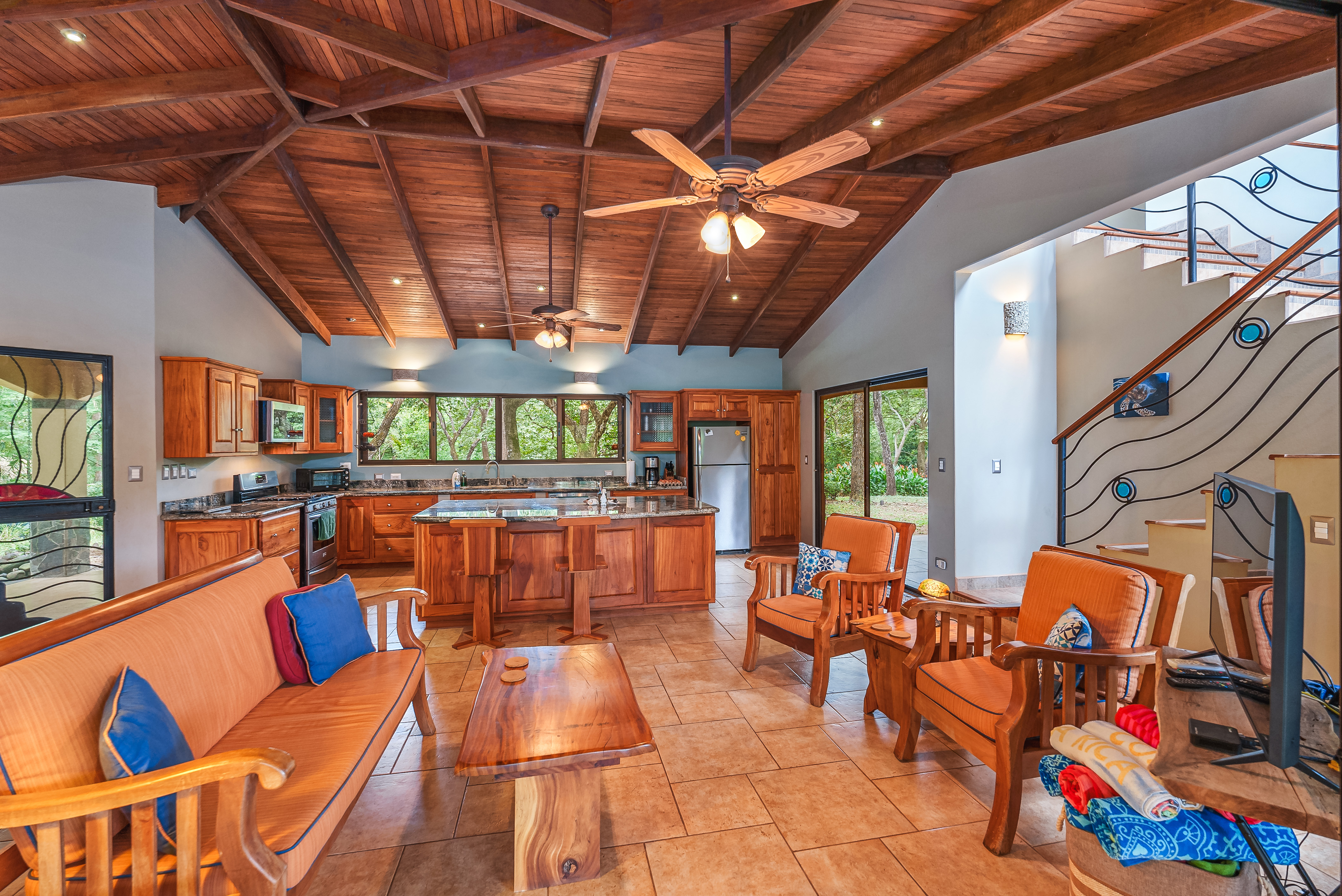 This fully furnished three-bedroom house on two levels features superior materials throughout its 2,500 square feet. Local hardwoods were used for rafters, ceilings, cabinetry, interior doors, and furniture. The flooring is Italian ceramic tile and expansive granite countertops highlight a modern kitchen with a massive island that is perfect for hosting. Decorative wrought iron and stained-glass exterior doors and stair railings add creative form to everyday function adding to the artistic flair of Casa del Bosque.