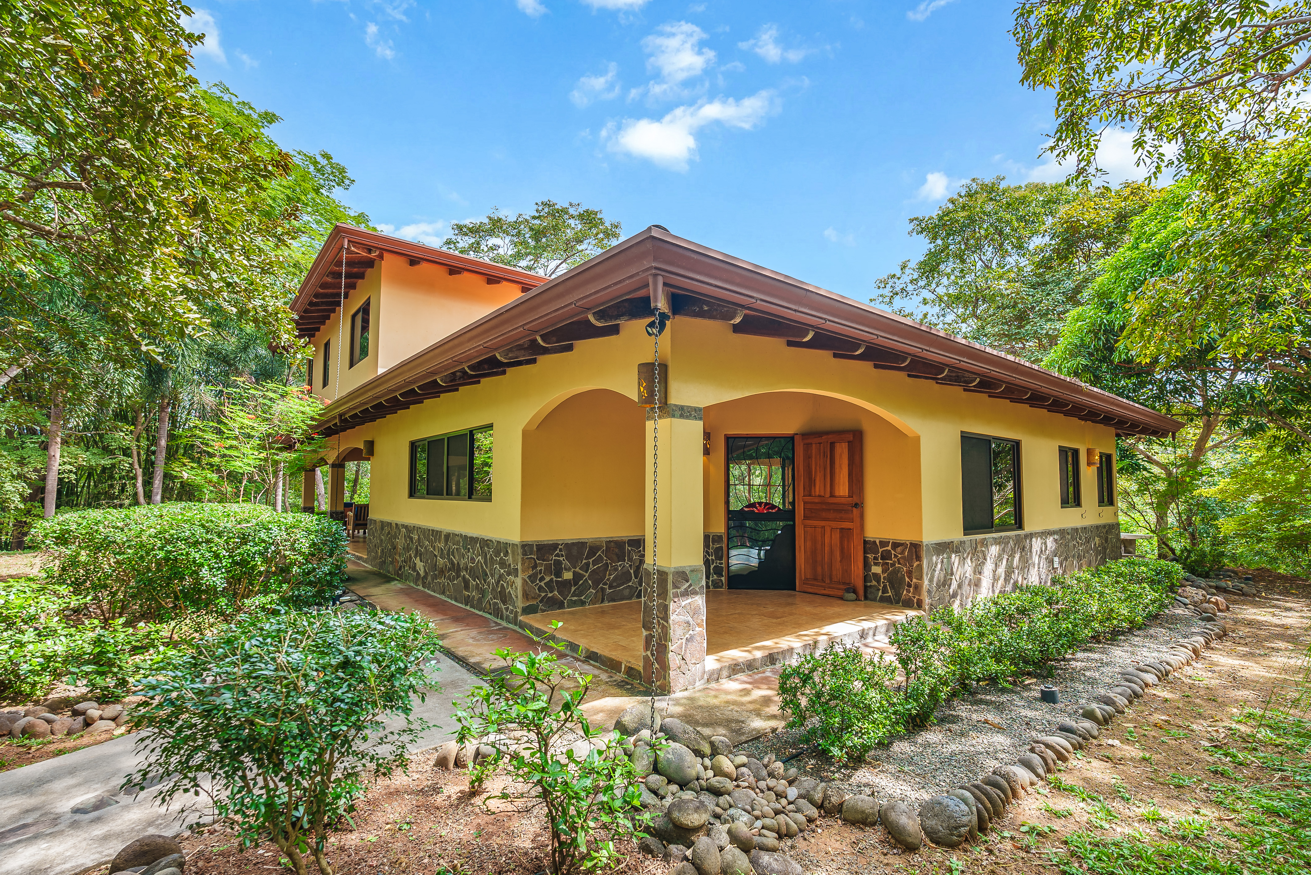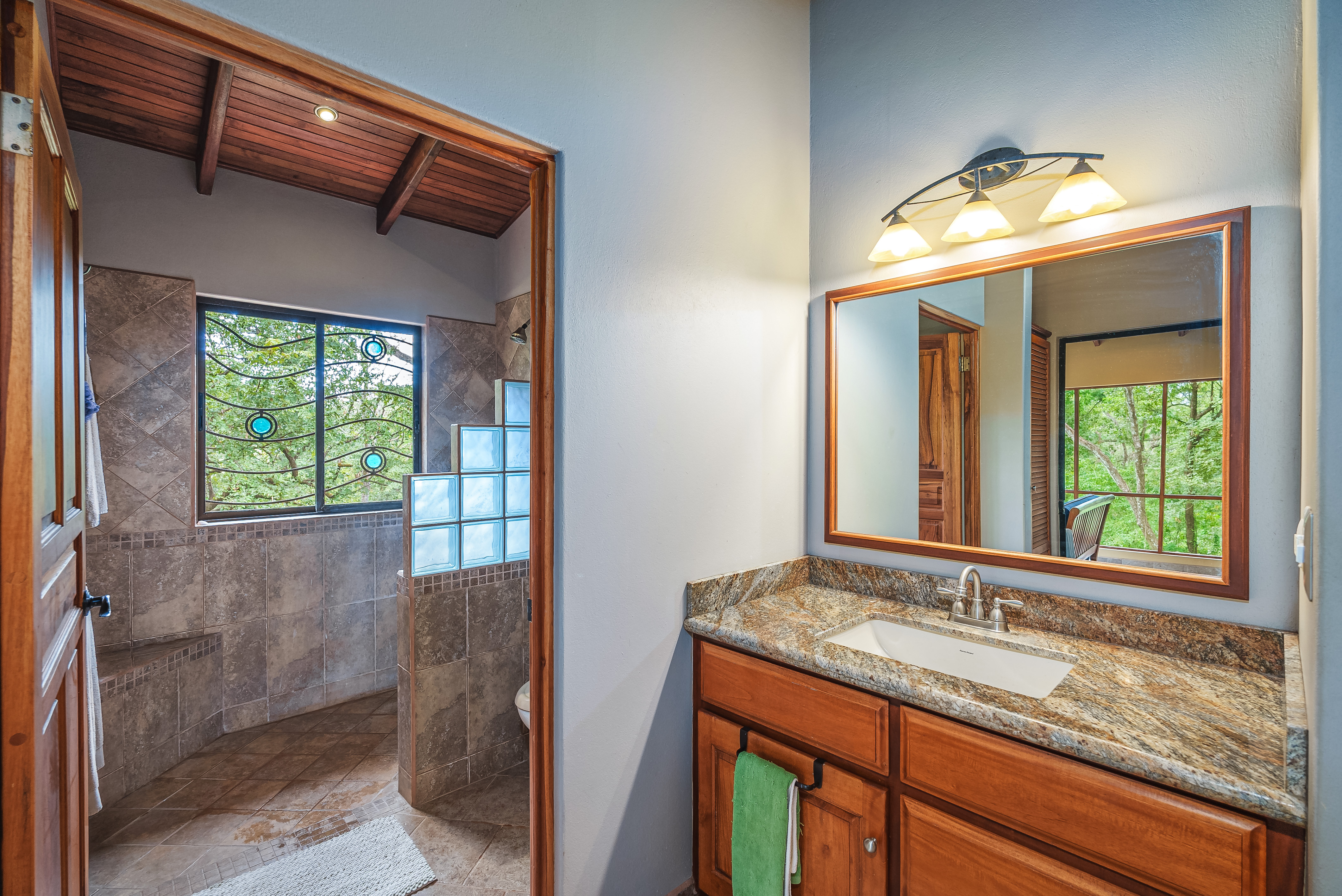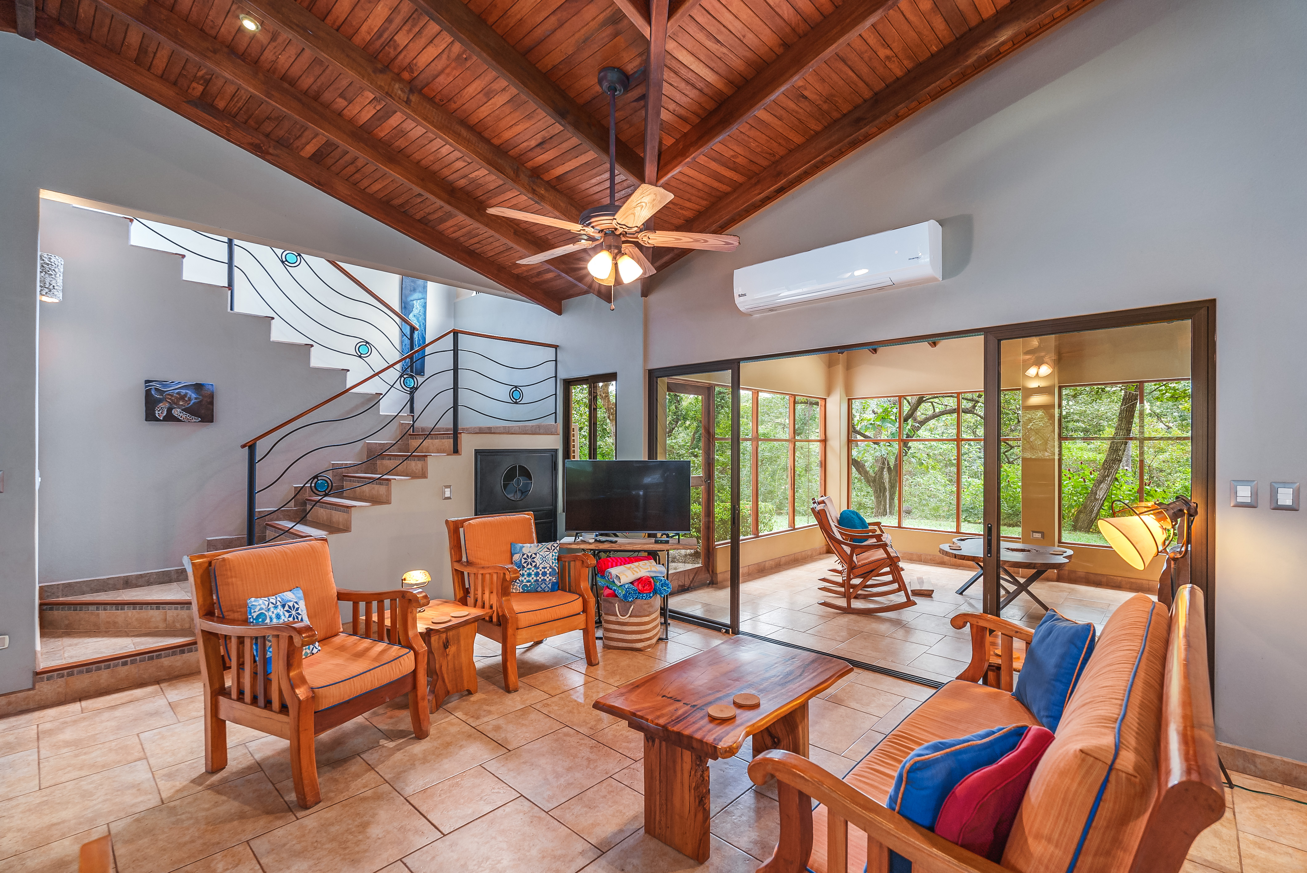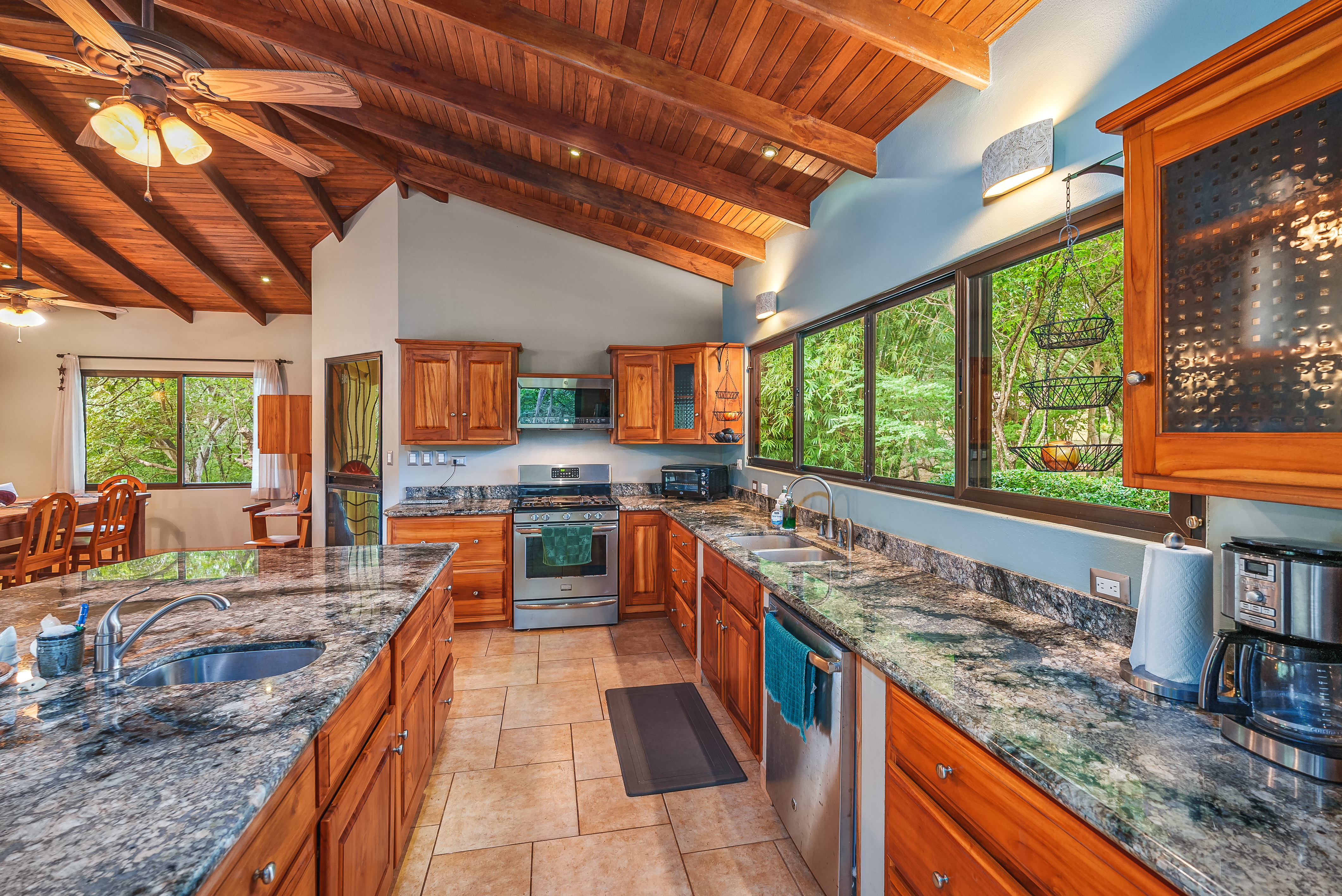 This fully furnished three-bedroom house on two levels features superior materials throughout its 2,500 square feet. Local hardwoods were used for rafters, ceilings, cabinetry, interior doors, and furniture. The flooring is Italian ceramic tile and expansive granite countertops highlight a modern kitchen with a massive island that is perfect for hosting. Decorative wrought iron and stained-glass exterior doors and stair railings add creative form to everyday function adding to the artistic flair of Casa del Bosque.
