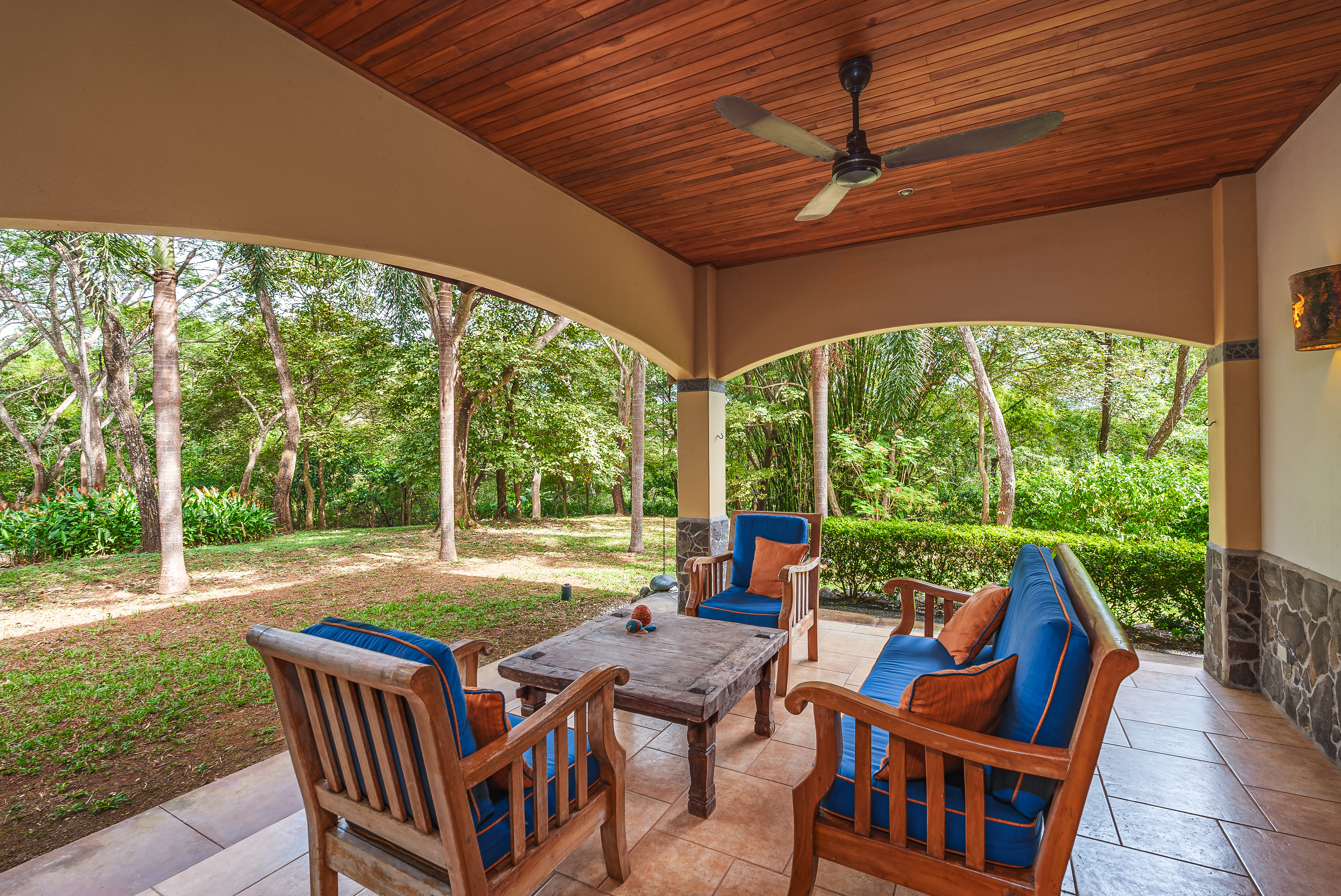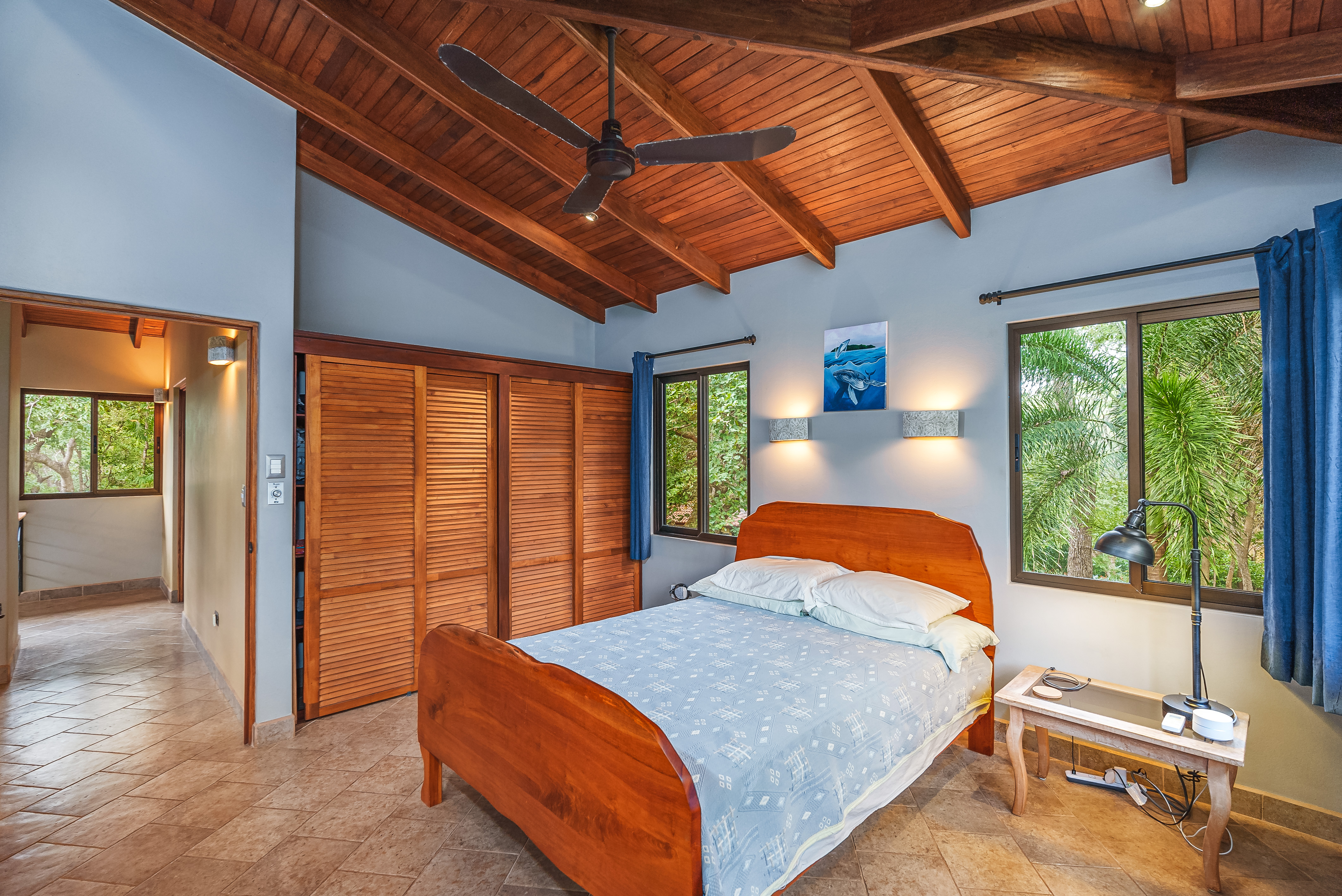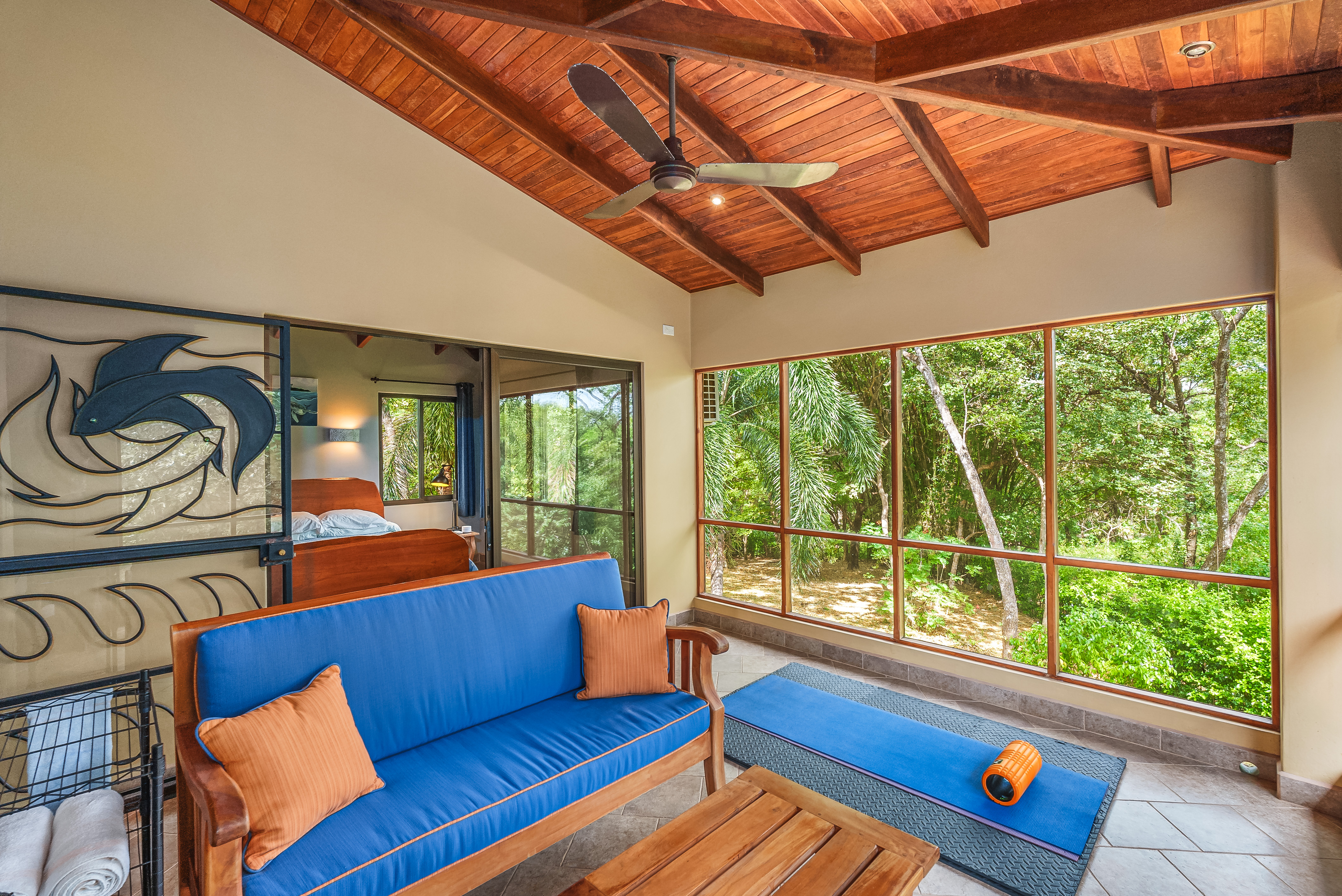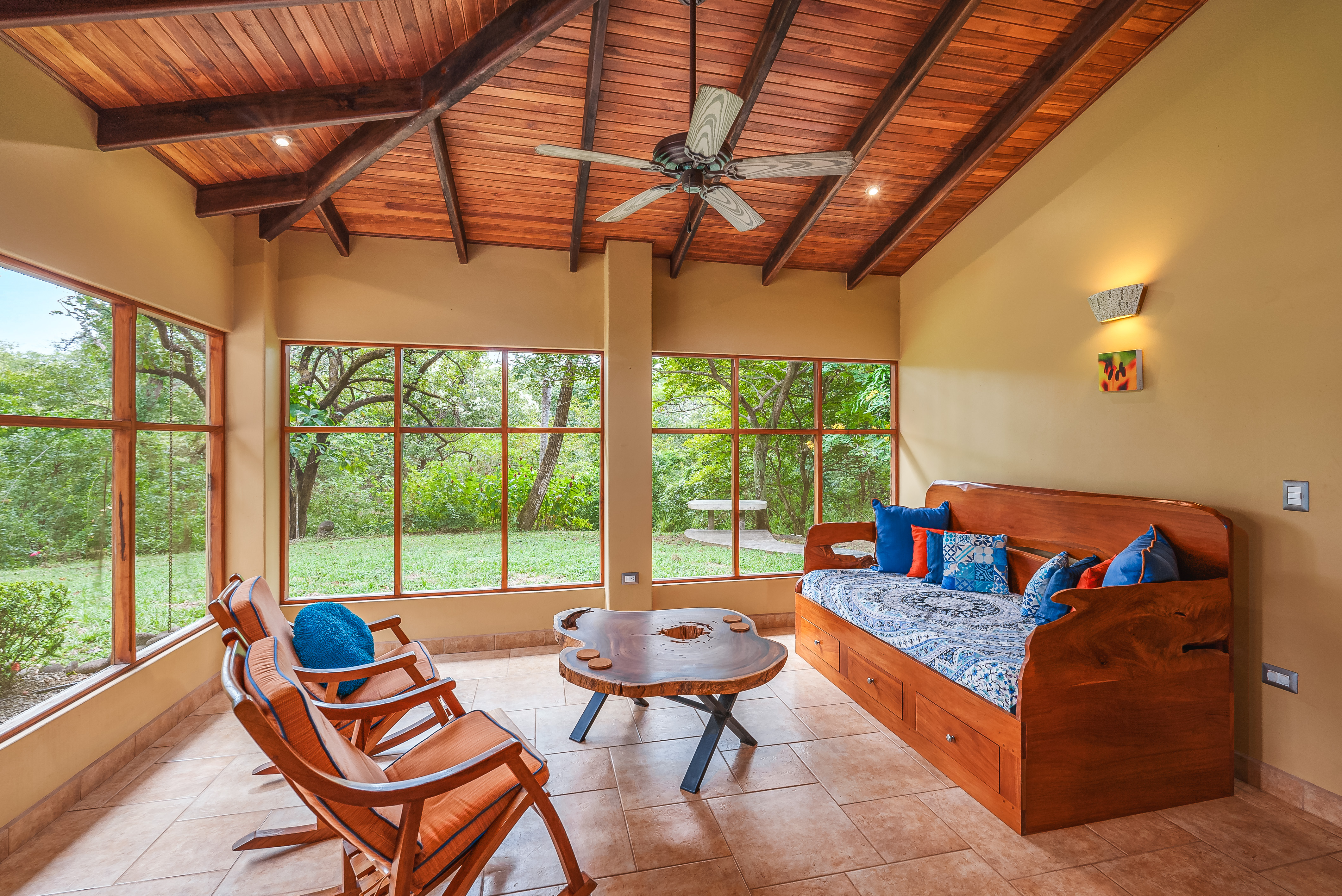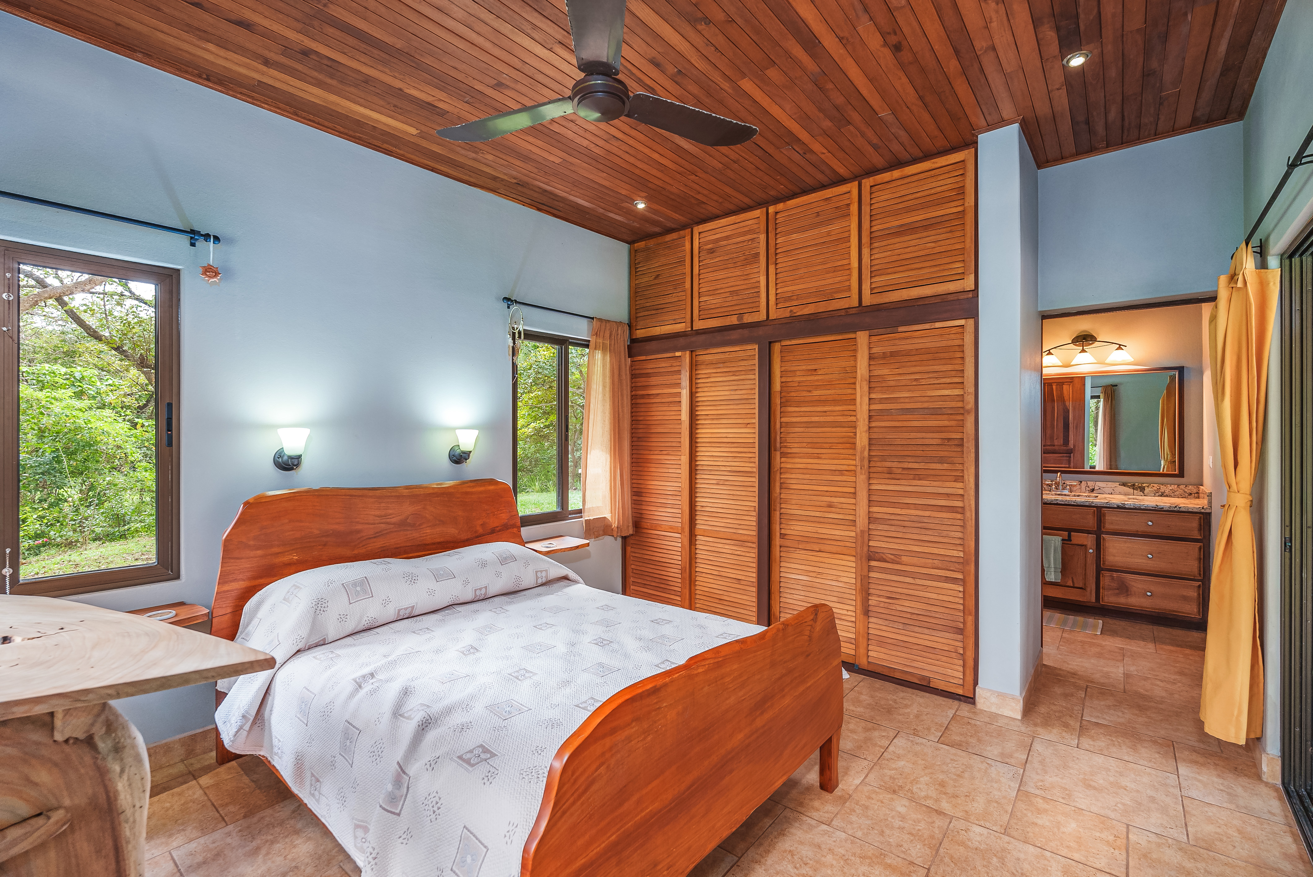 This fully furnished three-bedroom house on two levels features superior materials throughout its 2,500 square feet. Local hardwoods were used for rafters, ceilings, cabinetry, interior doors, and furniture. The flooring is Italian ceramic tile and expansive granite countertops highlight a modern kitchen with a massive island that is perfect for hosting. Decorative wrought iron and stained-glass exterior doors and stair railings add creative form to everyday function adding to the artistic flair of Casa del Bosque.