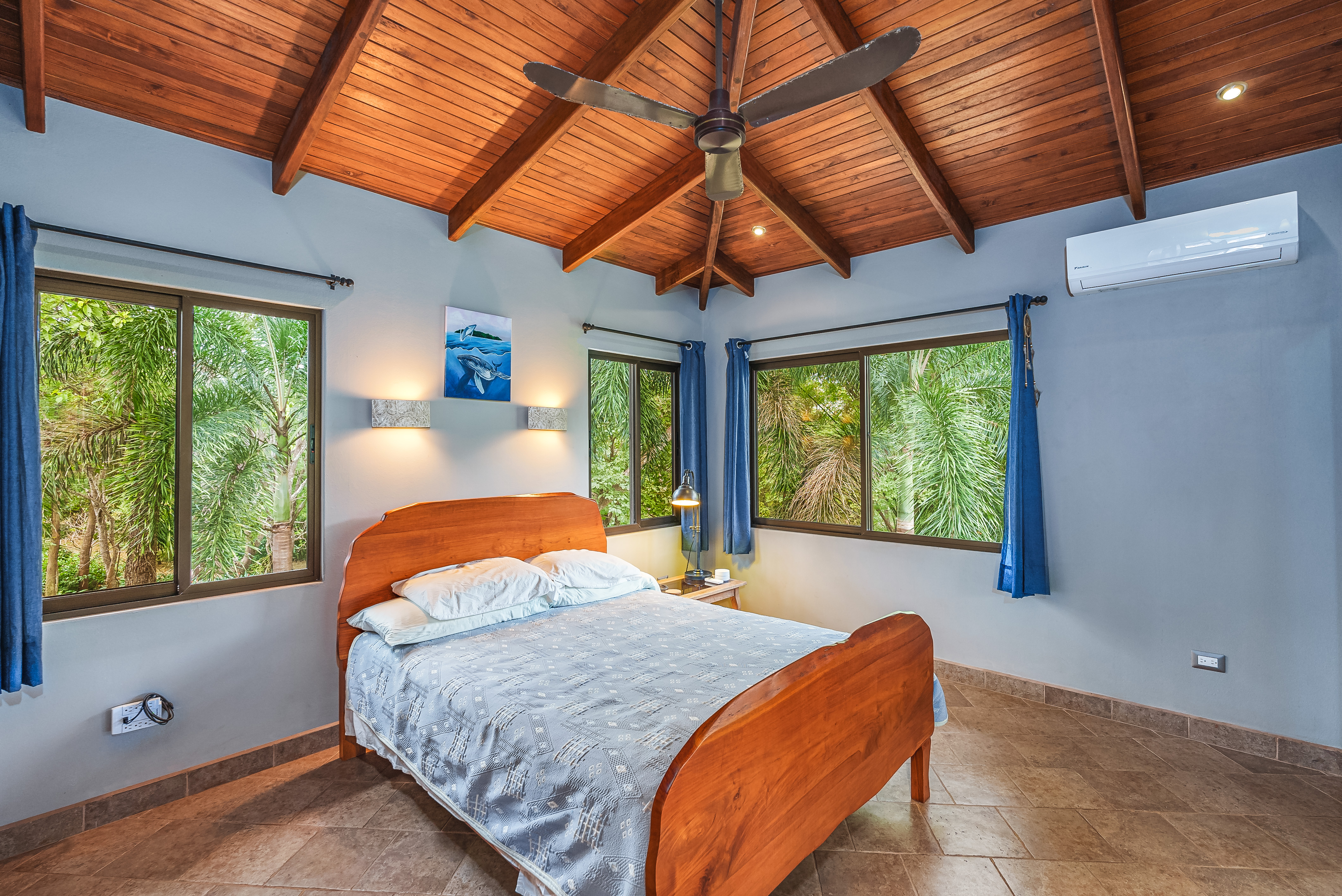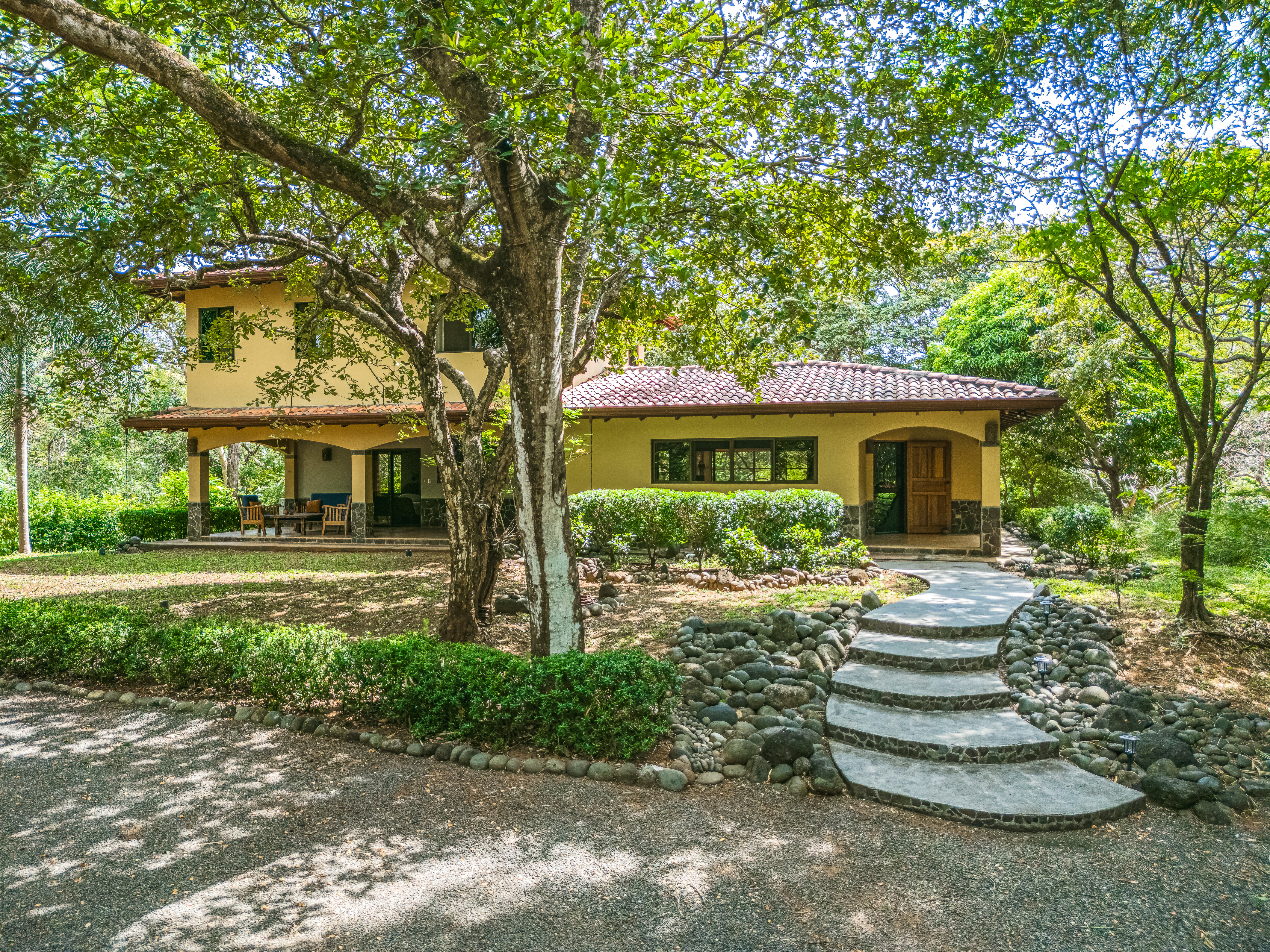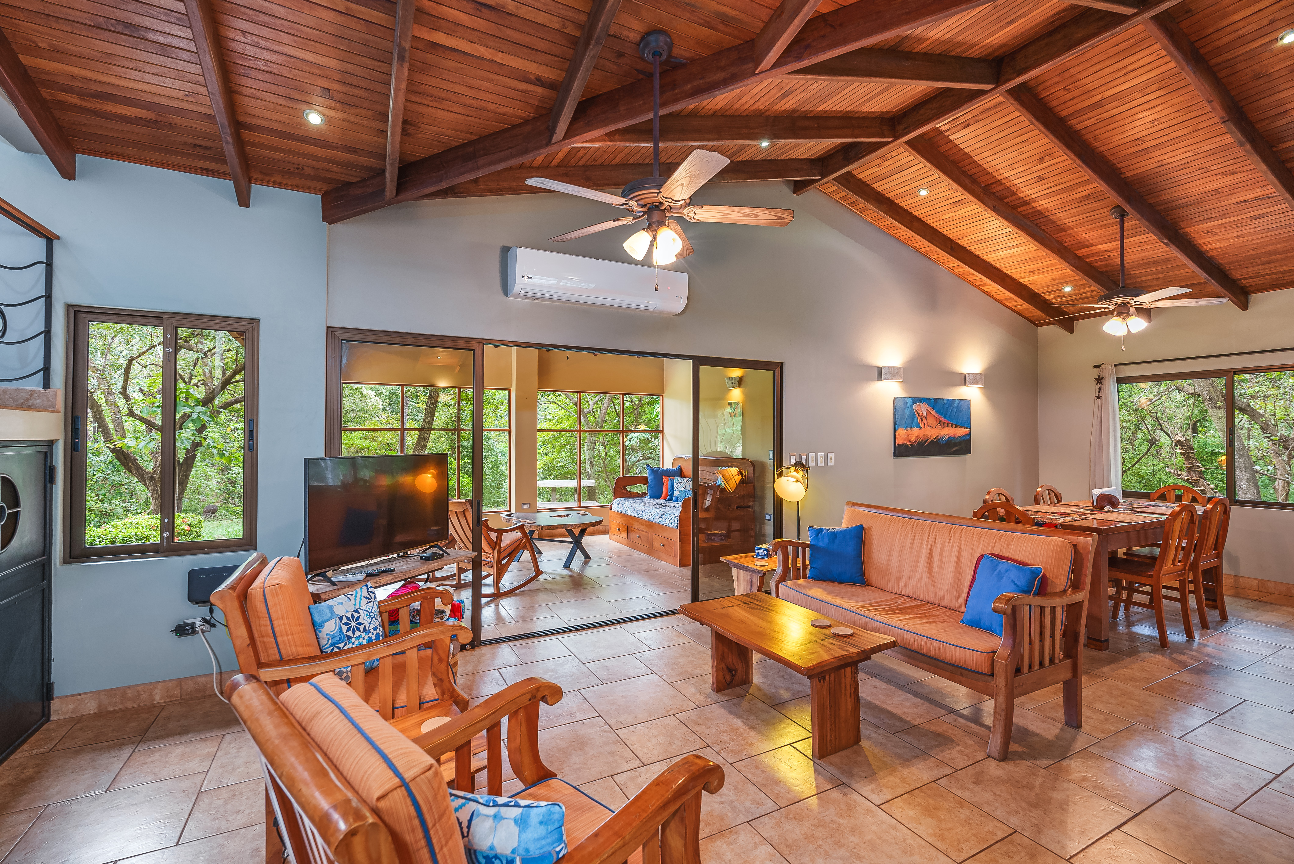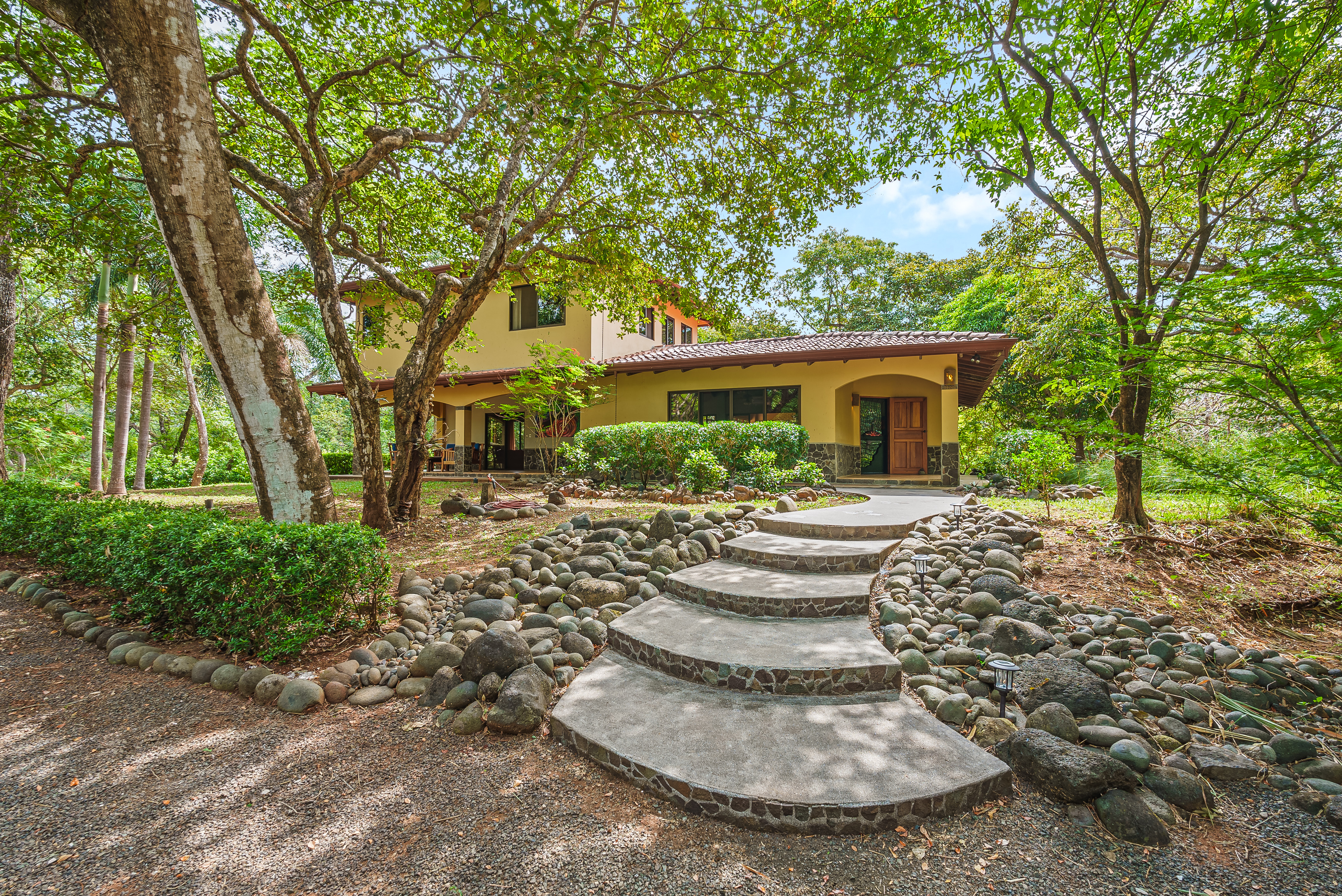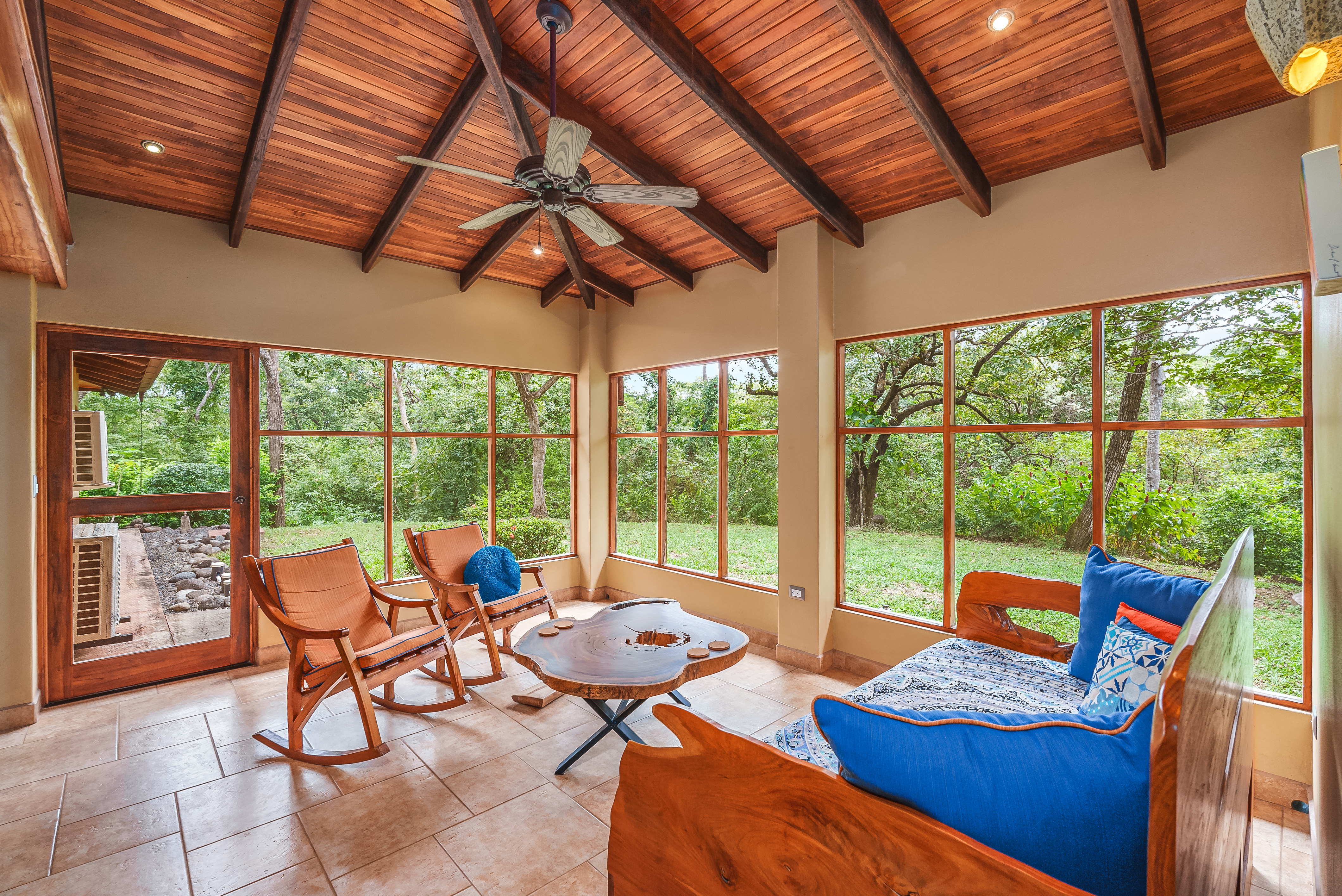 This fully furnished three-bedroom house on two levels features superior materials throughout its 2,500 square feet. Local hardwoods were used for rafters, ceilings, cabinetry, interior doors, and furniture. The flooring is Italian ceramic tile and expansive granite countertops highlight a modern kitchen with a massive island that is perfect for hosting. Decorative wrought iron and stained-glass exterior doors and stair railings add creative form to everyday function adding to the artistic flair of Casa del Bosque.