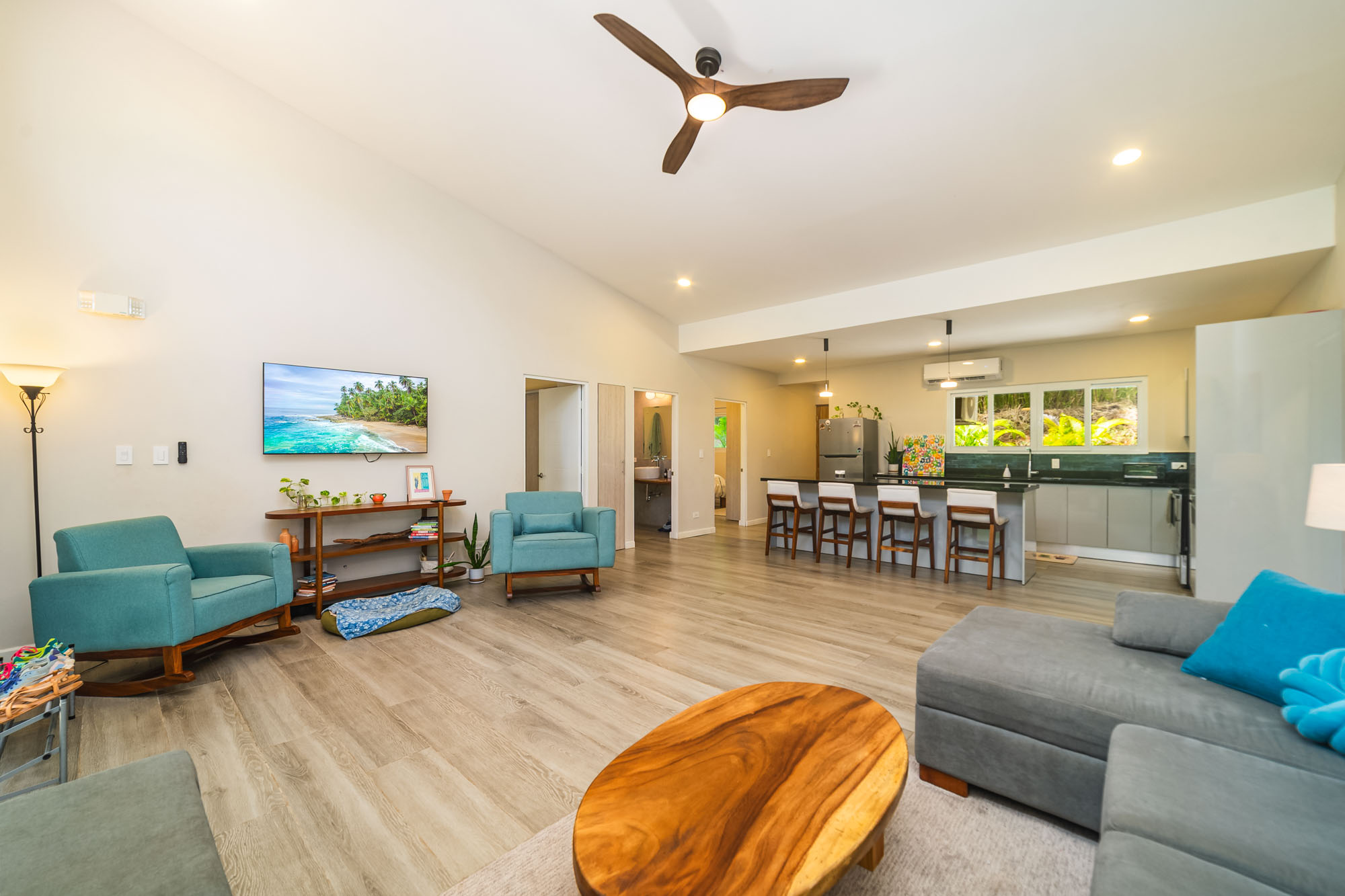 Measuring 1,500 square feet, the home features three bedrooms and two bathrooms, thoughtfully arranged to create a seamless, open living experience. Expansive sliding glass doors connect the main living space with the covered back patio, where the property’s gentle slope opens a panorama of treetops—a perfect setting for morning coffee or evening gatherings.