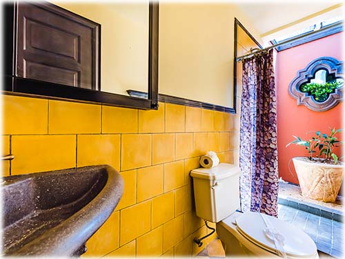 Villa has a very well-thought out layout. The property has a total of 3 bedrooms with ensuite bathrooms plus a half-bathroom that is suited for the living area. On the main level, there is a well-appointed kitchen next to a comfortable living area. Dining is outside, on the covered terrace right next to the pool. Additionally, the main level has a large bedroom with its own bathroom for easy access.On the second level, two bedrooms can be found next to each other with their own private bathrooms. The master bedroom is larger than the other rooms and has a balcony that overlooks the pool terrace area.