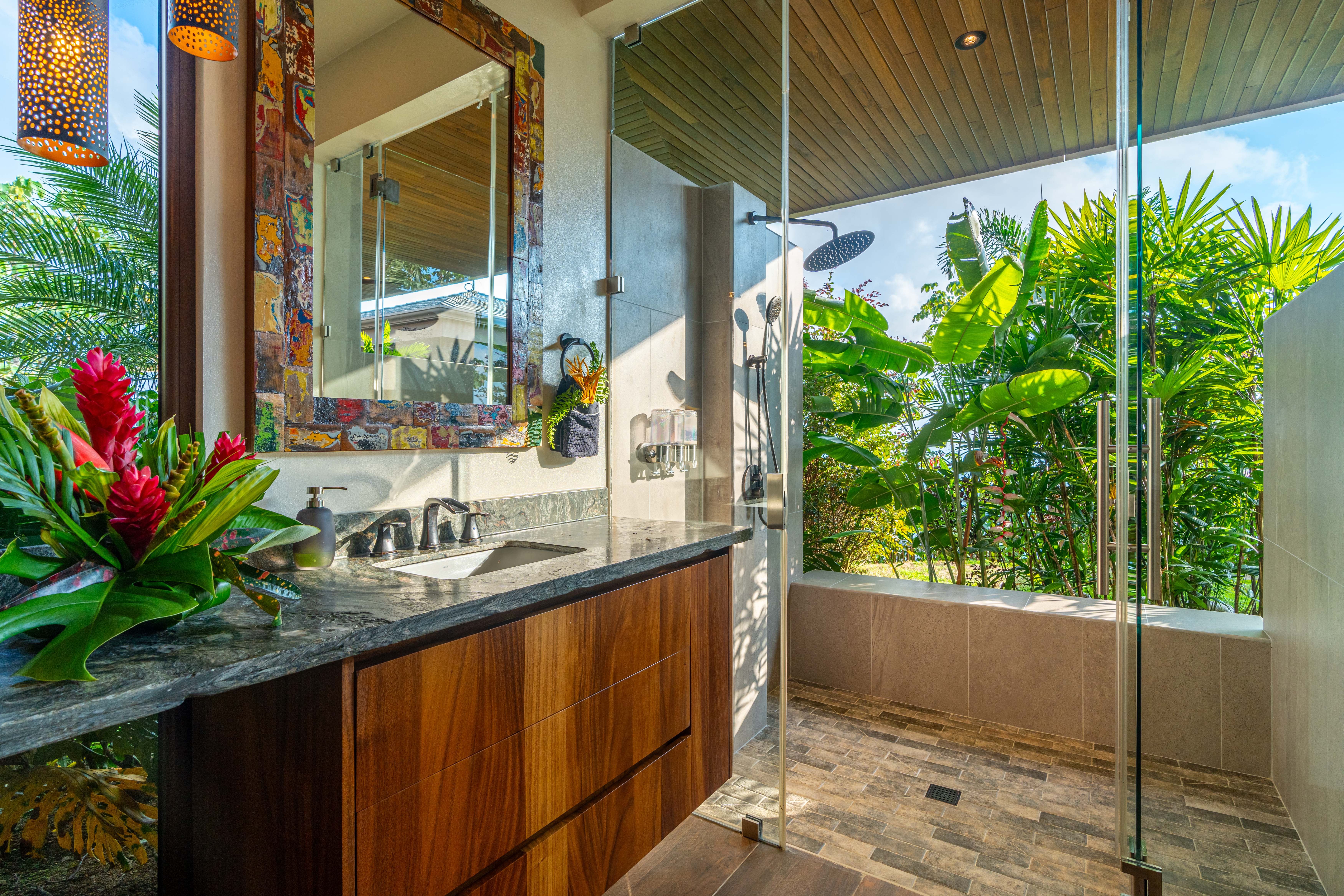 Dual showers & an imported Indonesian stone soaking tub overlooking the mountains.