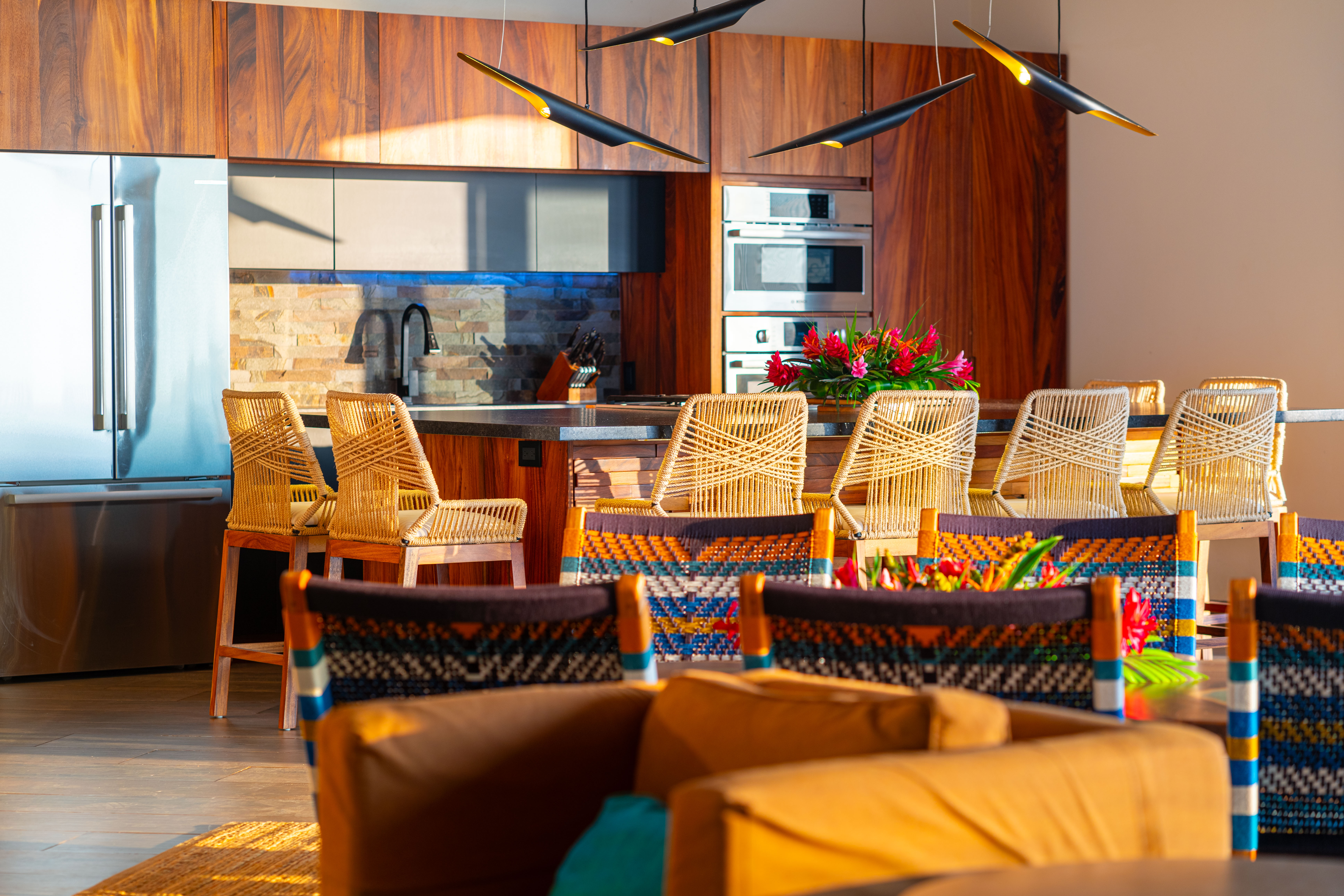 Mango wood dining table & bar with fun barrel-style swing chairs.
