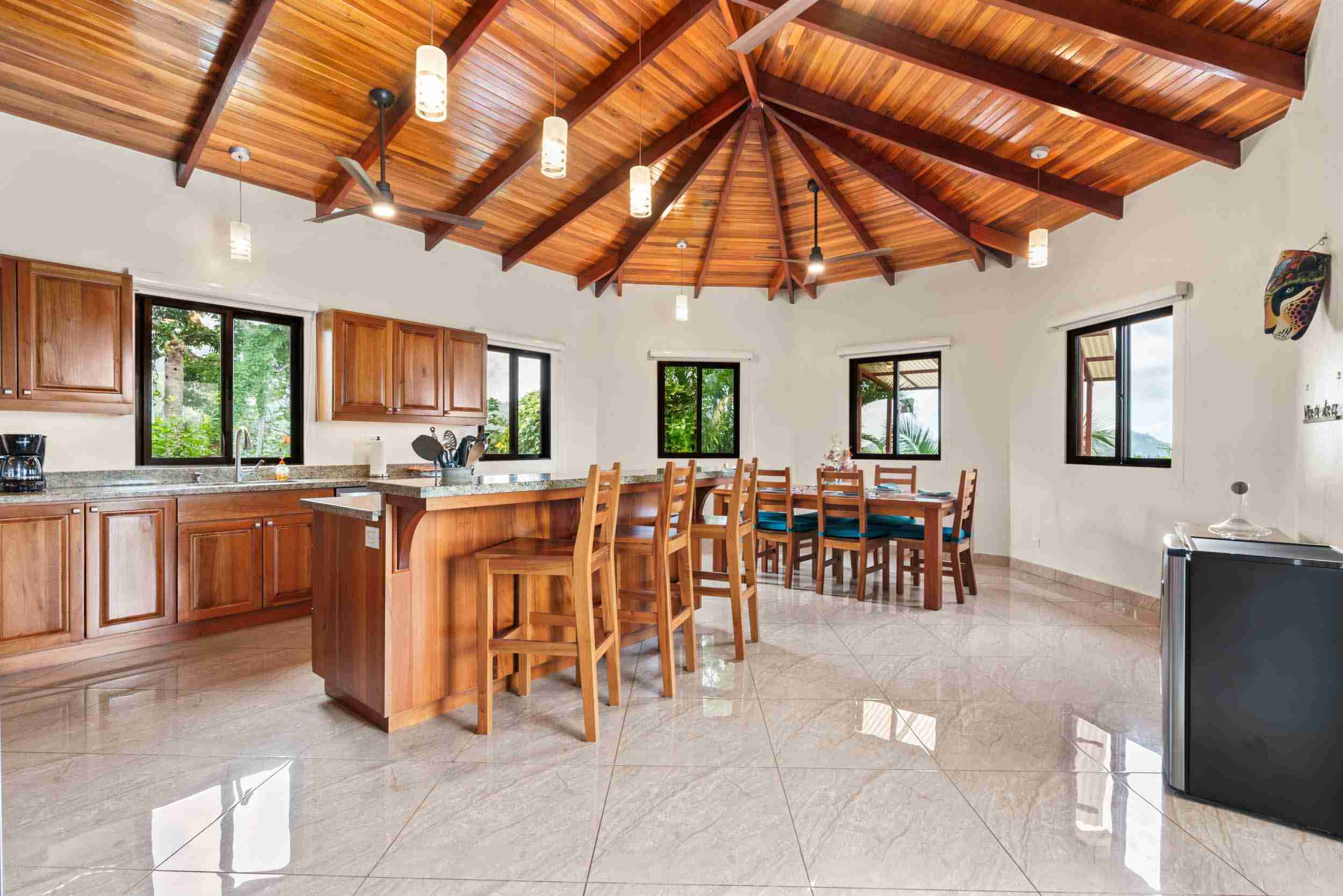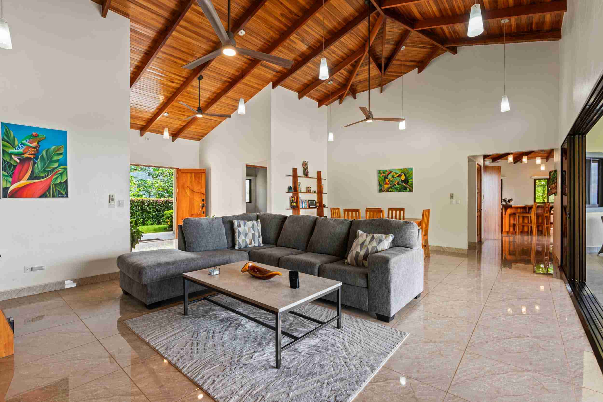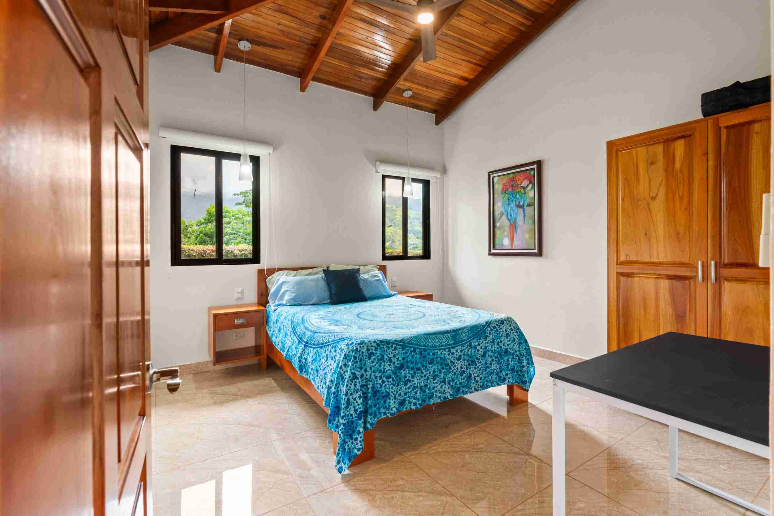 The Home You will immediately notice the high-quality construction and finishes throughout. Step inside and be captivated by the beautiful and airy atmosphere created by the high, local-wood ceilings and solid wood furnishings which bring a bit of Costa Rican class to the interior. The home features 3 spacious bedrooms and 2 full bathrooms. Air conditioning in the master bedroom ensures year-round comfort if you need a little break from a busy day exploring or for your sleeping comfort. One thoughtful feature here in the tropics is the dehumidified master closet and the pantry to keep your clothing and food safe and healthy. The home also includes a solar panel system that provides a big reduction in your electrical bill, paying dividends to your pocketbook every month.