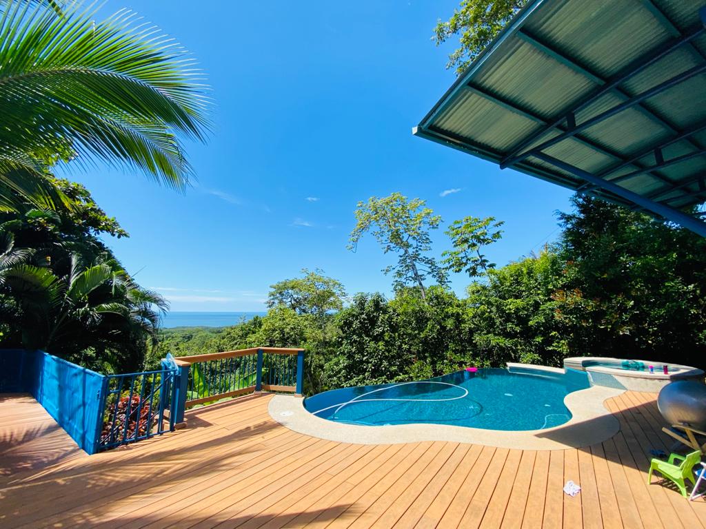 Casa Ostional is an open living ocean & mountain view estate home on over 2.5 acres of property. Beautiful mature gardens surround the home with native plants, limes, star fruit, coconut and banana trees. Relax in the ocean view infinity edge pool or jacuzzi spa in the afternoon watching the sun set in the Pacific. There are 2 spacious bedrooms and an extra loft with plenty of room to sleep over 8 people. The home has great reviews on VRBO and rents in the high season for $350/night. The home is a short 10 minute drive to Playa Ostional an excellent surfing beach and one of the most famous beaches for Olive Ridley turtle nesting grounds. To the north the same distance is Playa San Juanillo a small local marina and fishing village with great local restaurants and offshore fishing.
