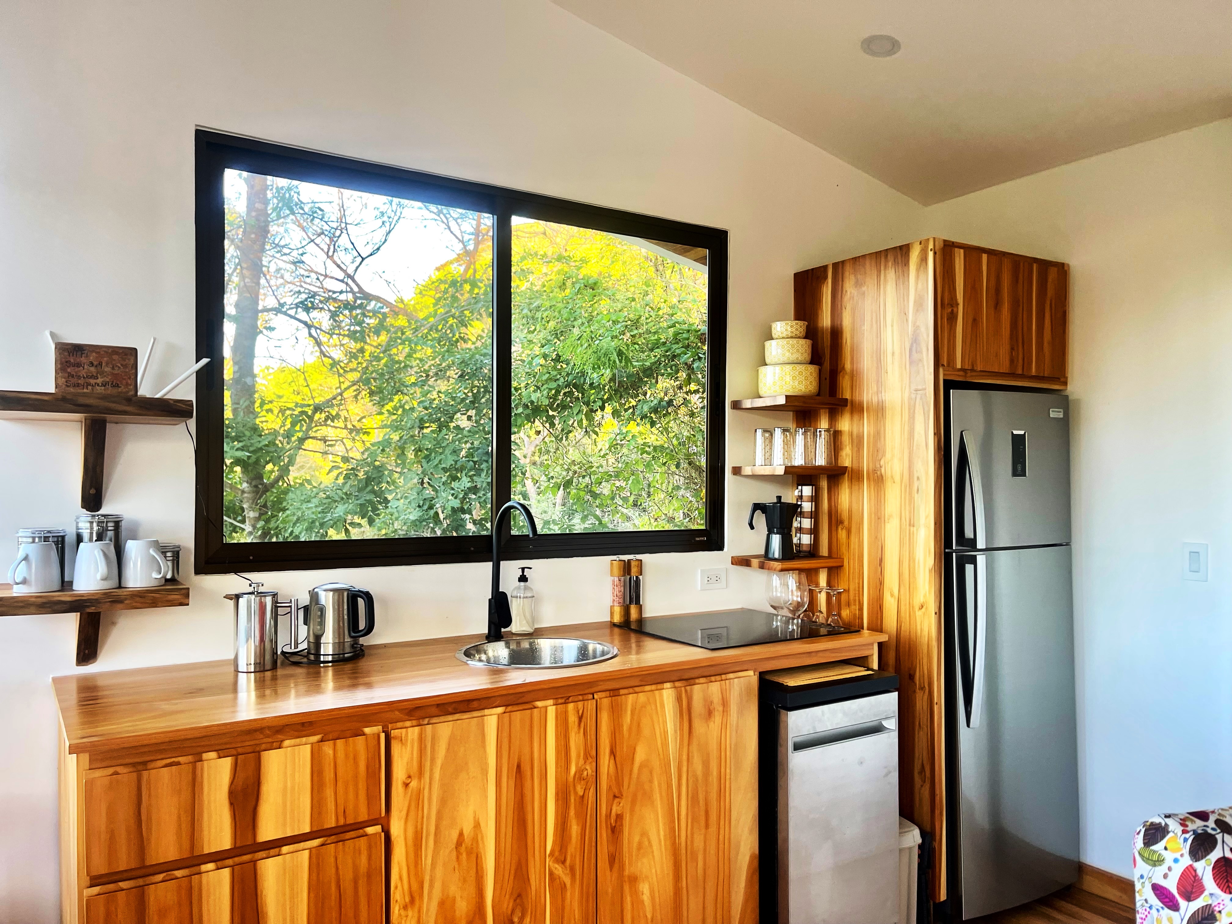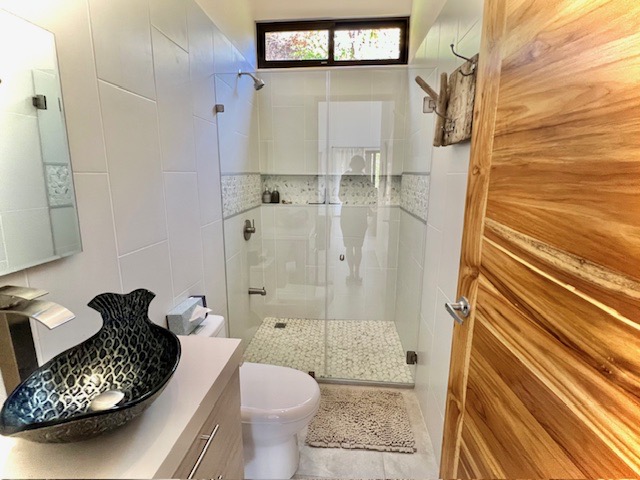 The second home is set above the main house. It is a large one-room bungalow and bathroom, bright and cheery, with high ceilings and seamless glass windows bringing the outdoors inside, 624sf. A large veranda borders the room providing unobstructed views of the jungle valley and hills. This, too, is cooled with A/C, fans and the high ceilings. A large bathroom, custom tiled, with an indoor/outdoor shower, compliments the grandeur of this bungalow. Everything one needs for a complete well-stocked kitchen is found here as well.