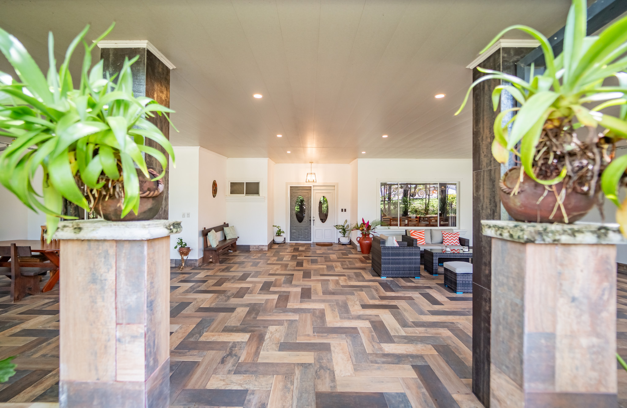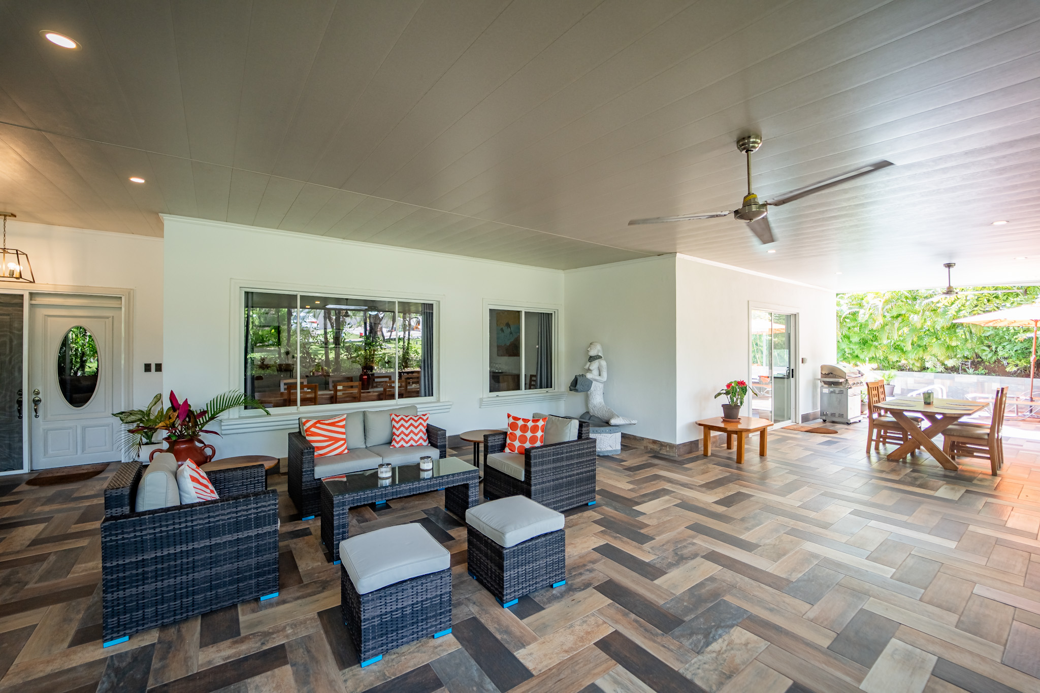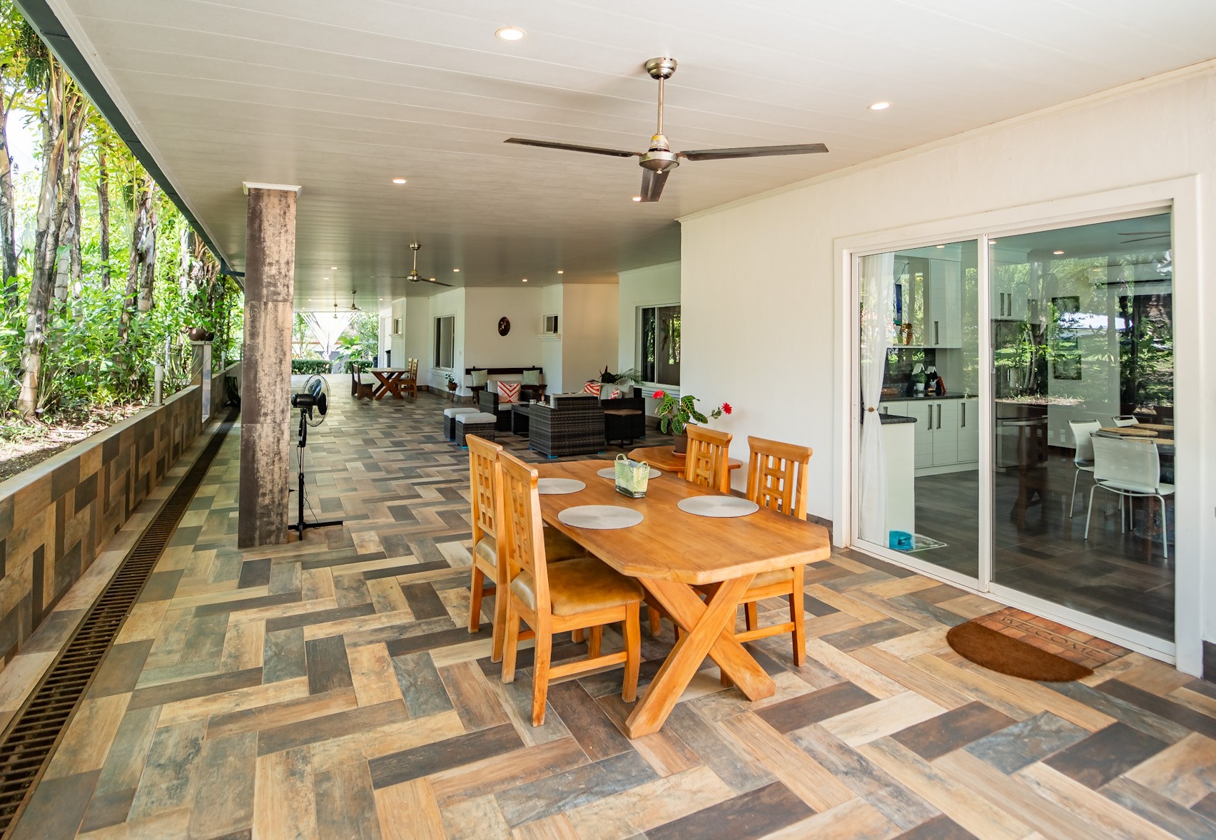 A highlight of the property is a covered patio that stretches the length of the house, doubling the living space and providing the perfect setting for enjoying the lush landscaping. It leads directly to additional patio areas on the side of the house, surrounding the private pool and dining area.