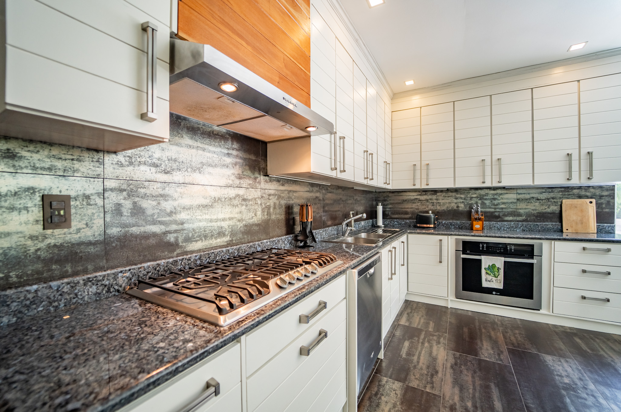 Stepping into the house, you’ll find a spacious living and dining area, plus a powder room with plenty of room for guests. The kitchen is a chef’s dream, with top-of-the-line appliances, ample counter space, and beautiful cabinetry lining the space. Just off the kitchen is a large utility room that provides room for additional storage.