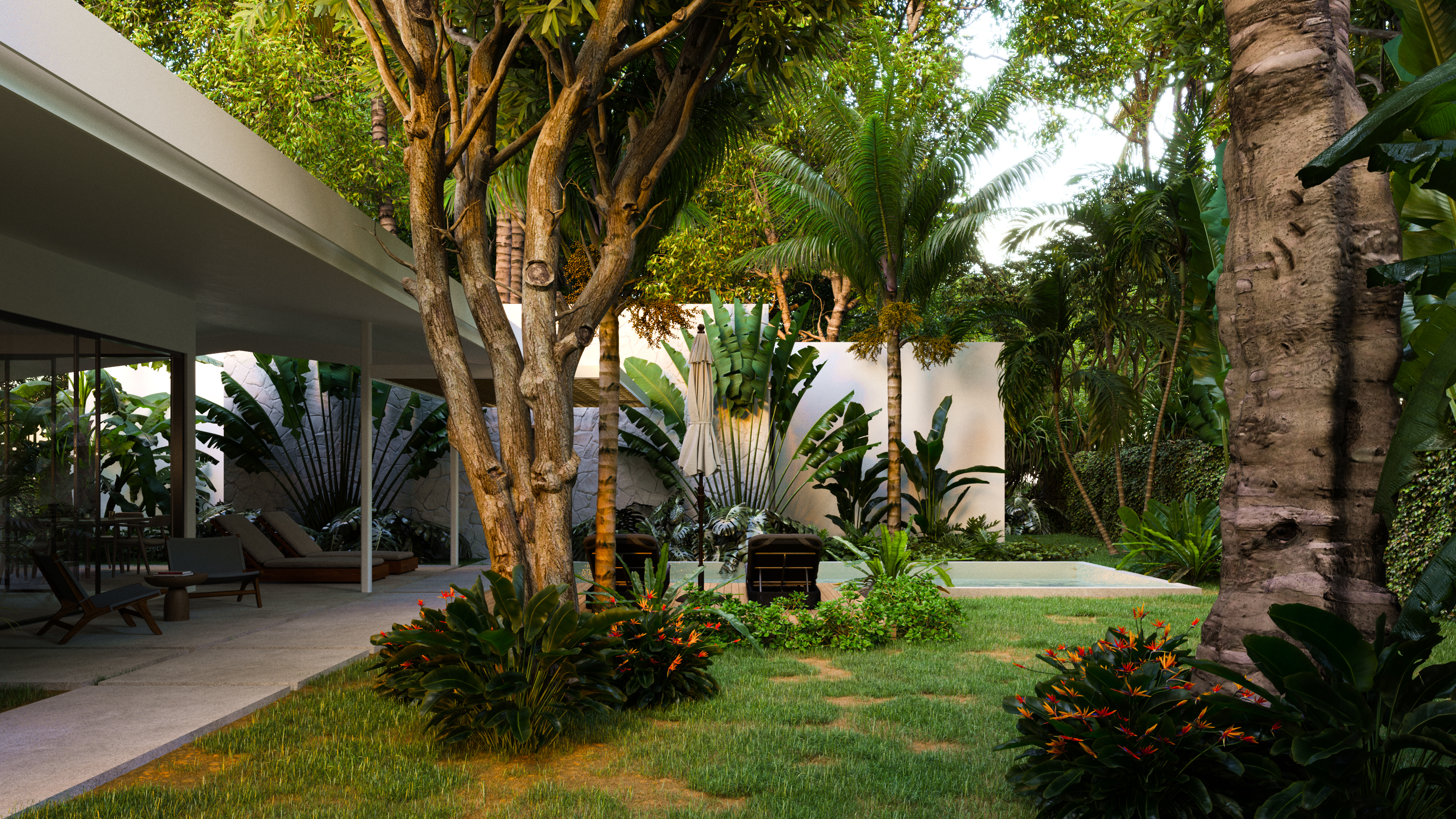 The property features three bedrooms and three and a half bathrooms, along with a separate guest house that can be used for visitors, rental income, or a private office. The layout emphasizes comfort and flow, with open living, dining, and kitchen areas that connect effortlessly to multiple covered terraces. A private pool and sun deck anchor the outdoor living spaces, creating an ideal setting for entertaining or relaxing in the tropical climate.