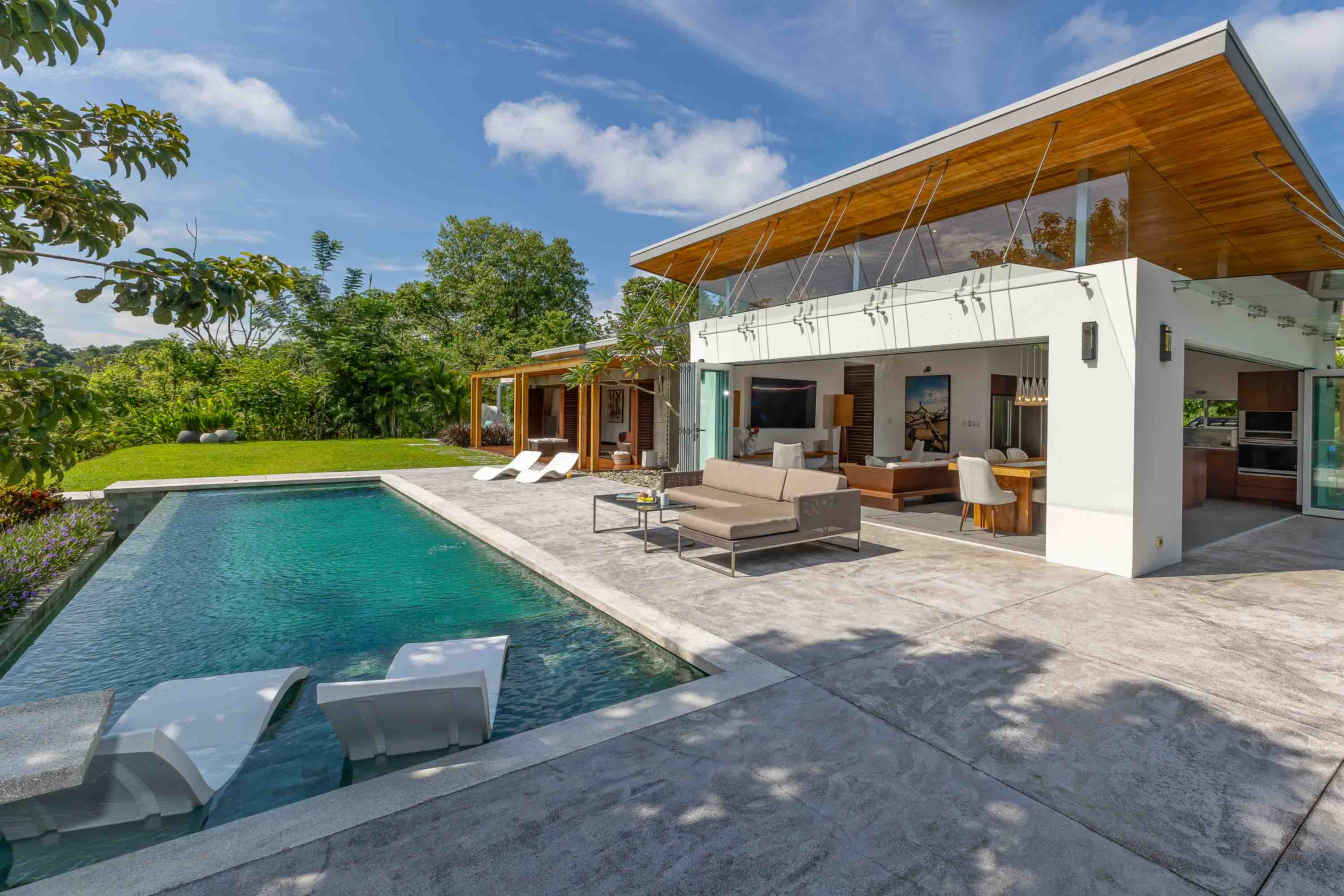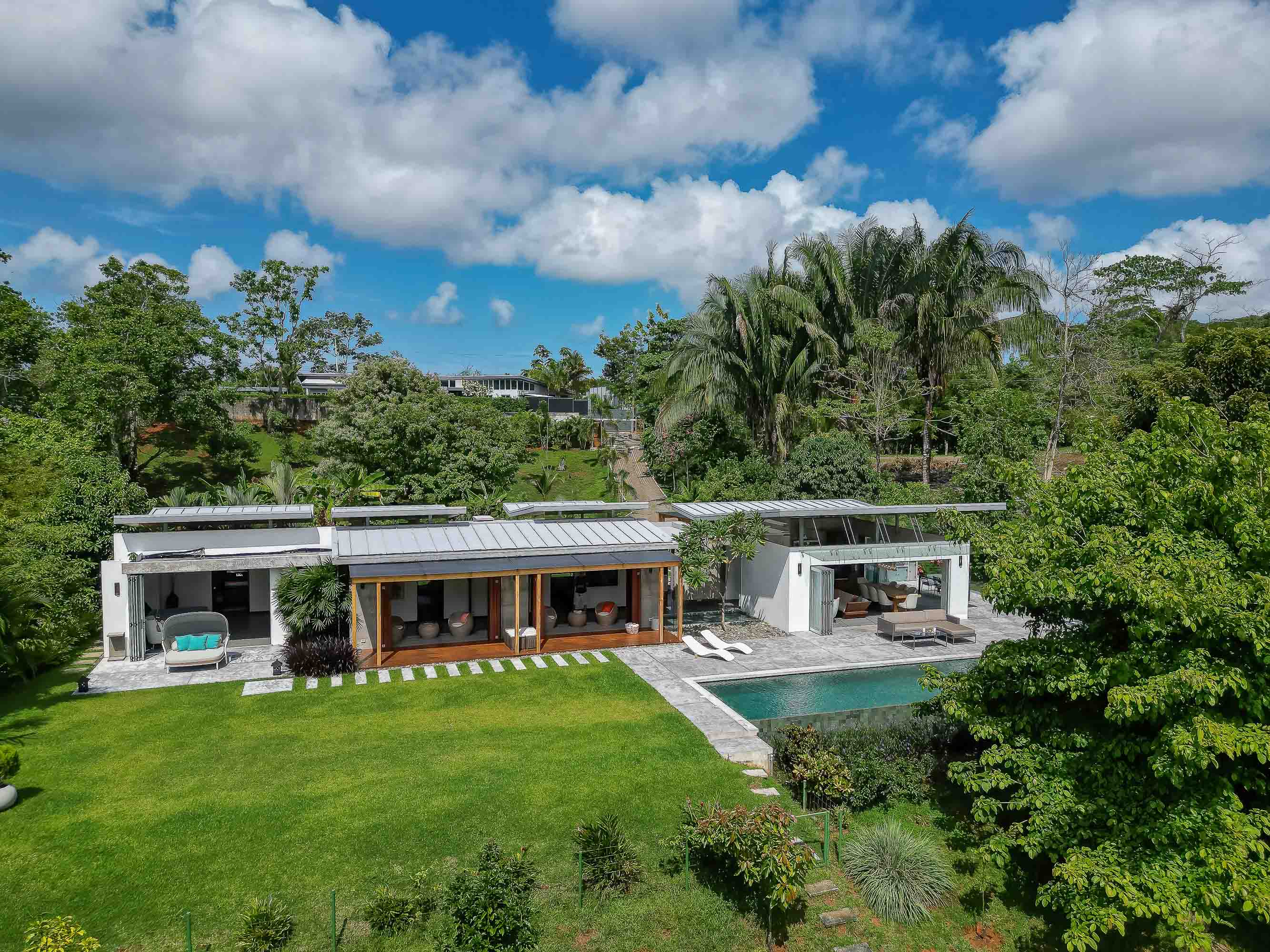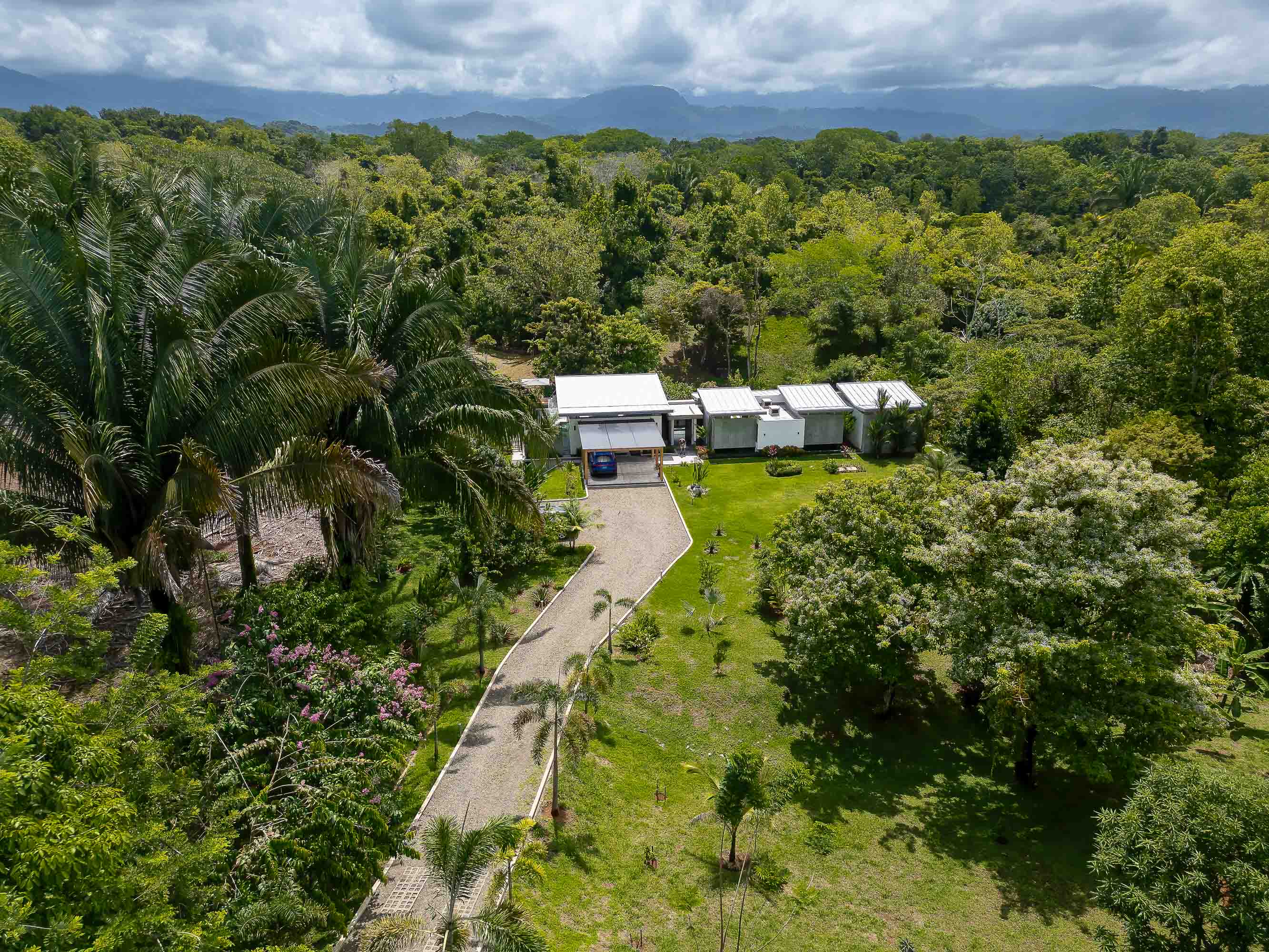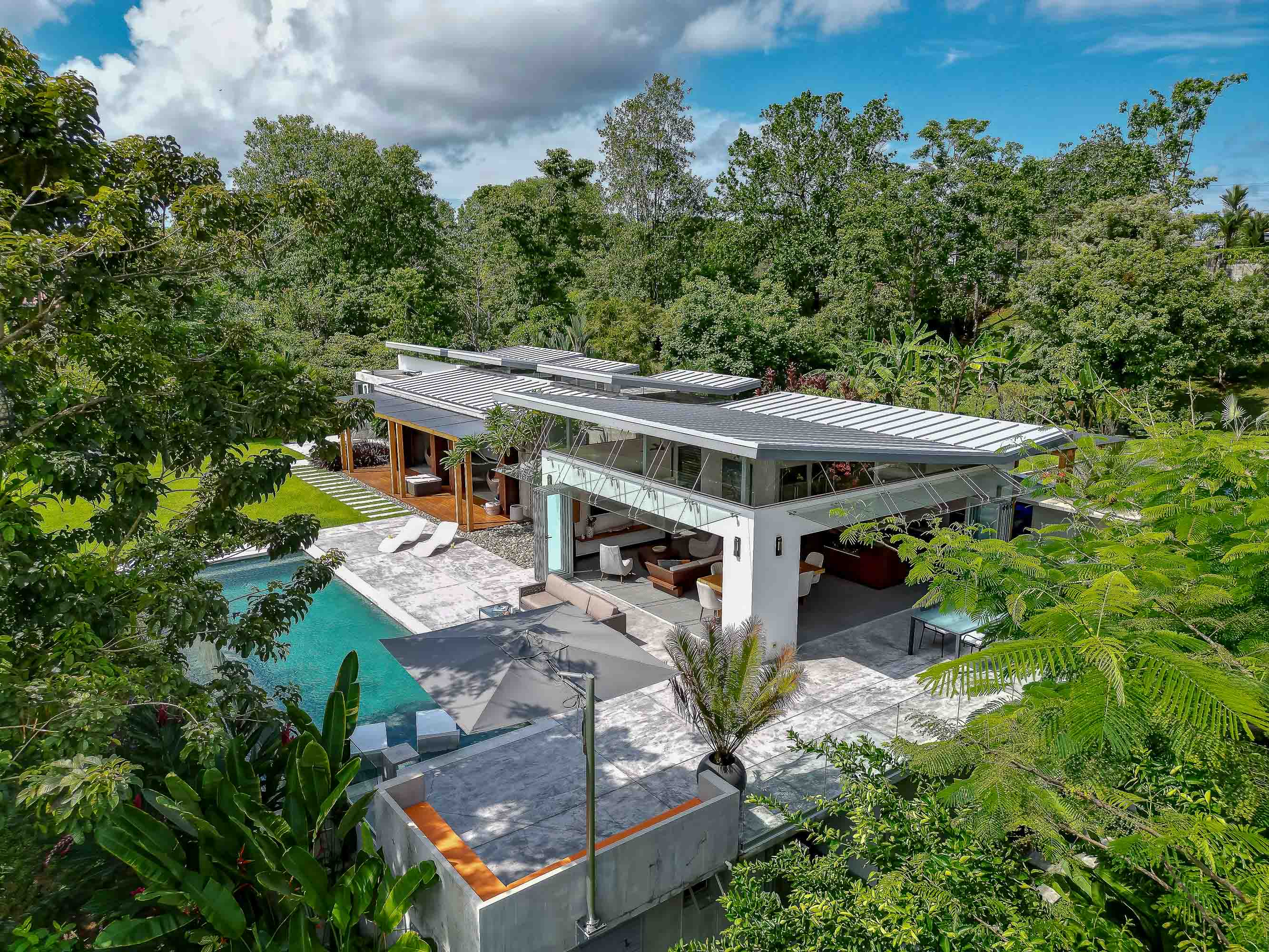 This one-level, modern luxury home is located only 10 minutes from the Marina Pez Vela in Quepos and 15 minutes from the world class beaches of Manuel Antonio. The approximately 1.5-acre property is fully fenced, and gated, and has a long internal driveway, friendly rolling topography, a dog run, mature landscaping, and beautiful mountain views. The grounds have mature fruit trees and afford plenty of additional space for further construction of additional dwellings for guests, a family compound, rental purposes, or even the creation of a wellness retreat center if desired.