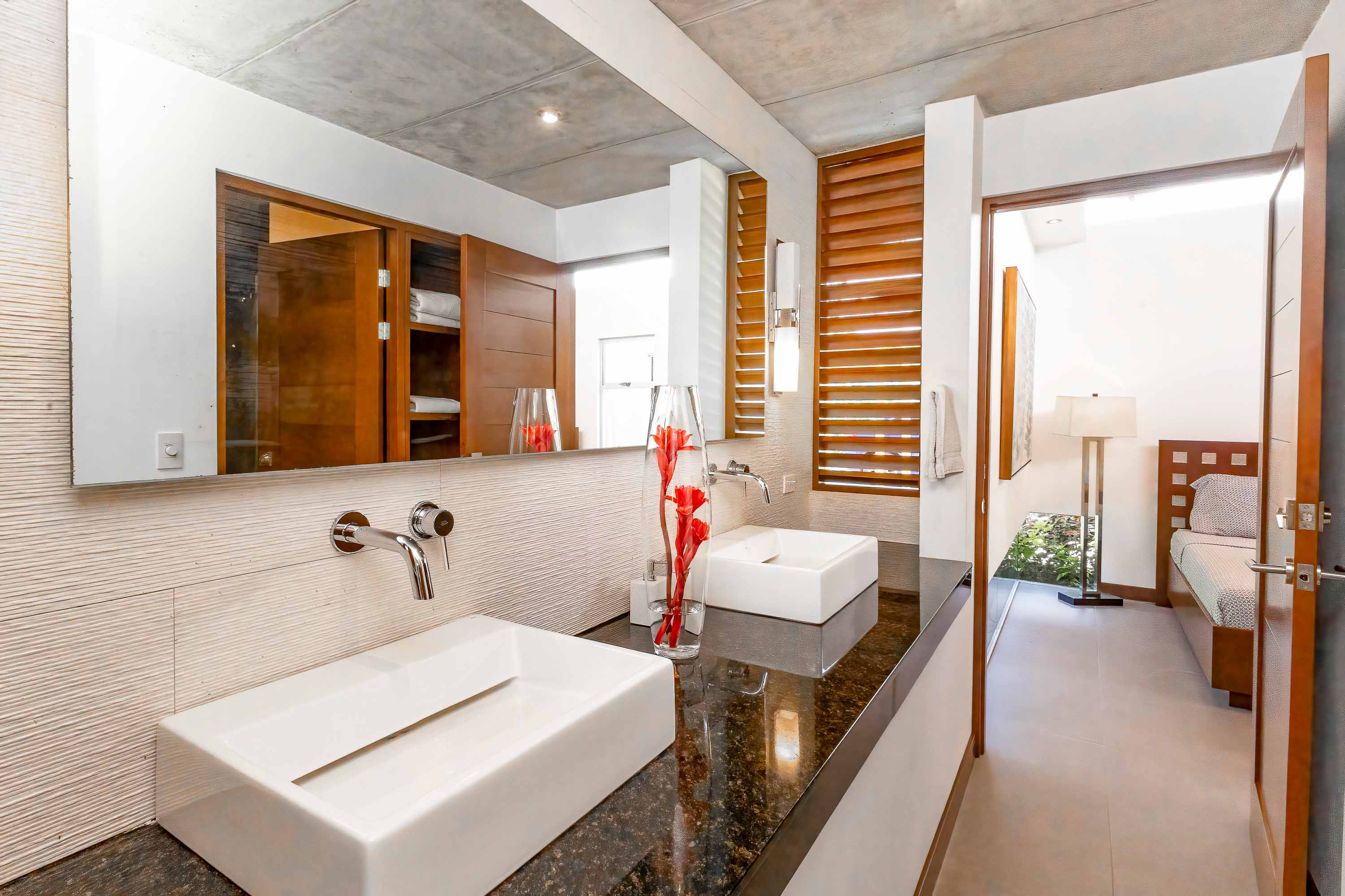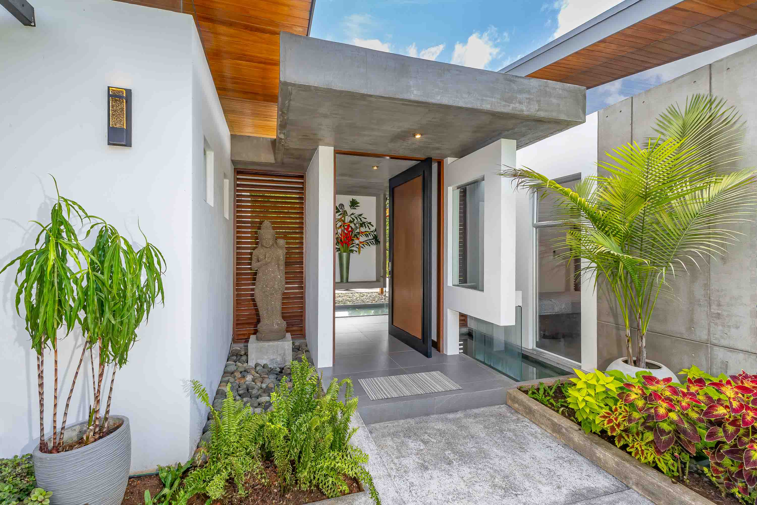 The gated estate is thoughtfully designed with high ceilings, a flowing floor plan, a beautiful kitchen, and great room area (which opens to the pool), generous outdoor spaces, two guest bedrooms, and a third master bedroom. There is also an outdoor kitchen / BBQ area beside the indoor kitchen and is adjacent to the lap pool area. There is a level below the pool deck with a bonus room currently being used as a gym but could also be a fourth bedroom if needed. An attached, two-car carport is located adjacent to the main entry, and there are at least four overflow parking spaces within the gates. The home's design and aesthetics are immaculately executed and very pleasing to the eye. High quality doors and windows, first class hardware, beautiful hardwoods, and exotic natural stones elements are featured throughout. The design, decor, views, and gardens generate a feeling of peace and serenity.