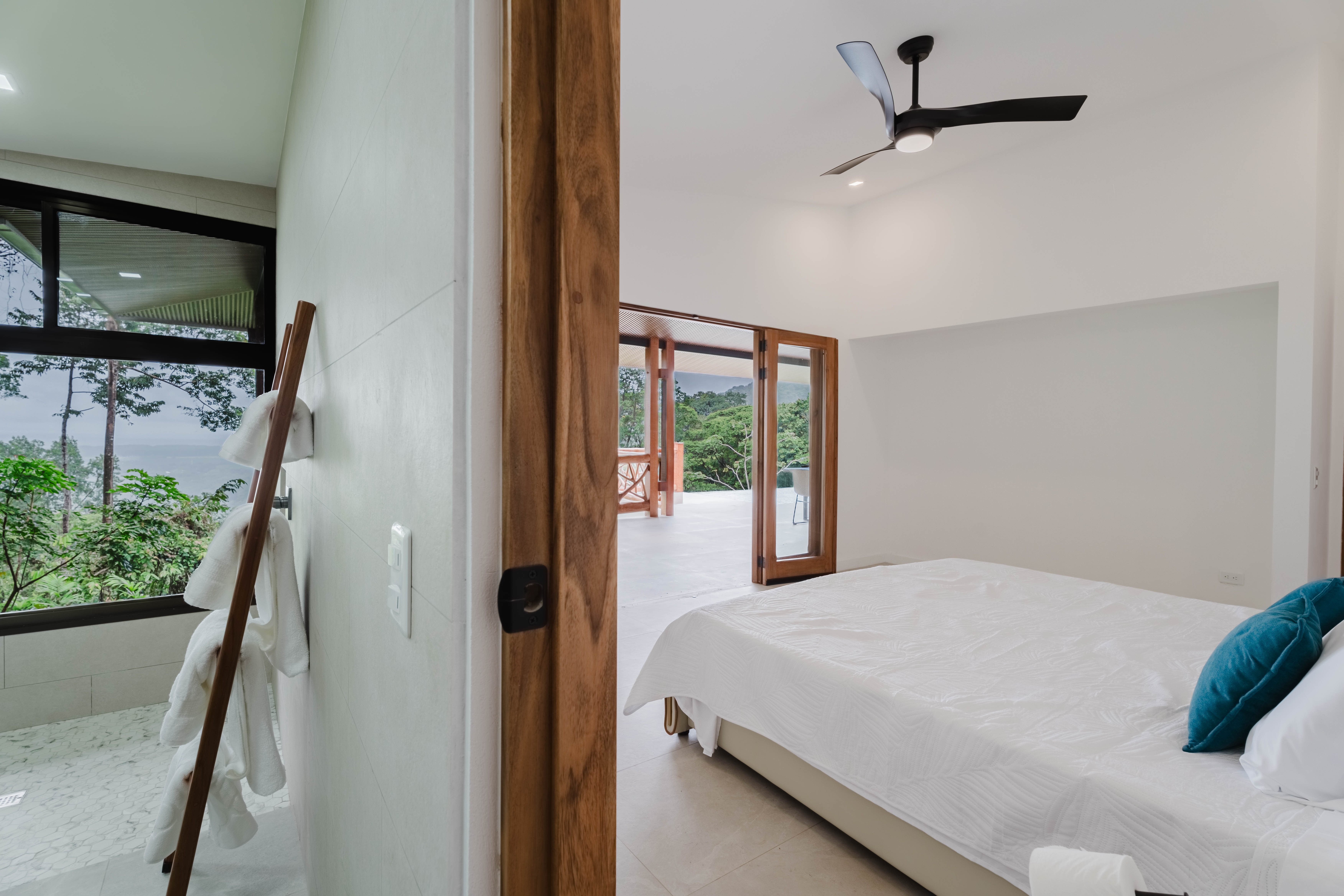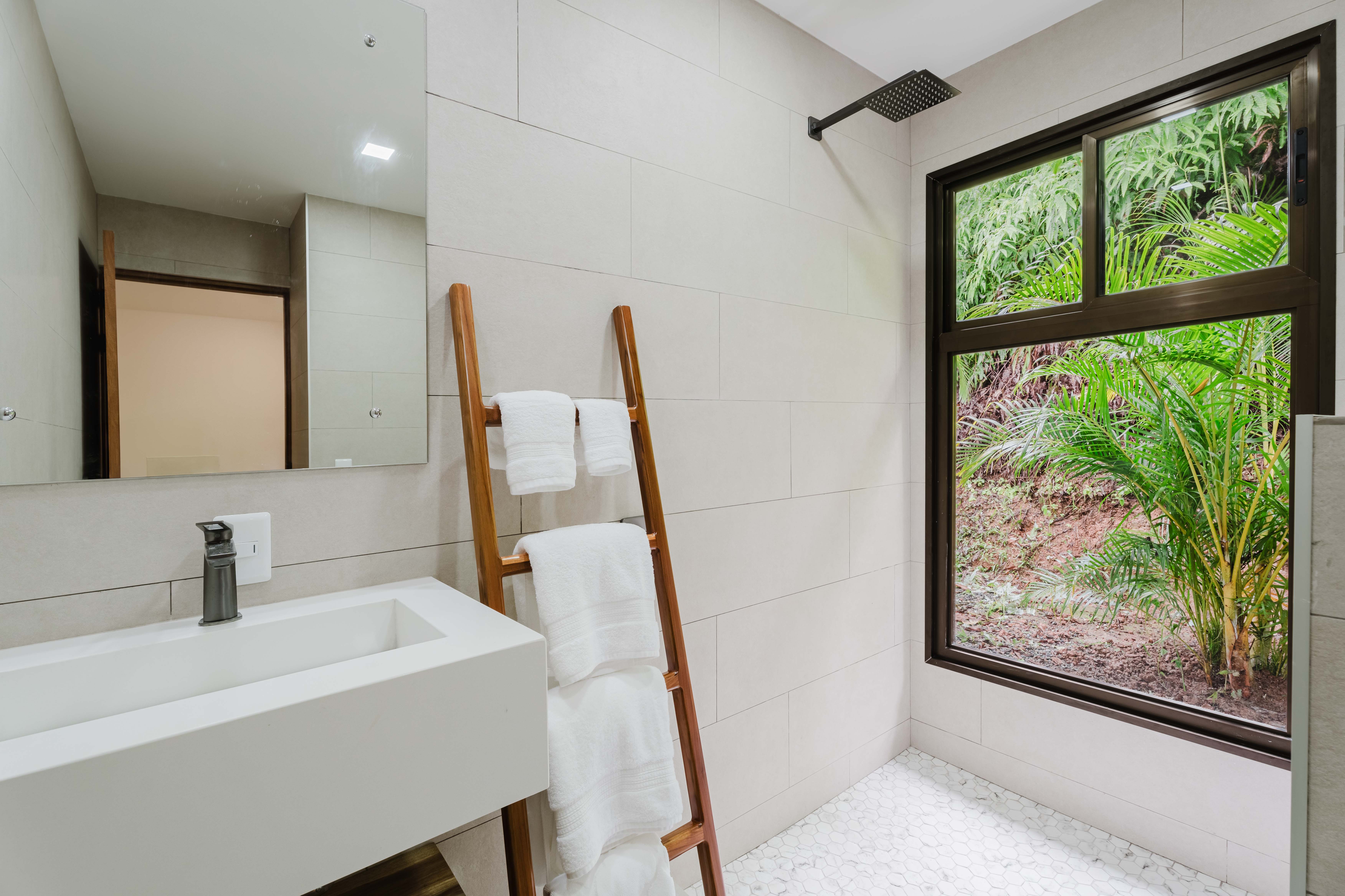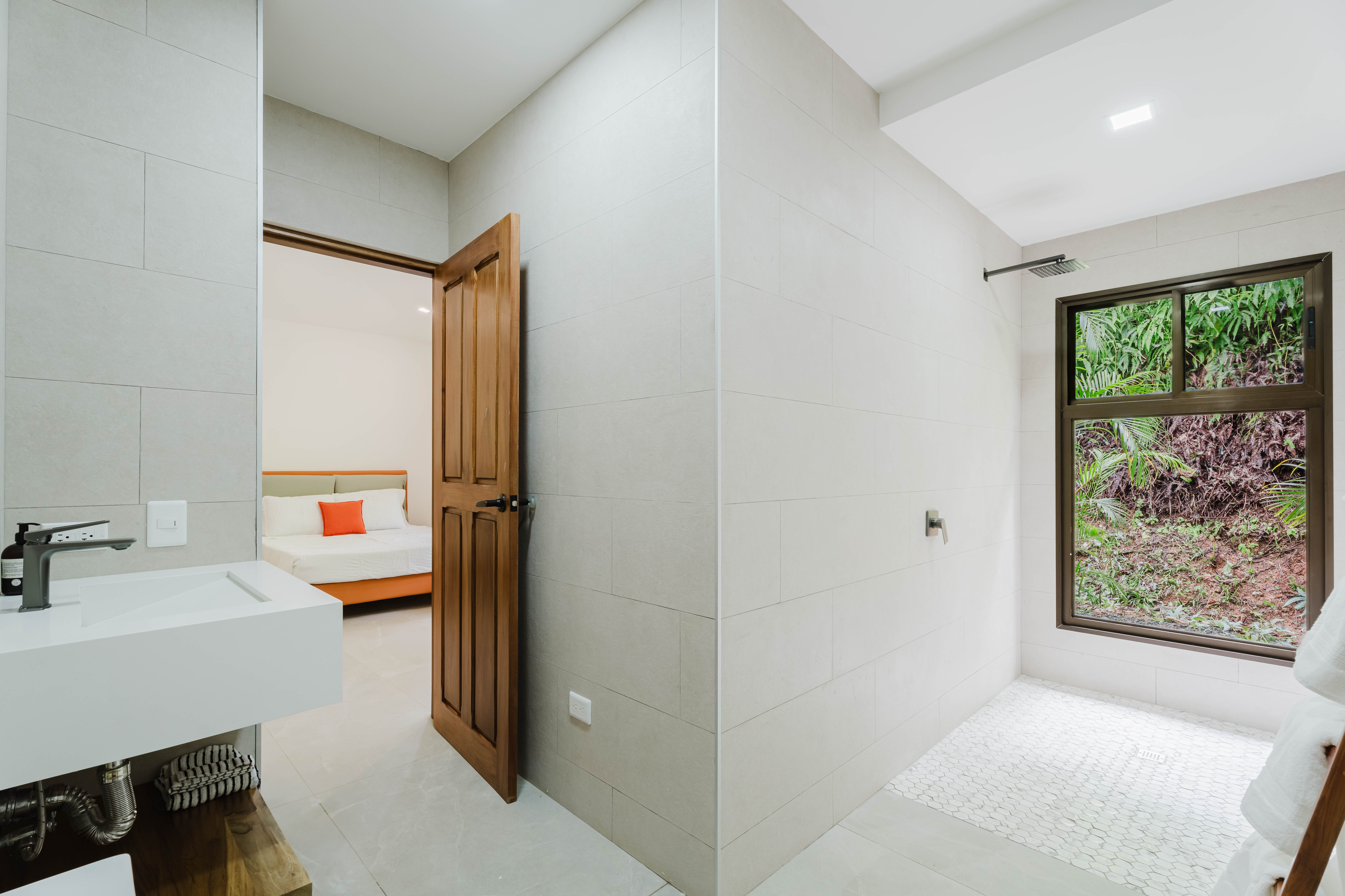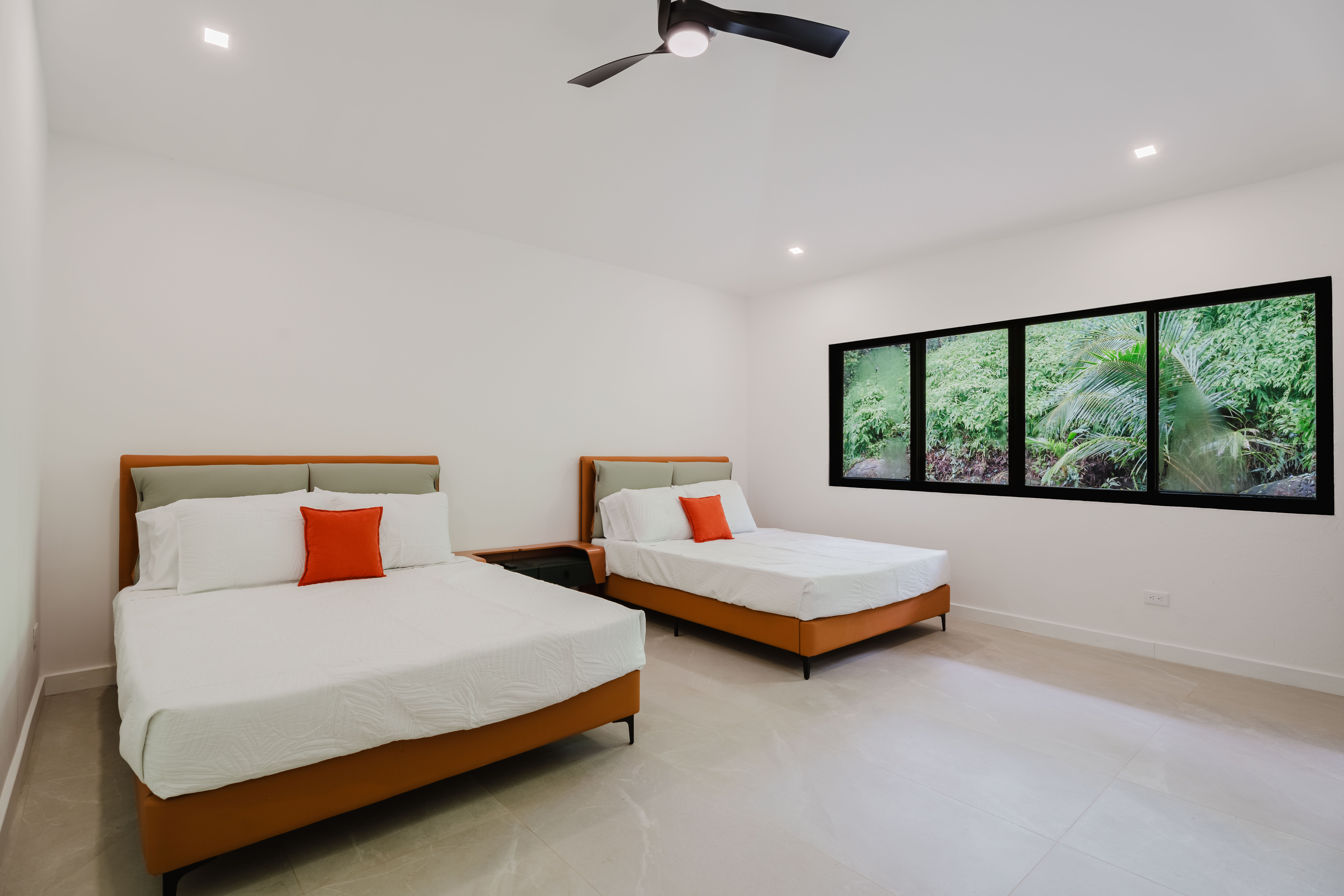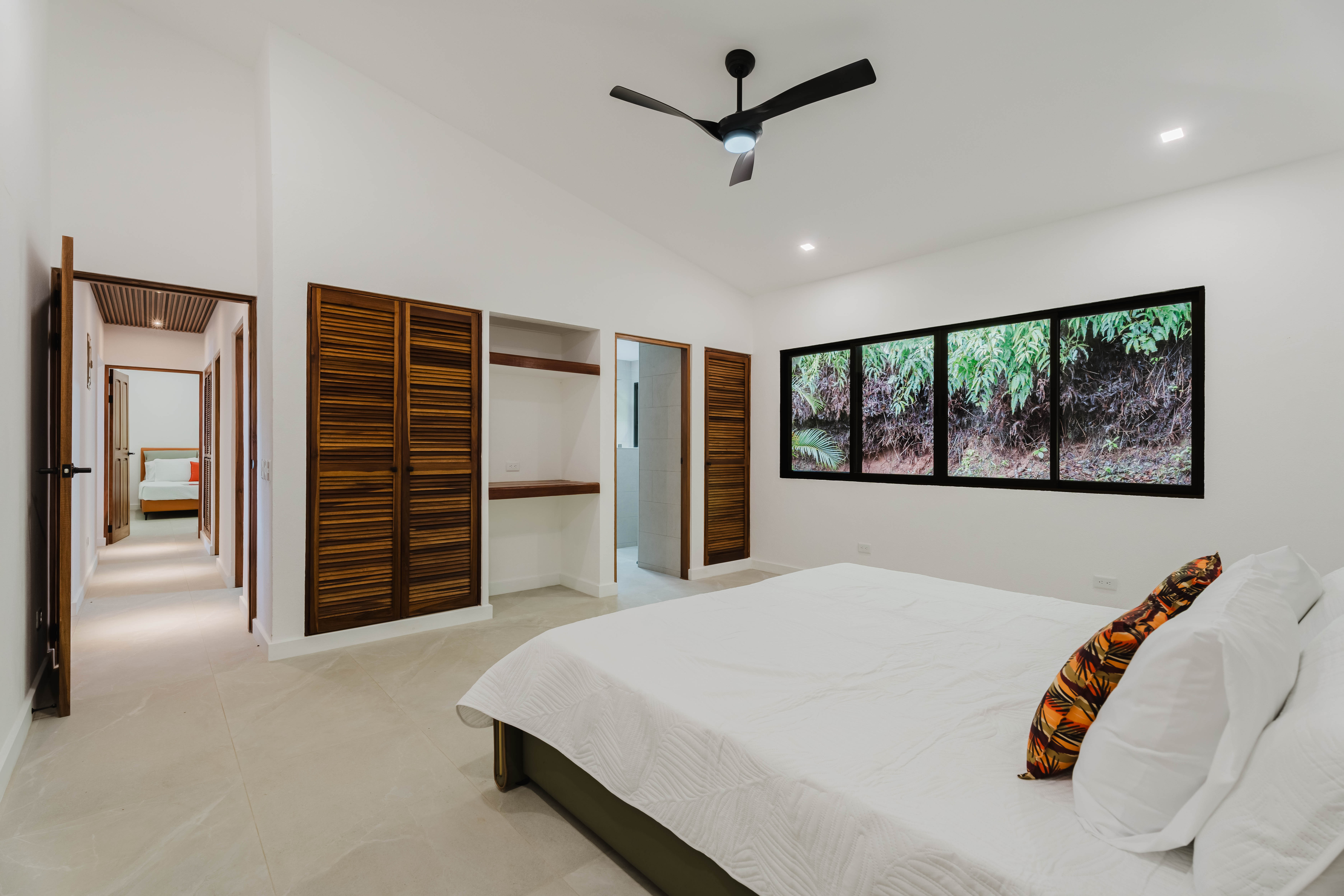 The Master bedroom sits on the front side of the villa with a king size designer bed set and opens out to the large balcony with ocean views and has its own ensuite bathroom with built in dual vanity courtz sinks and countertops with a rain shower that overlooks the ocean and jungle landscape. The additional two bedrooms reside on the back of the villa with jungle views. One of the bedrooms features a king size bed with an ensuite bathroom servings as a secondary Master Bedroom, while the third bedroom features two queen size bed and a dual-access ensuite bathroom.