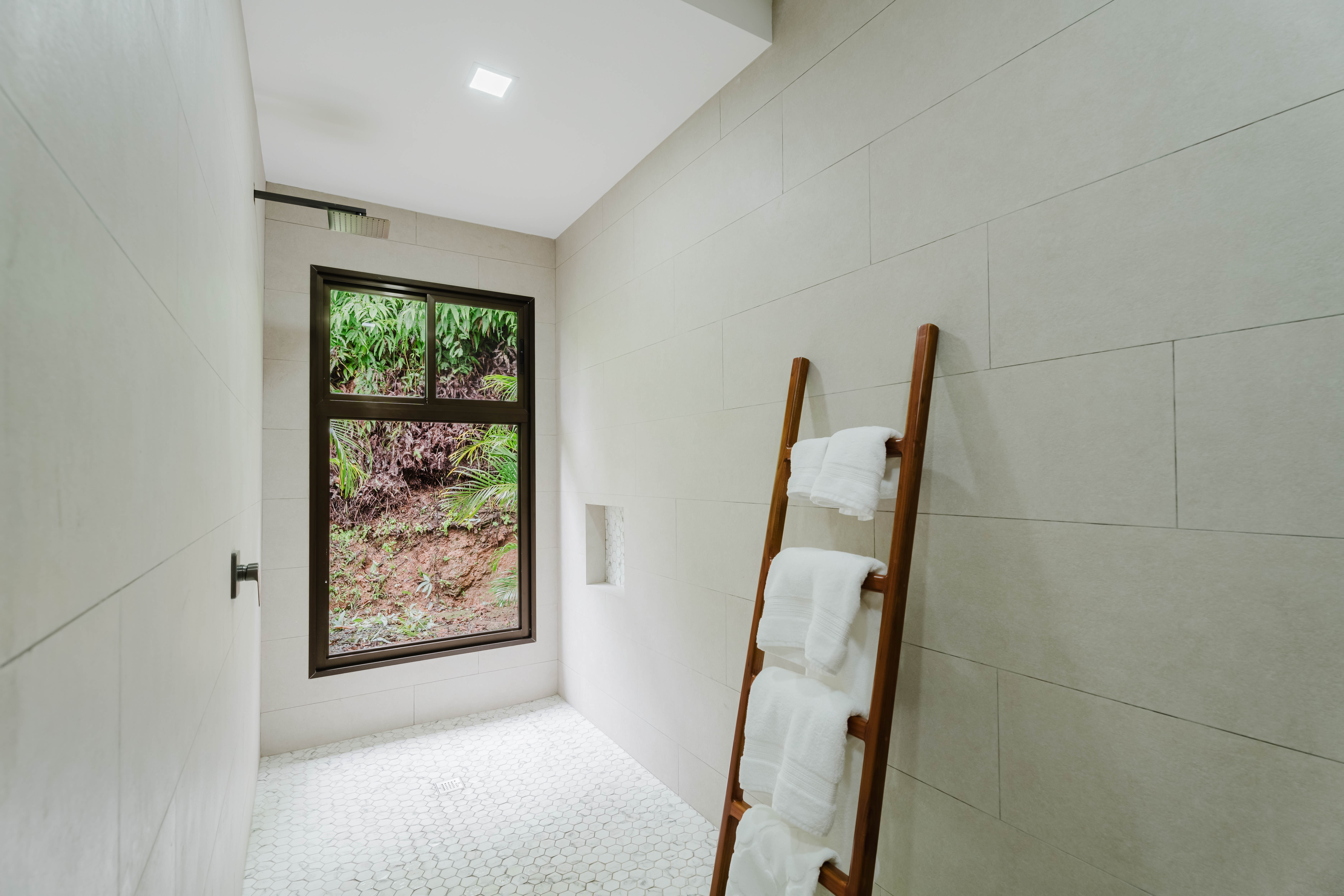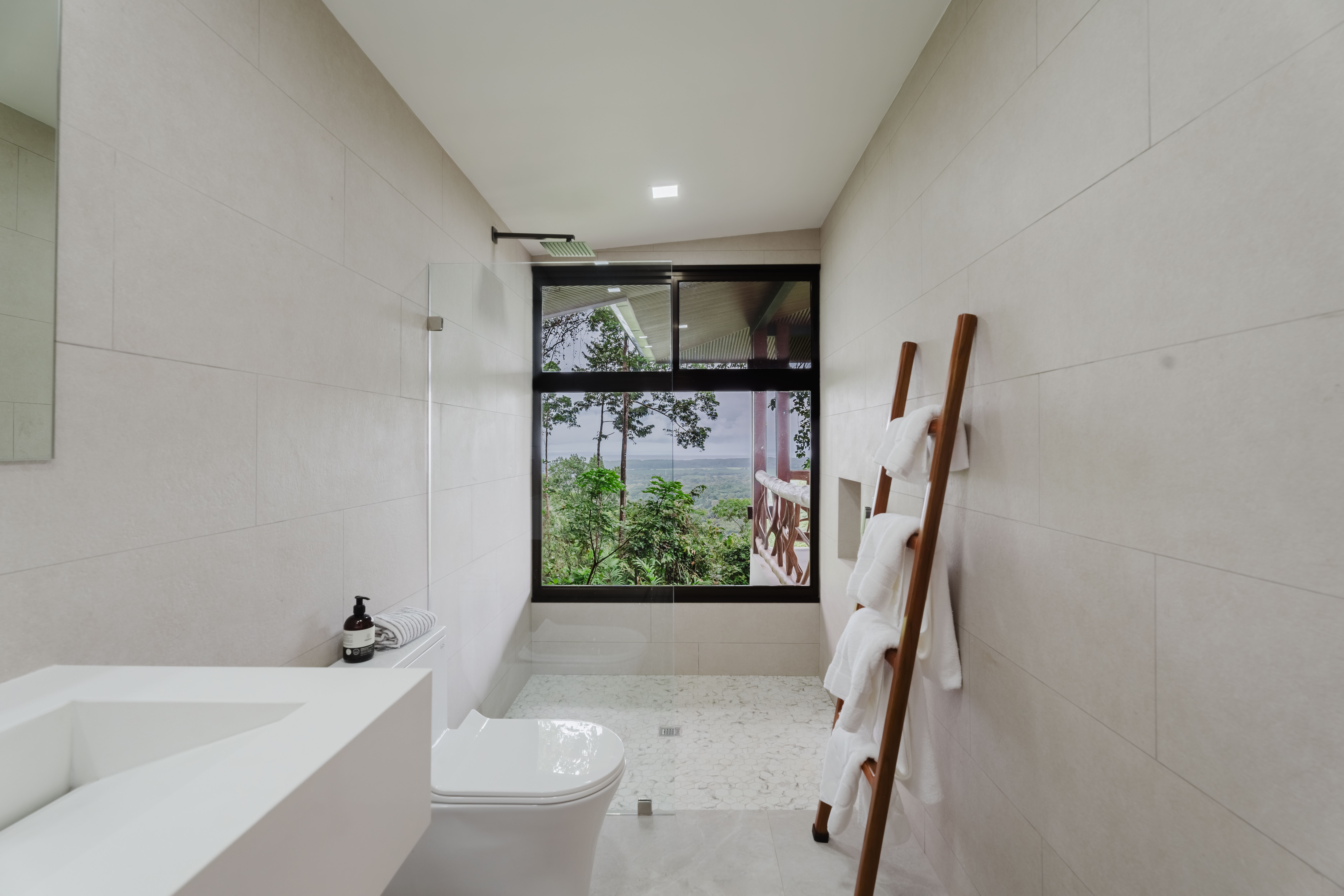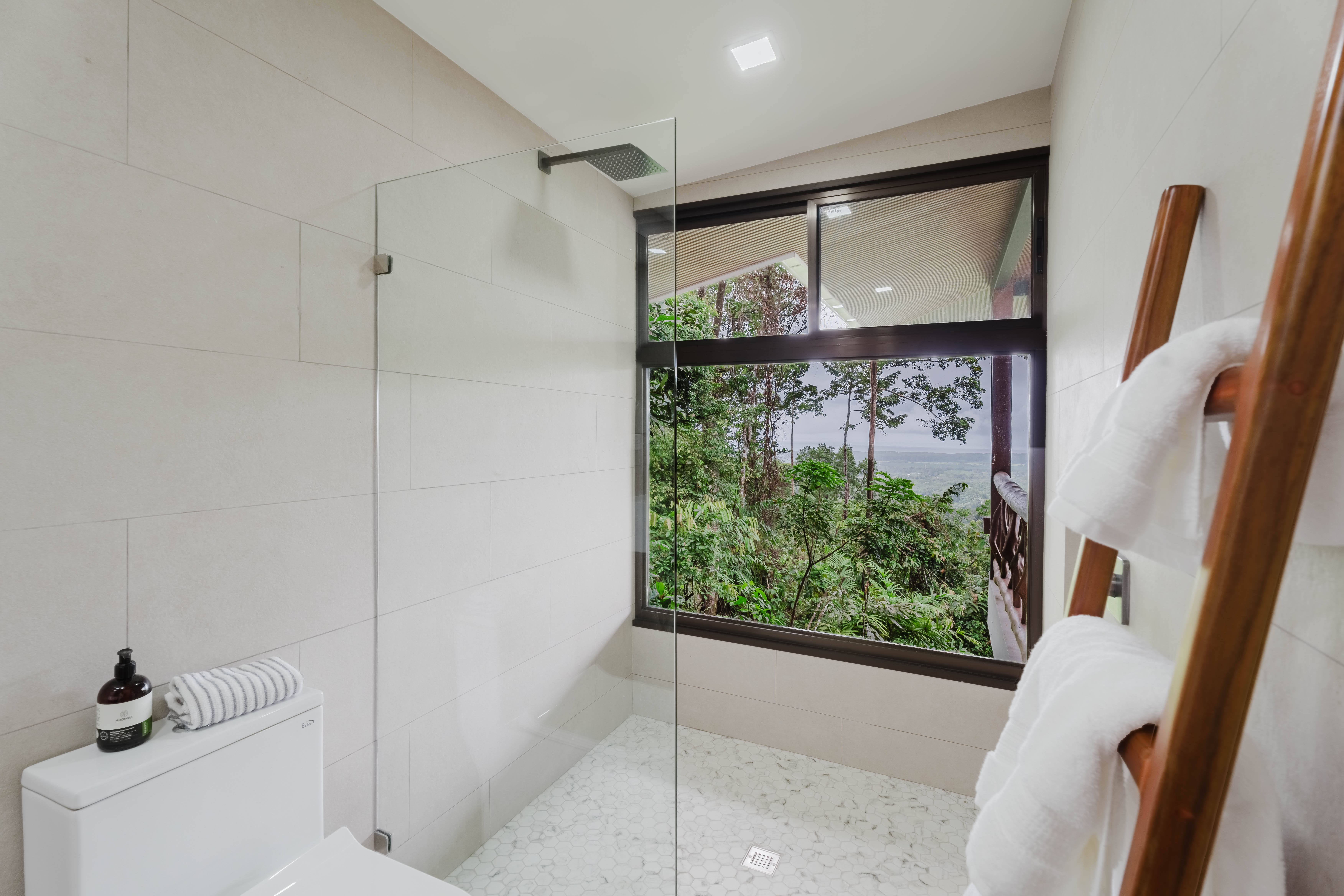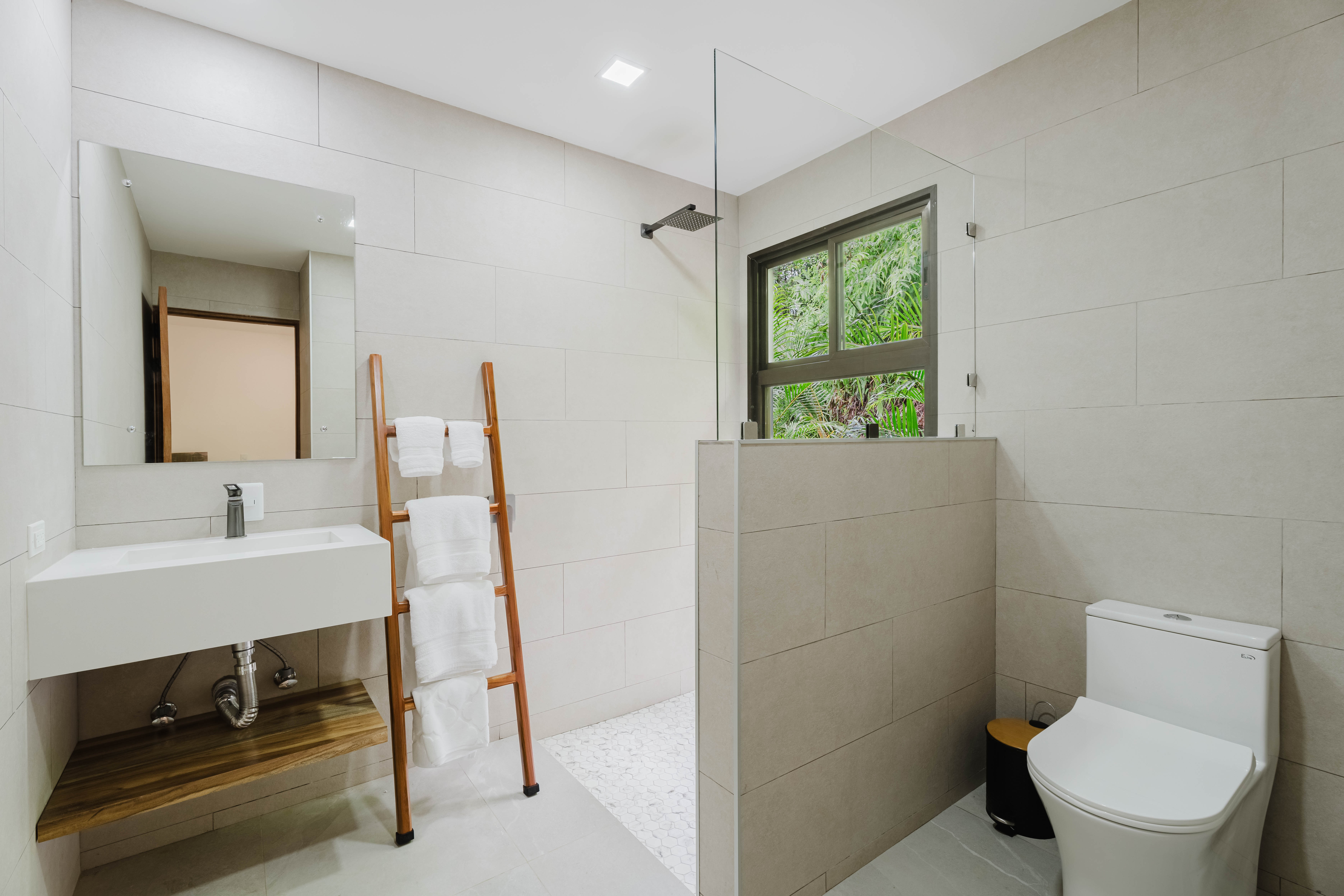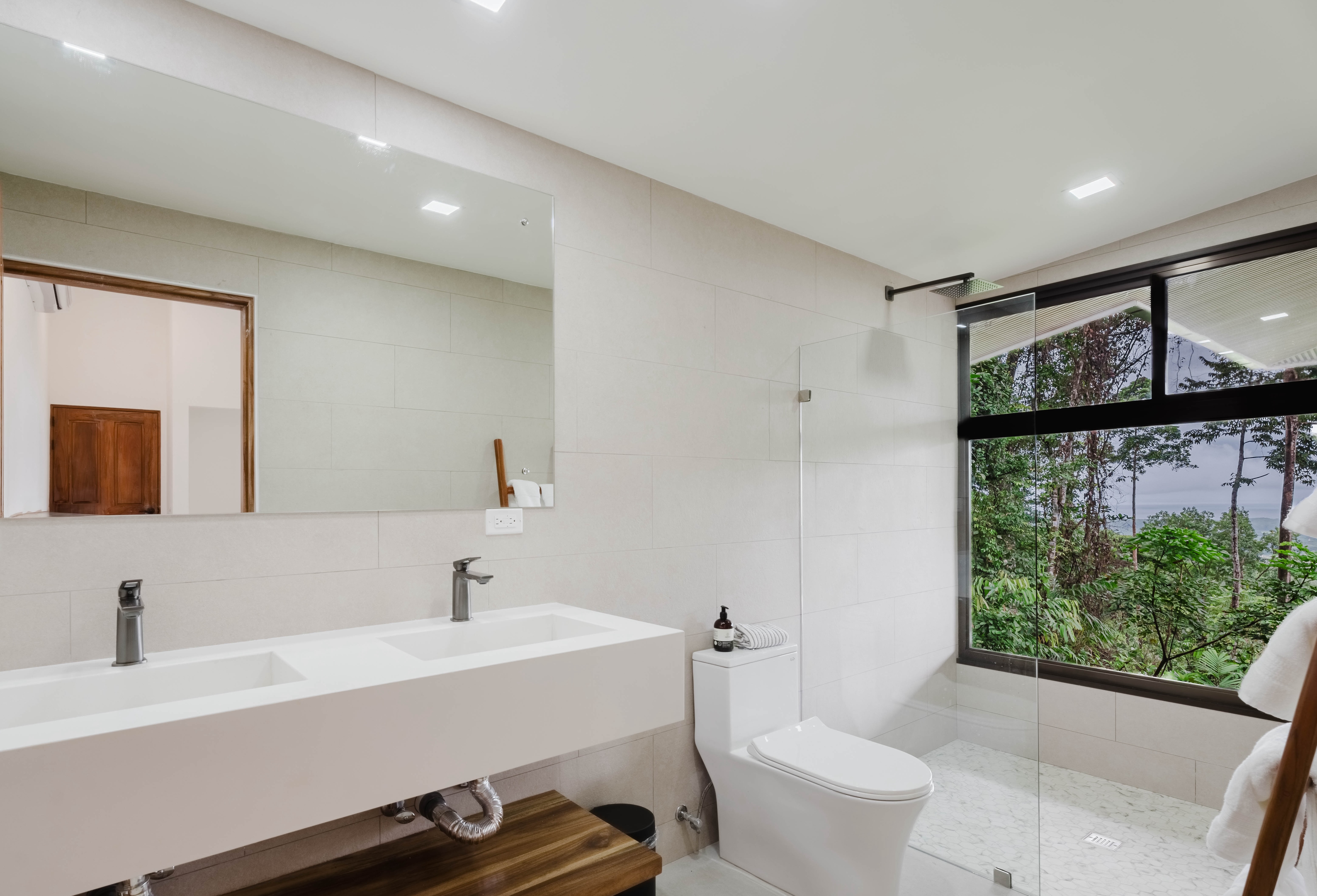 The Master bedroom sits on the front side of the villa with a king size designer bed set and opens out to the large balcony with ocean views and has its own ensuite bathroom with built in dual vanity courtz sinks and countertops with a rain shower that overlooks the ocean and jungle landscape. The additional two bedrooms reside on the back of the villa with jungle views. One of the bedrooms features a king size bed with an ensuite bathroom servings as a secondary Master Bedroom, while the third bedroom features two queen size bed and a dual-access ensuite bathroom.