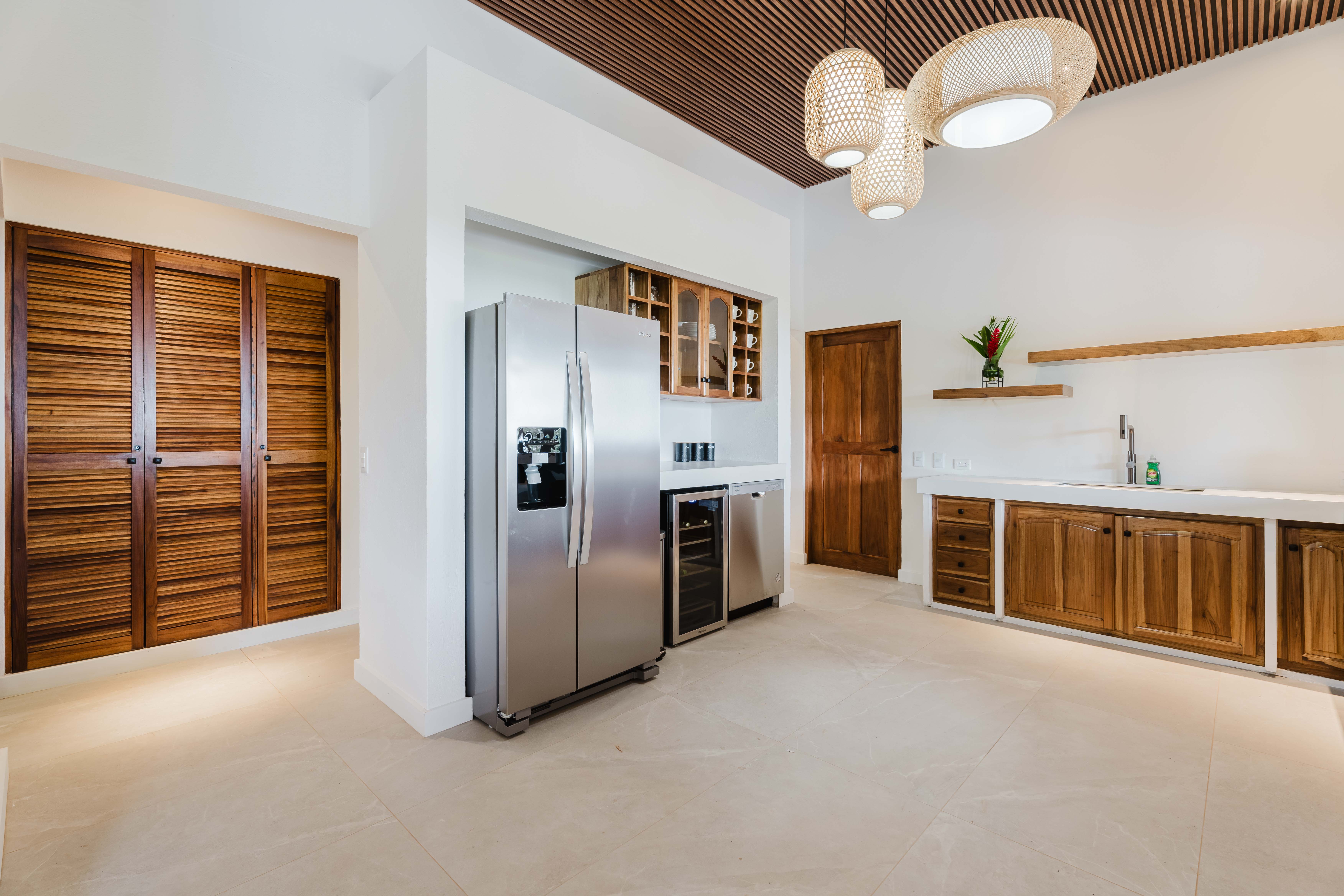 Step into this stunning kitchen that exudes elegance and functionality, featuring soaring high ceilings that create an open and inviting atmosphere. The rich teak cabinetry adds warmth and sophistication, beautifully complementing the sleek quartz countertops that provide ample space for meal prep and gatherings. Fully equipped with stainless steel appliances, including a refrigerator with ice maker, gas stove, dishwasher, along with a wine/beverage fridge ensures that your favorite vintages are always within reach, perfect for entertaining guests. The kitchen layout is designed with socializing in mind, highlighted by accordion windows that seamlessly open up to the outdoor bar and the formal outdoor dinning area. This feature invites