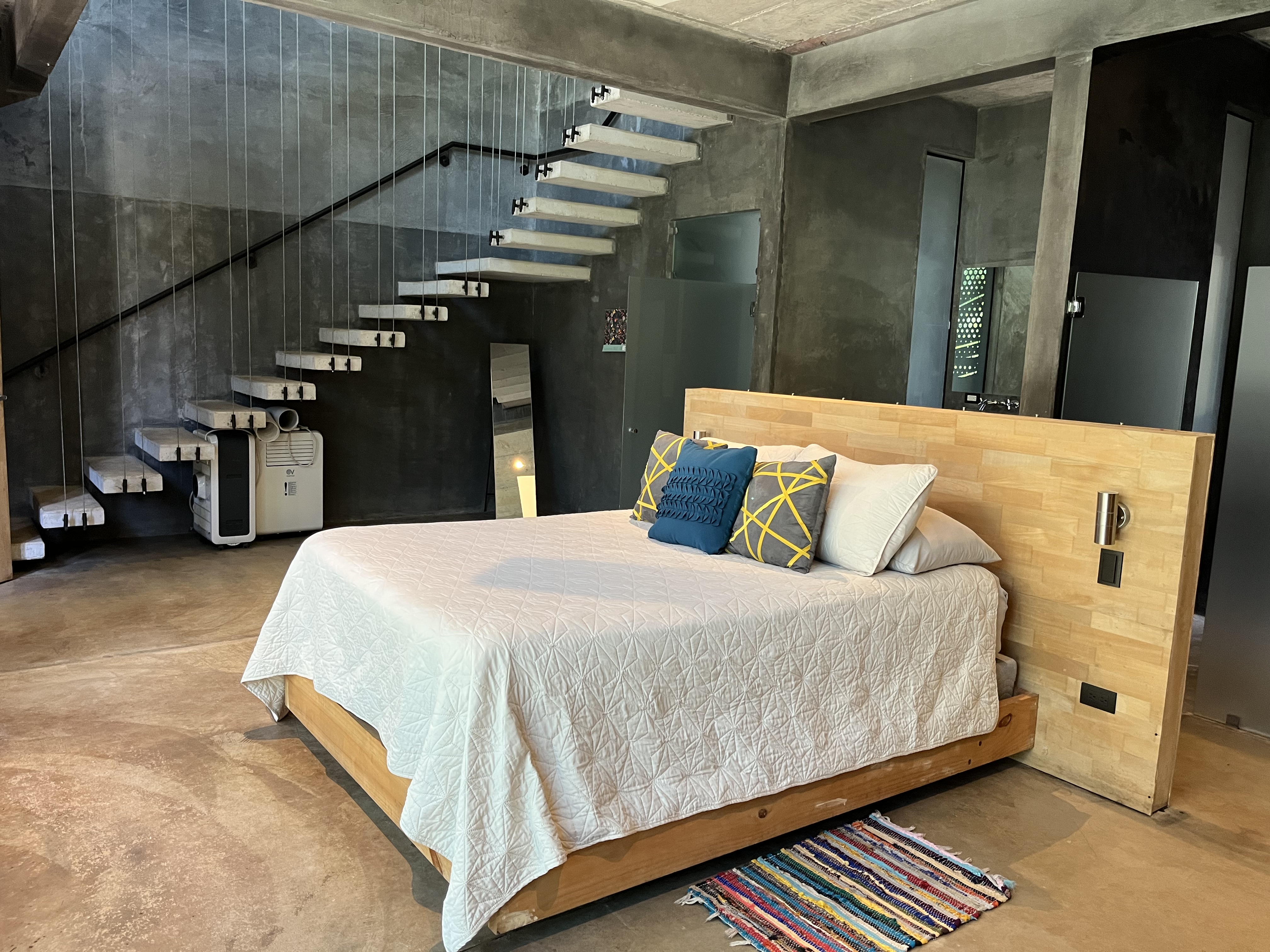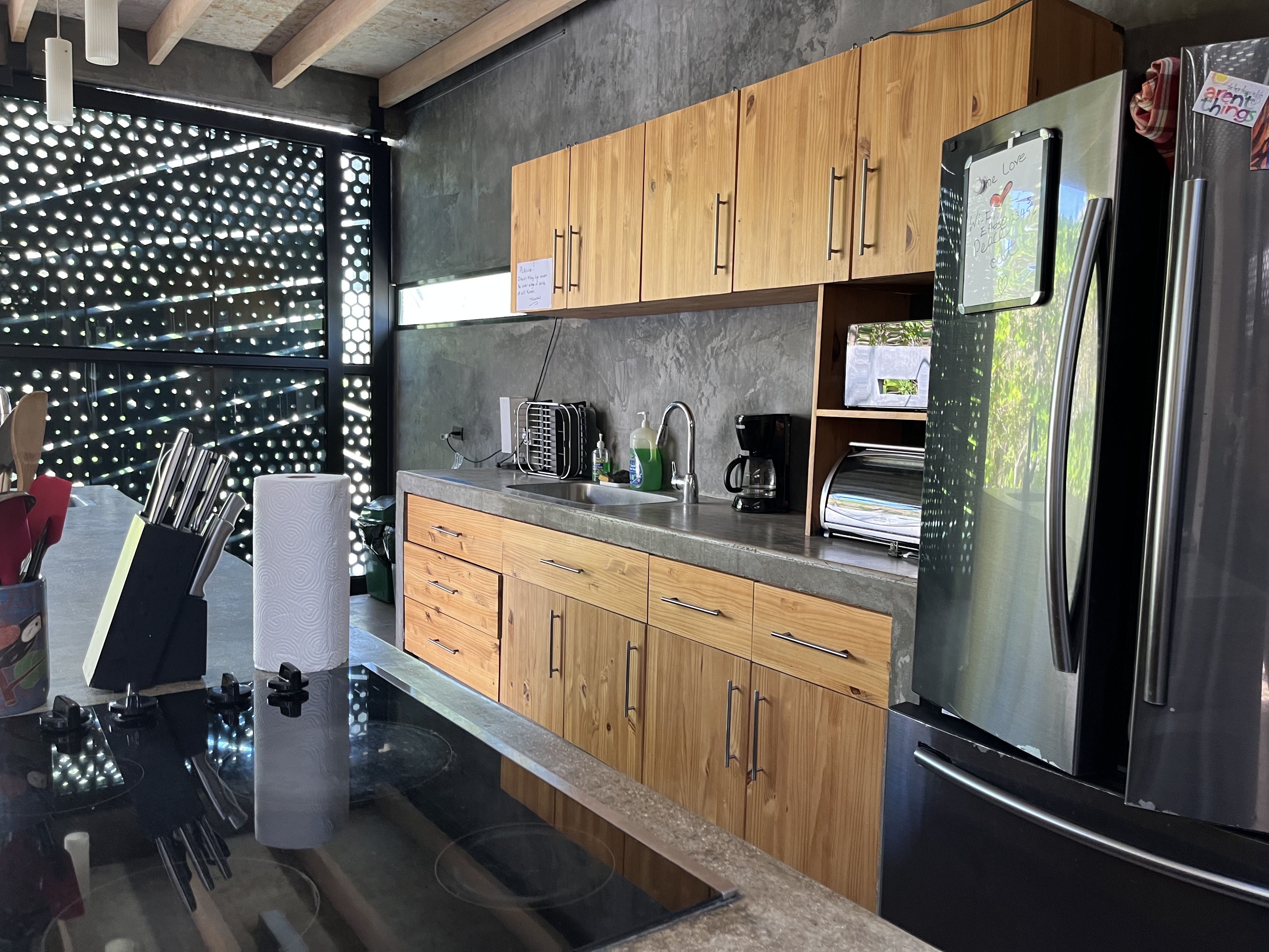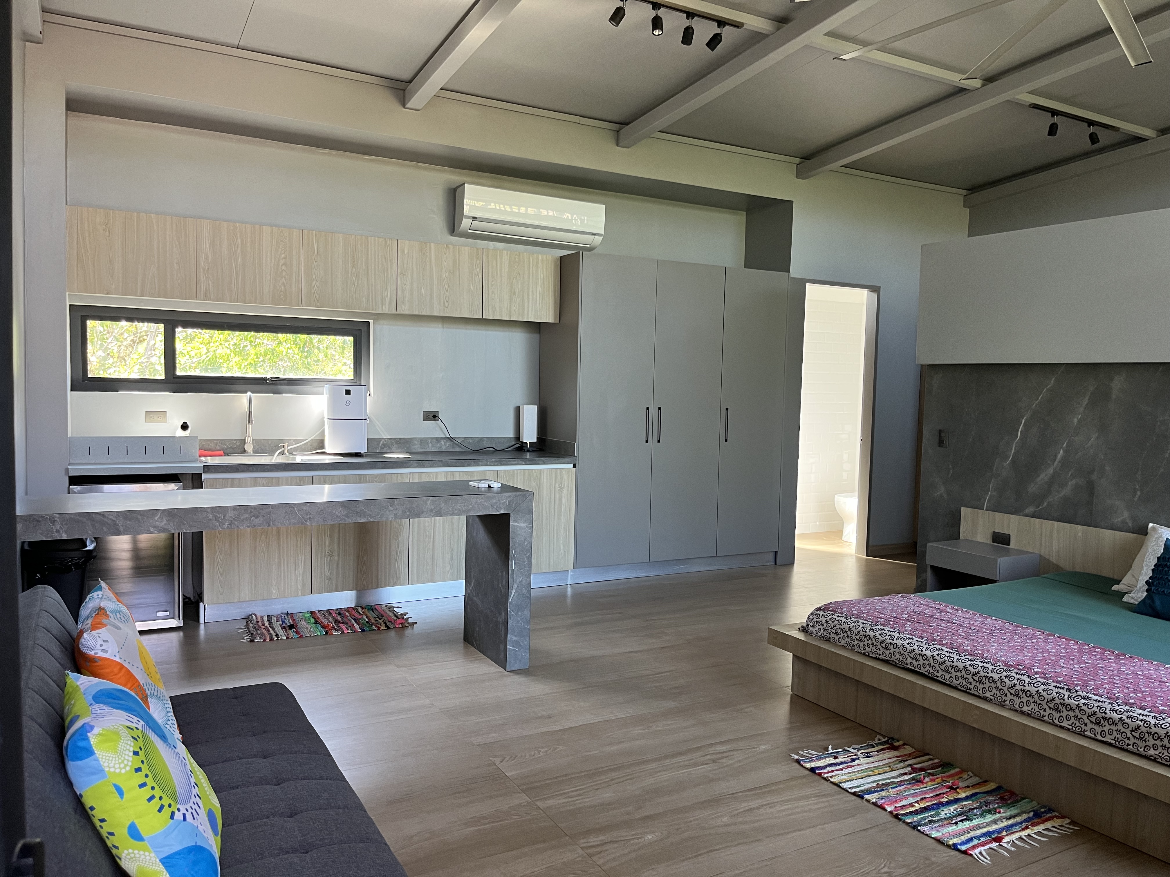 The main house features an open concept living and dining area, with sleek contemporary finishes and natural light flooding in from large textured doors and windows that all open up to allow natural air flow throughout the home. The kitchen is fully equipped with everything you need, polished concrete countertops, and ample storage space. Both bedrooms are spacious and offer comfortable beds, the master has its own en-suite bathroom and loft that leads to one of the roof top decks.