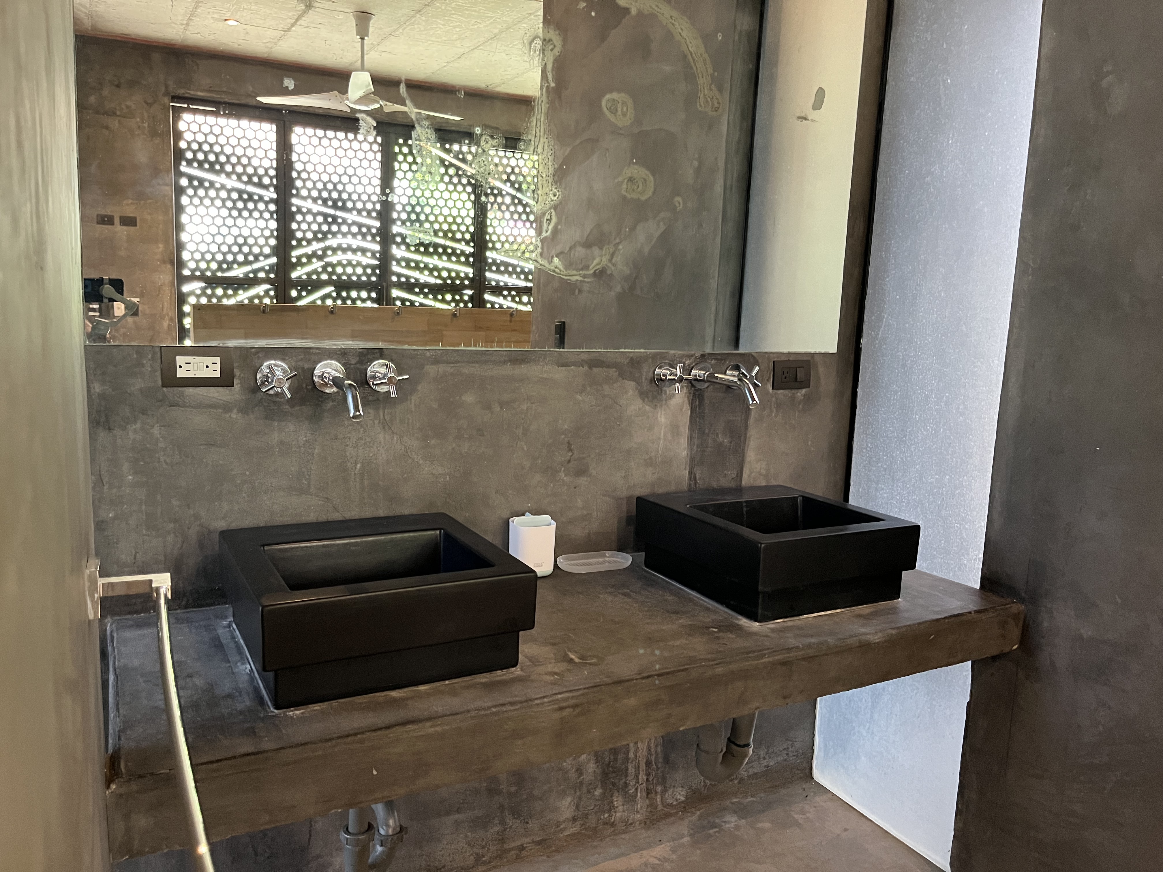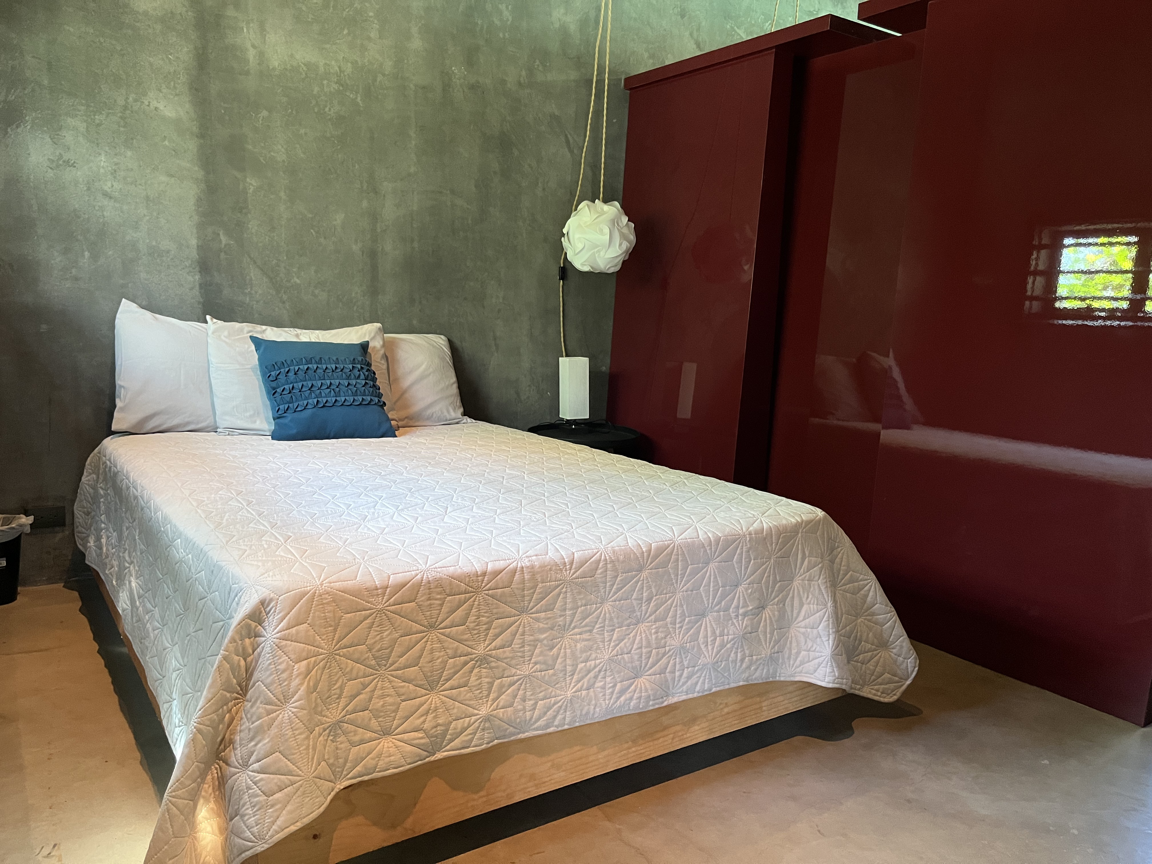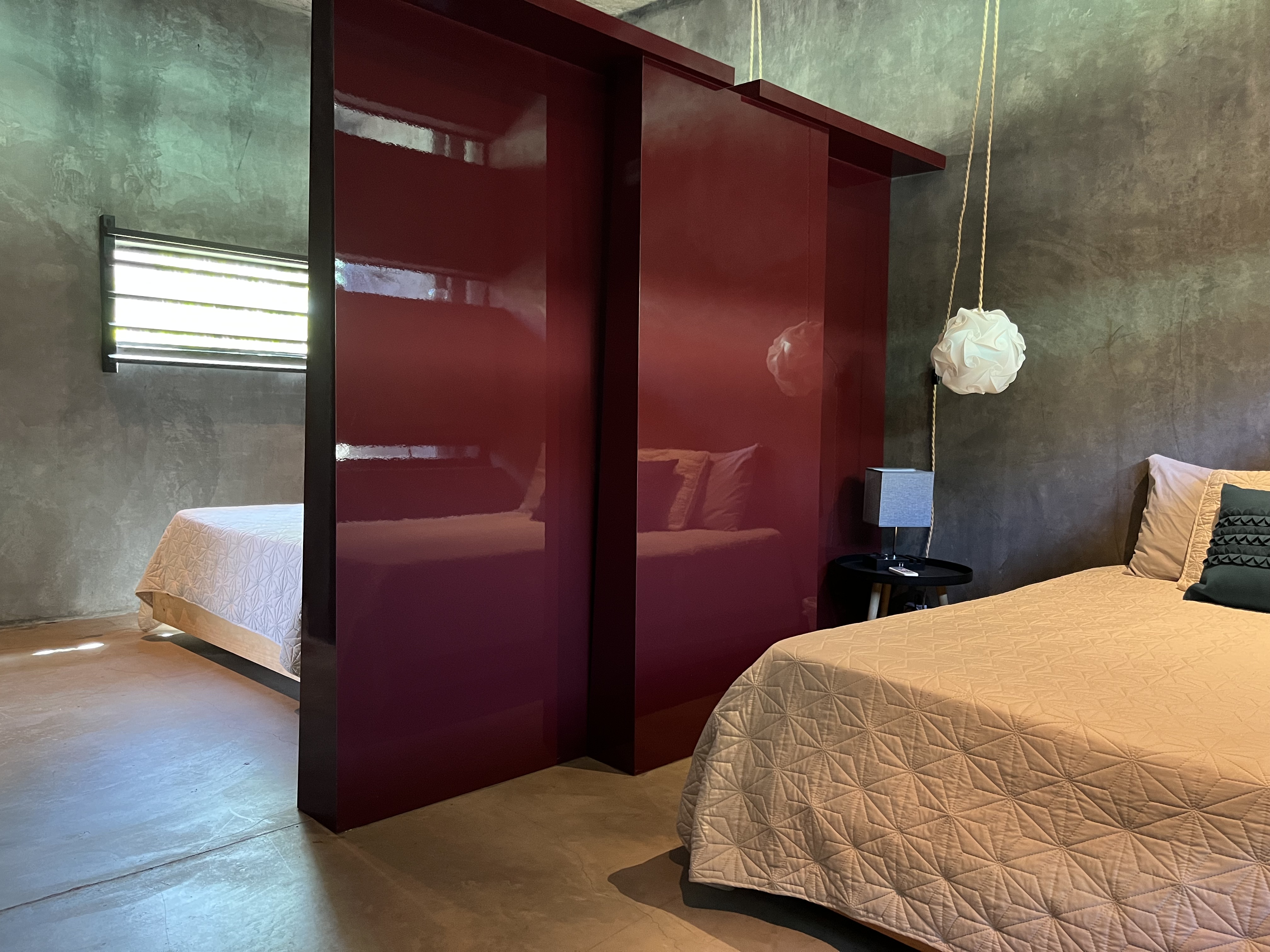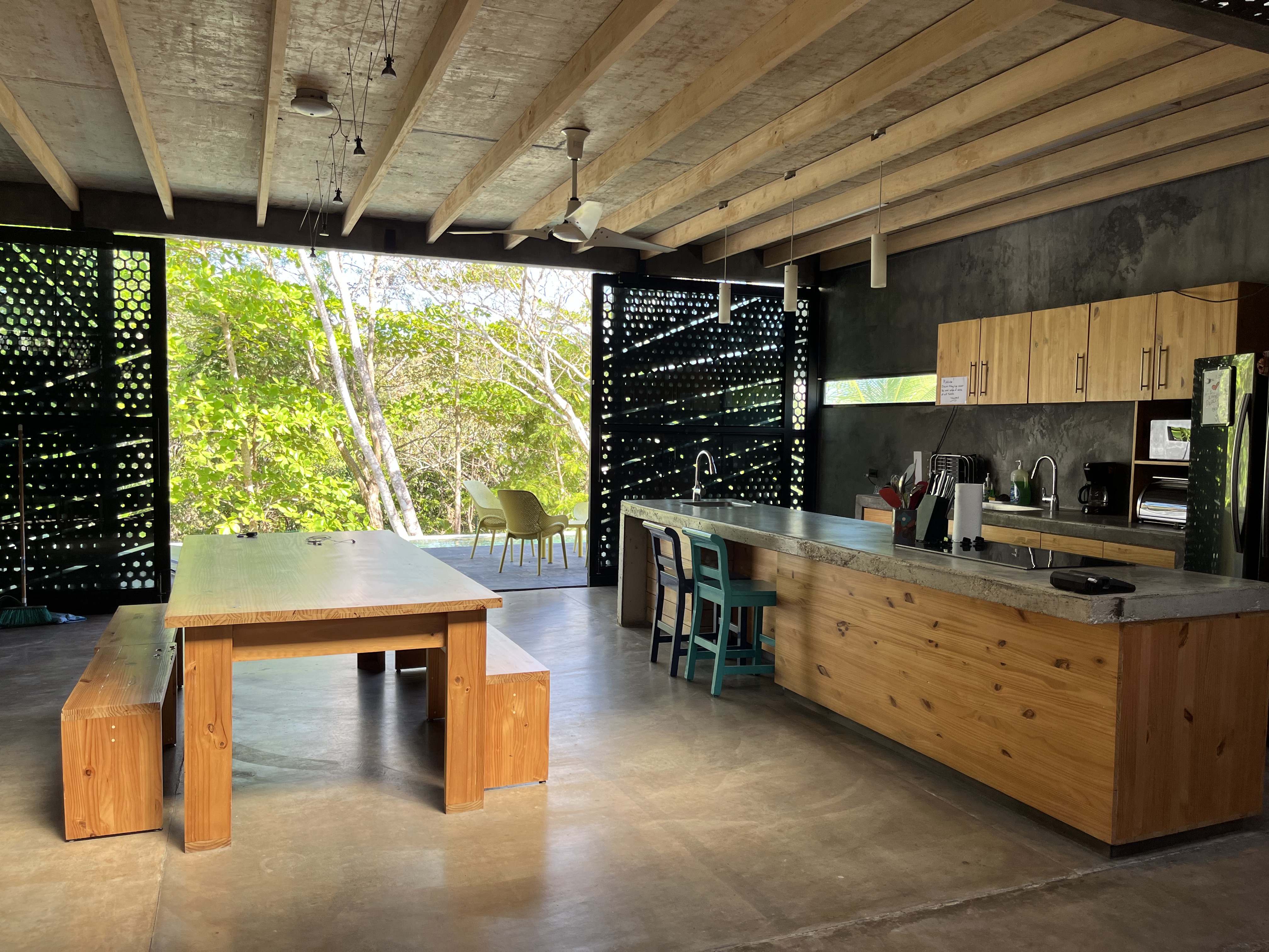 The main house features an open concept living and dining area, with sleek contemporary finishes and natural light flooding in from large textured doors and windows that all open up to allow natural air flow throughout the home. The kitchen is fully equipped with everything you need, polished concrete countertops, and ample storage space. Both bedrooms are spacious and offer comfortable beds, the master has its own en-suite bathroom and loft that leads to one of the roof top decks.