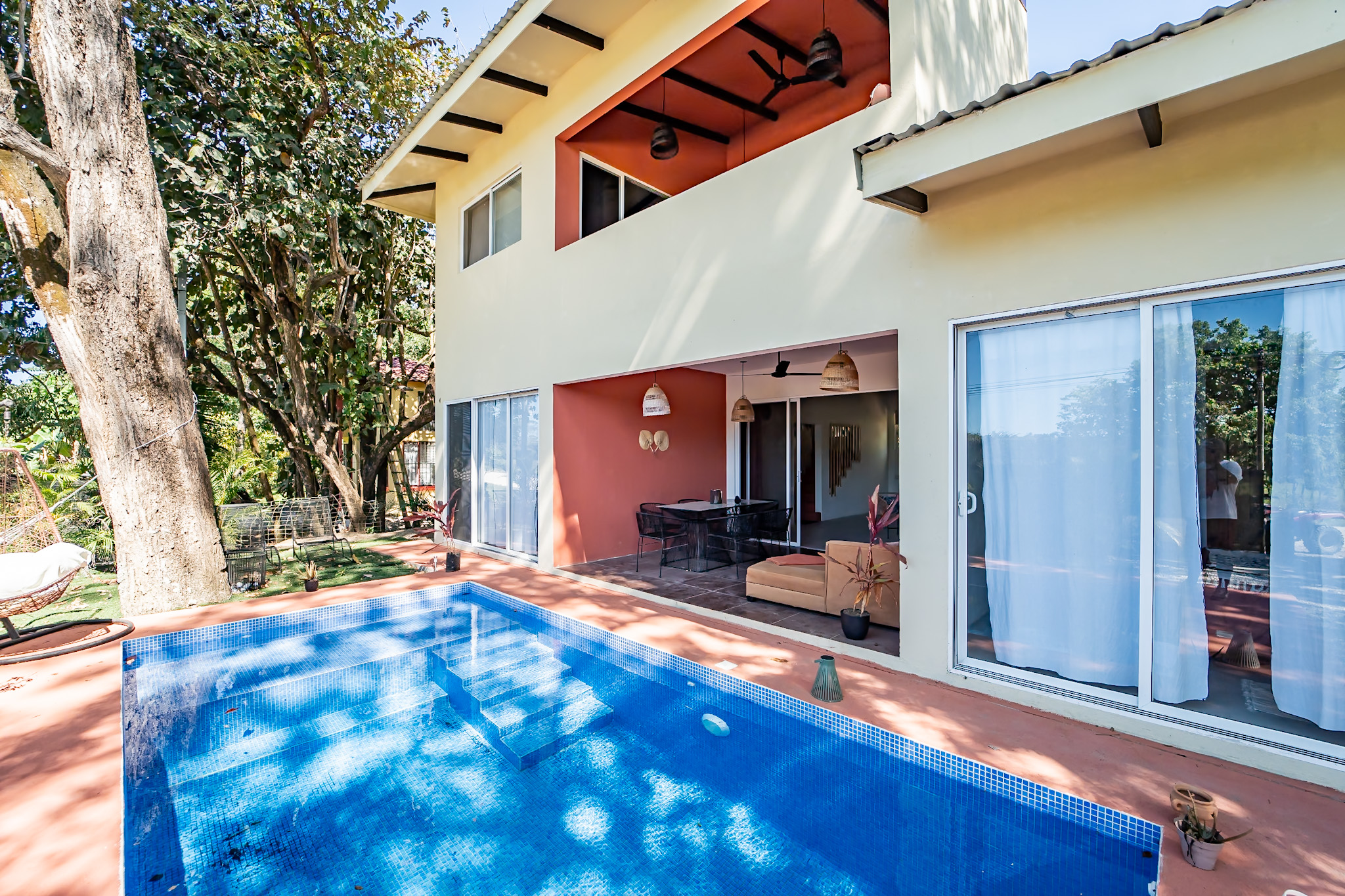 The well-maintained outdoor space features a 4x6 m pool with a shallow area for children, an outdoor shower, and a cozy corner with a hanging chair, hammock, and tropical plants. A mature tree provides shade, creating a peaceful spot for relaxation.