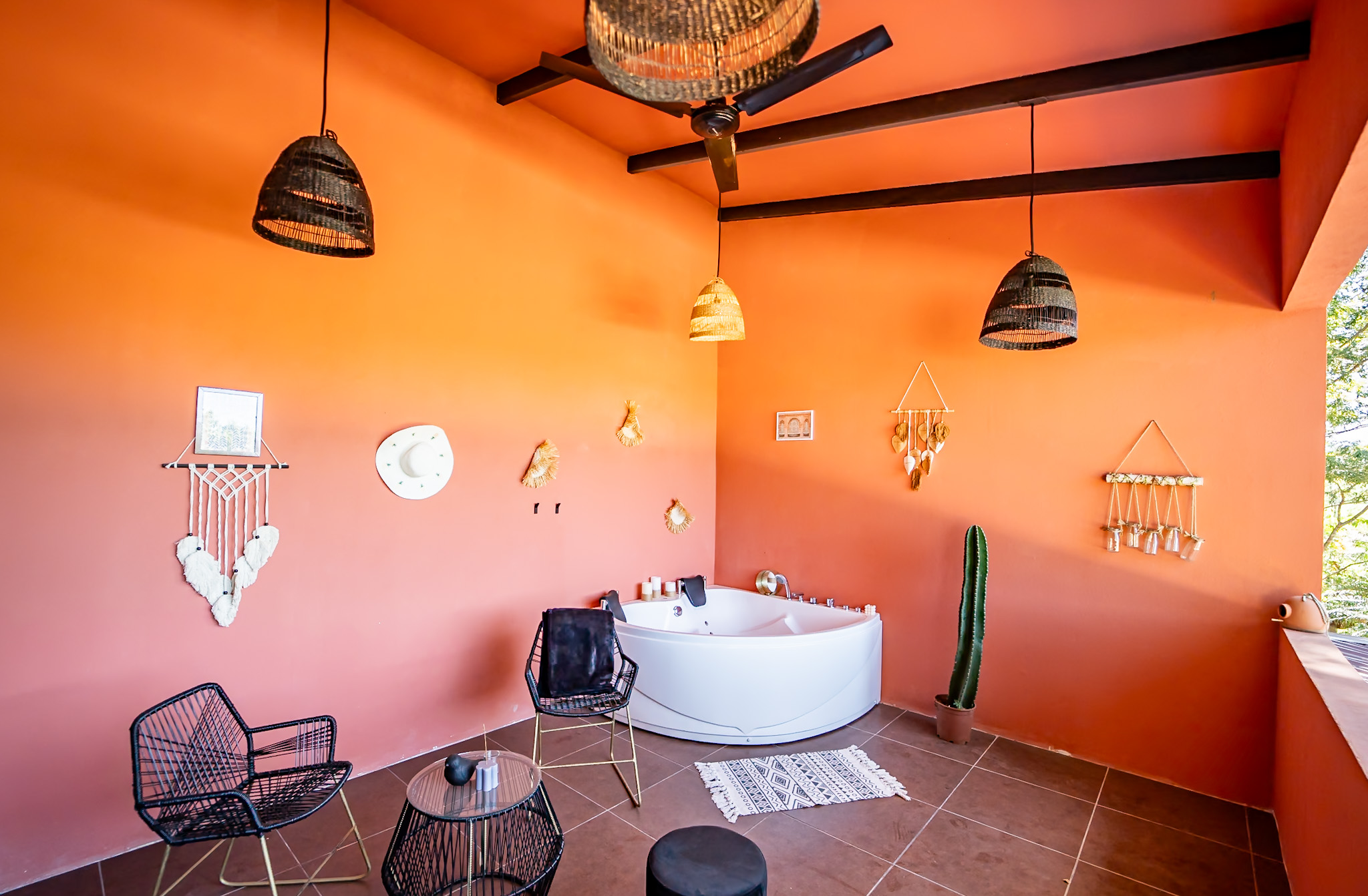 Upstairs, the primary suite includes a walk-in closet, a modern bathroom, and a king-size bed. A private terrace with a jacuzzi and seating area provides a tranquil space to unwind and enjoy stunning sunsets.