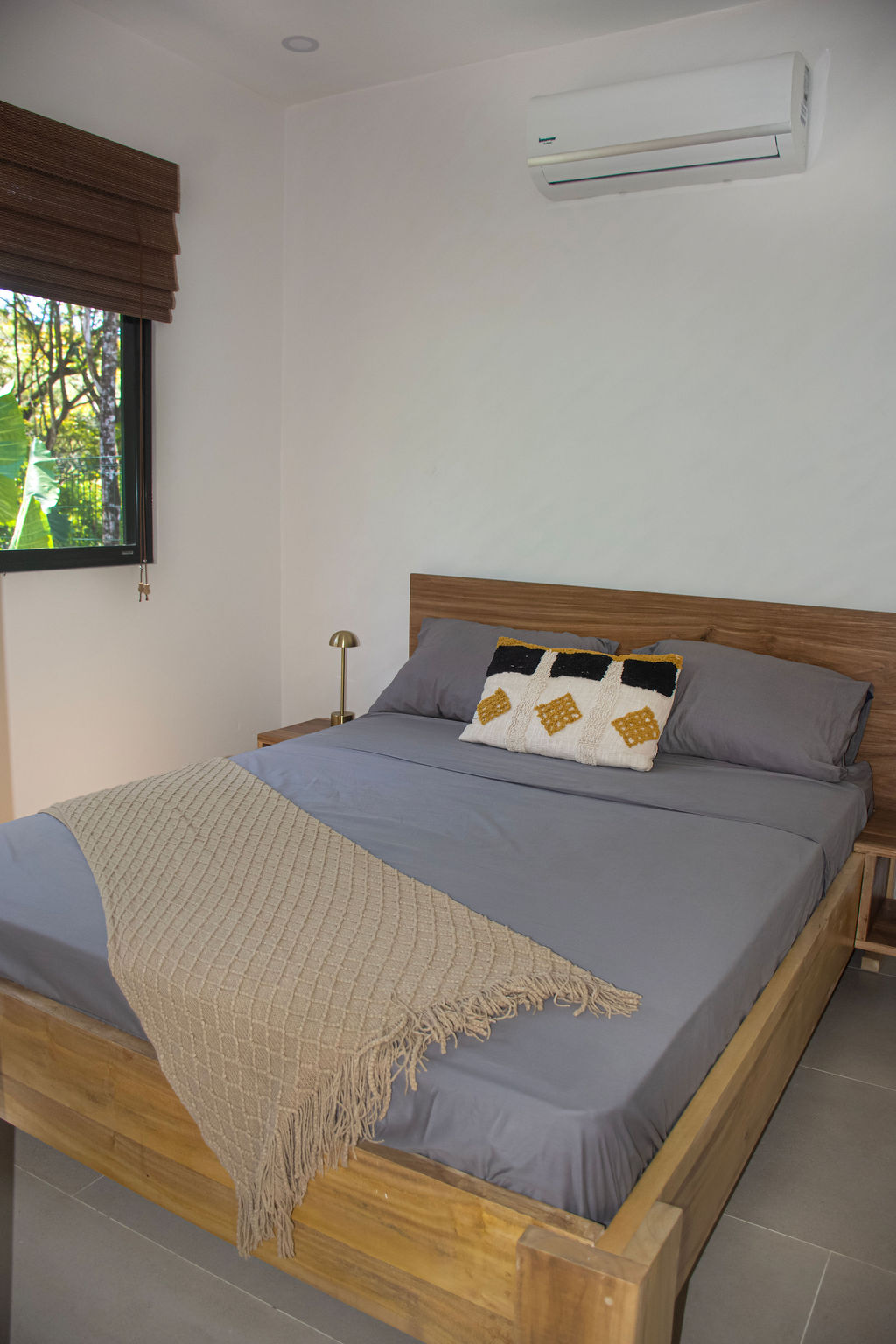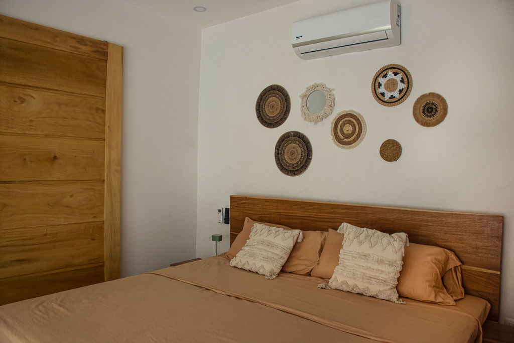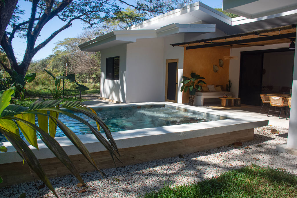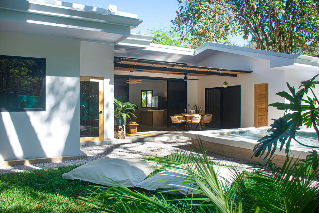 The property features air-conditioned interiors, a private swimming pool, a charming garden, and a large mature Guanacaste tree adding shade and character. Outdoor spaces are designed for comfort and relaxation.