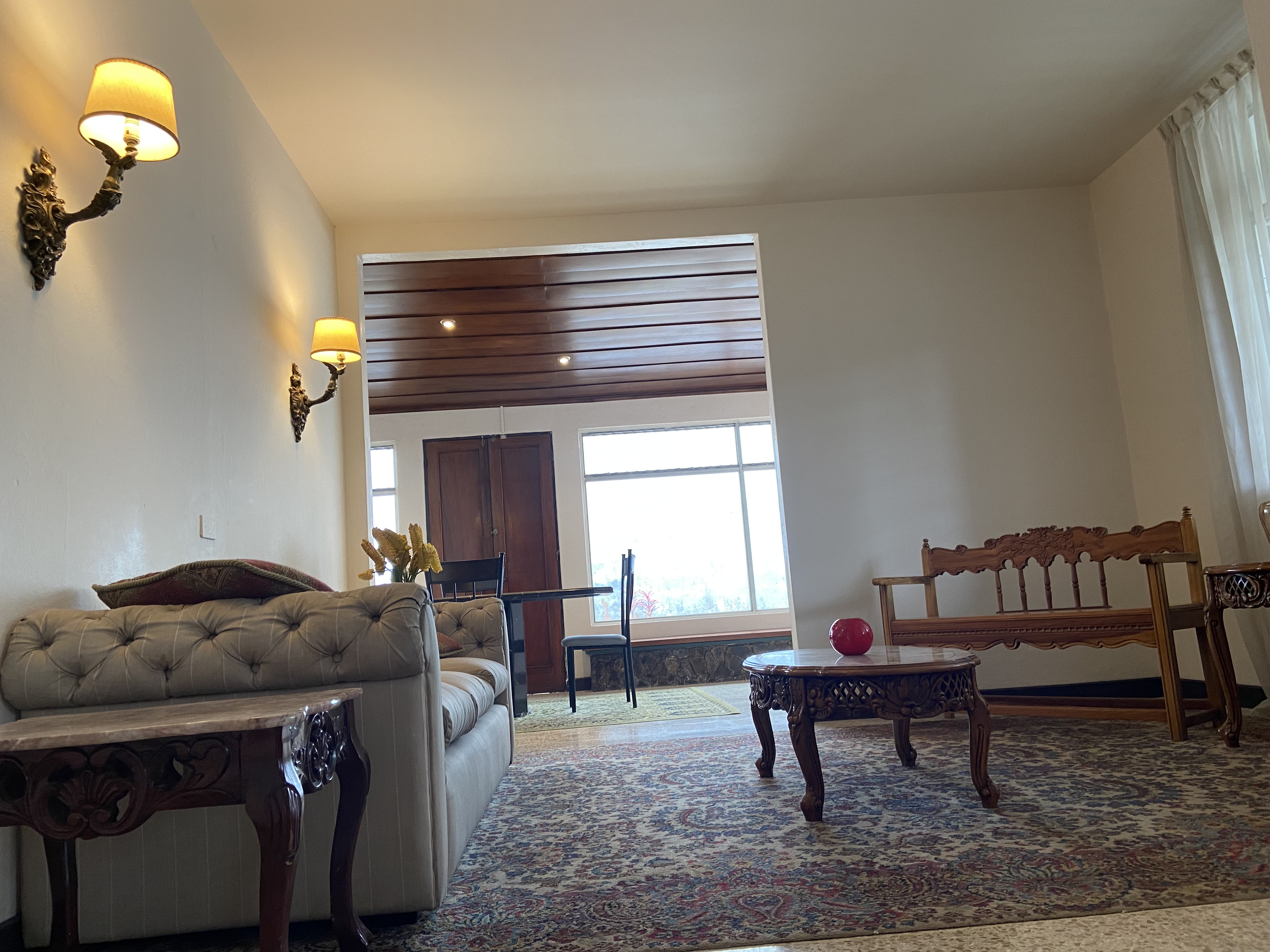 It has two large rooms, one of which has a fireplace, large gardens that surround the entire house, a very spacious dining room and a breakfast room.