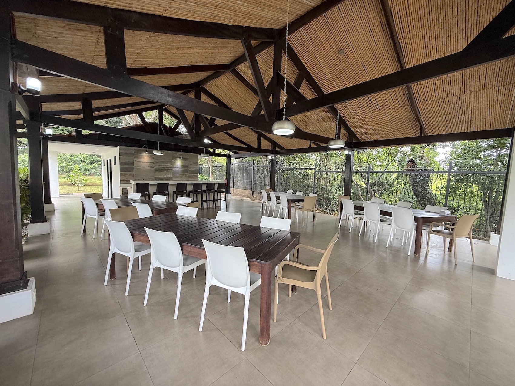 The main social area connects the living room, dining room, and kitchen with breakfast area — all opening to a covered terrace and lush tropical garden filled with orchids, fruit trees and medicinal plants.