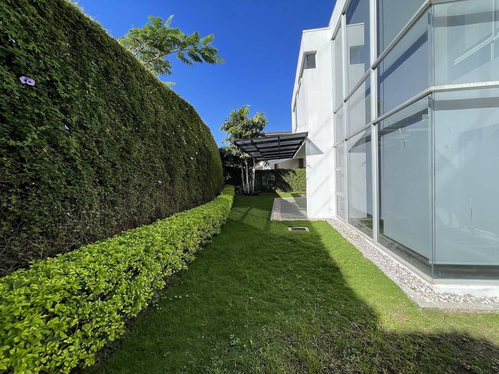 La distribución de la planta baja, al norte 2 espacios de parqueo y 1 sin techar, bodega y bomba de agua. En su interior una oficina, sala de doble altura, comedor, cocina amplia, una terraza techada con vistas a un jardín ya decorado y su cuarto de servicio y lavandería.