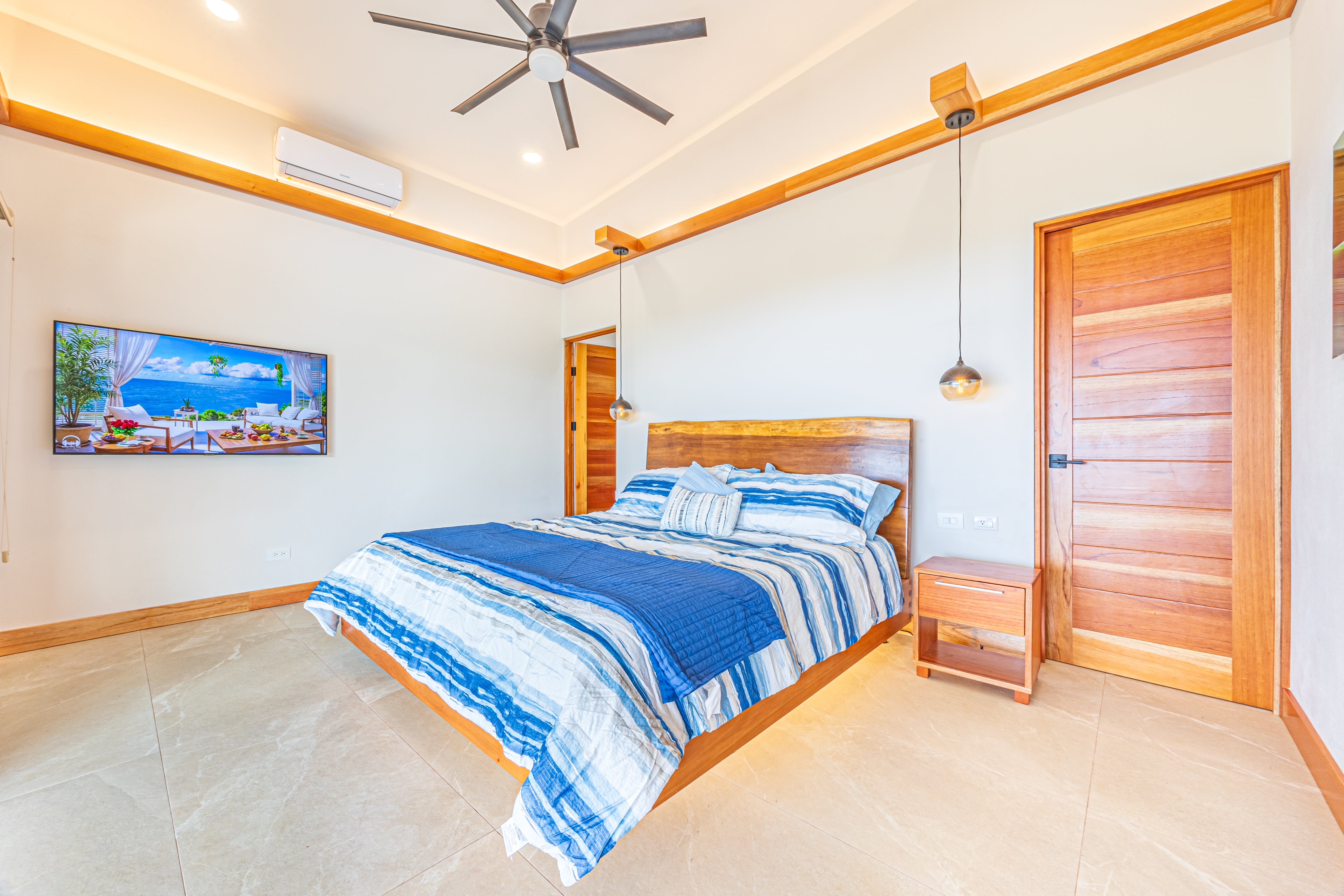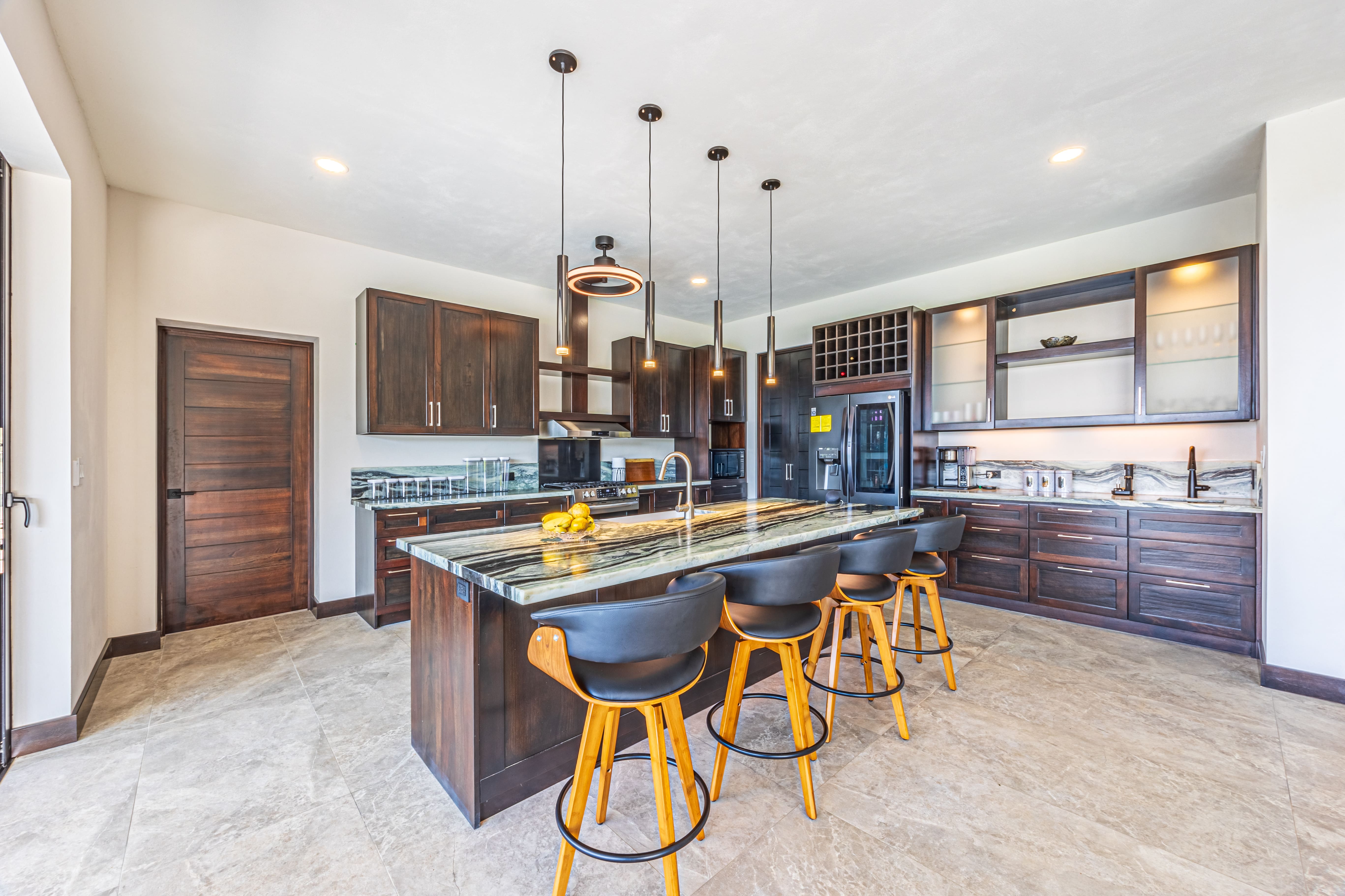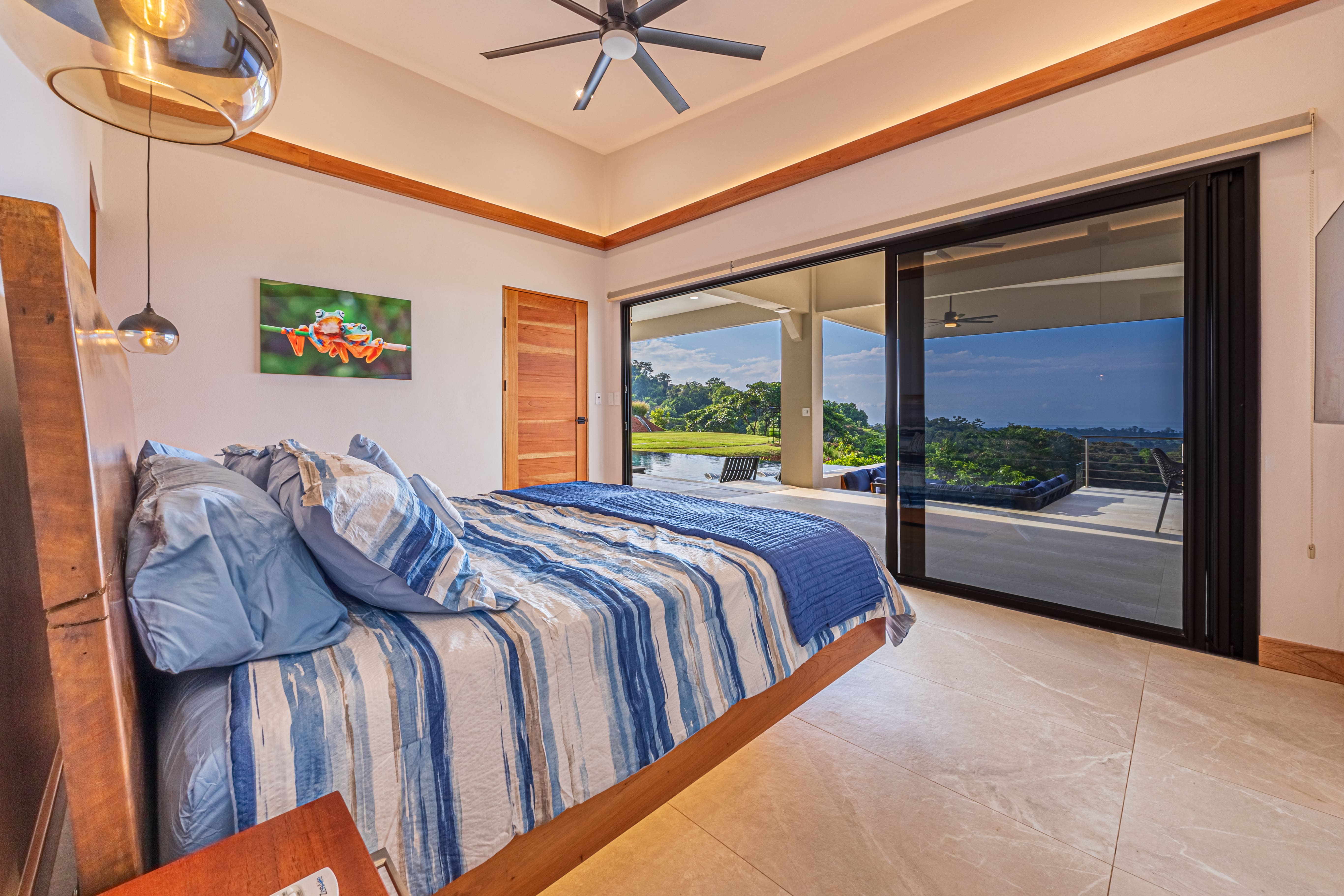 The master suite is a true private retreat, offering unobstructed ocean views, dual walk-in closets, and a spa-inspired bath with twin rain showers and a soaking tub that opens to the lush outdoors. A private 30’ x 12′ terrace with an integrated wet bar offers an intimate space to enjoy in privacy. A dedicated office space within the suite includes a custom guanacaste wood desk that faces the ocean view strategically placed to distract you from your work.
