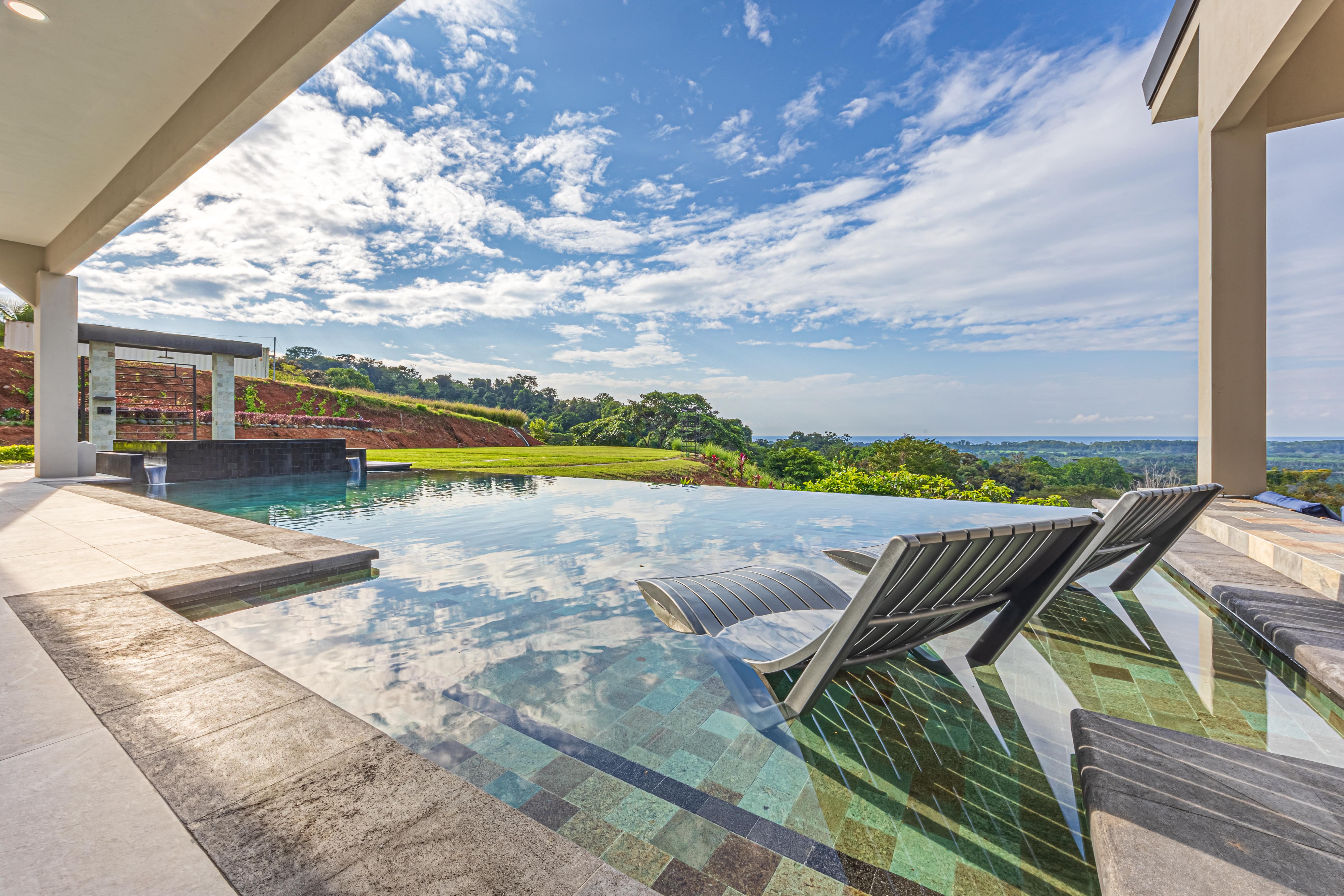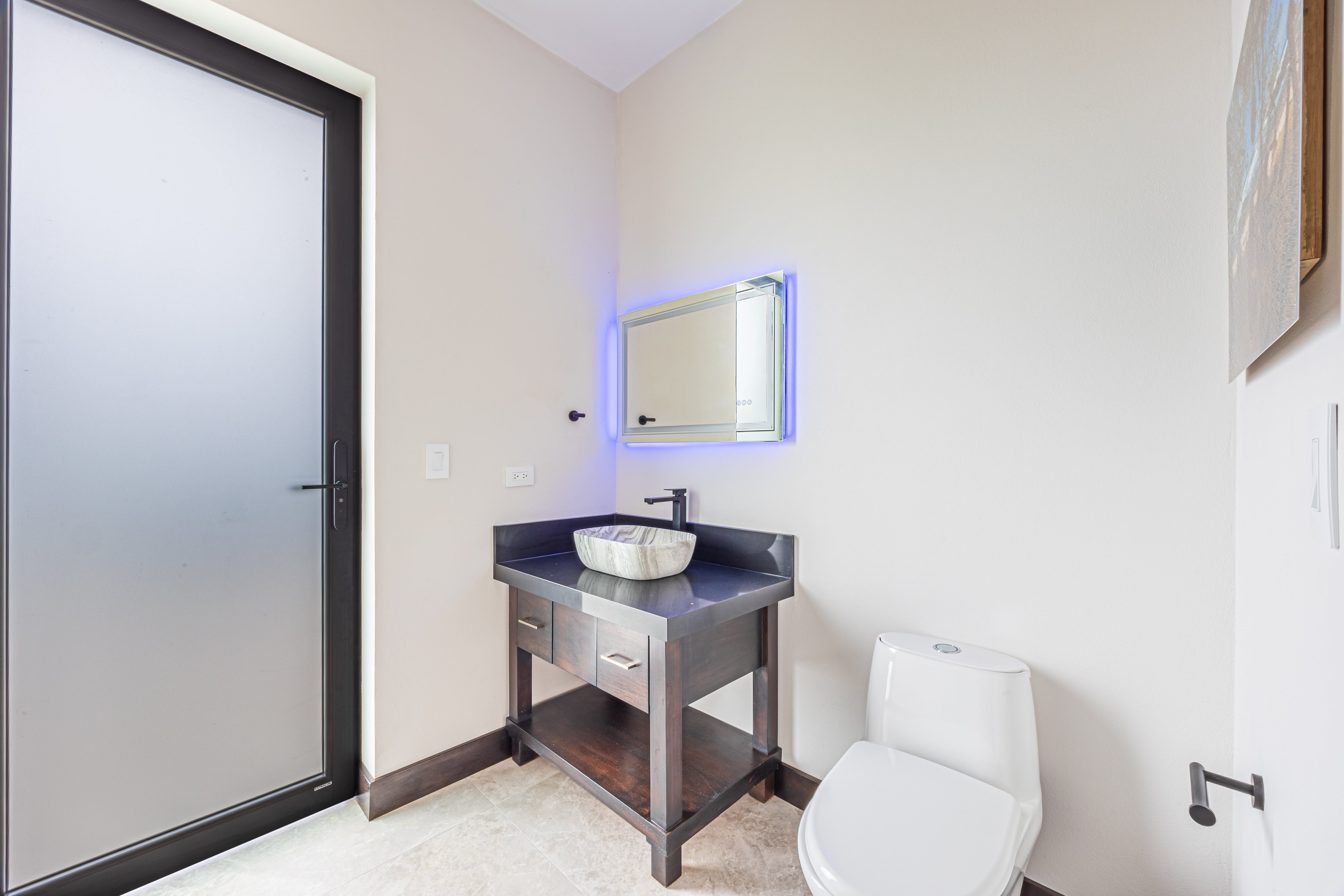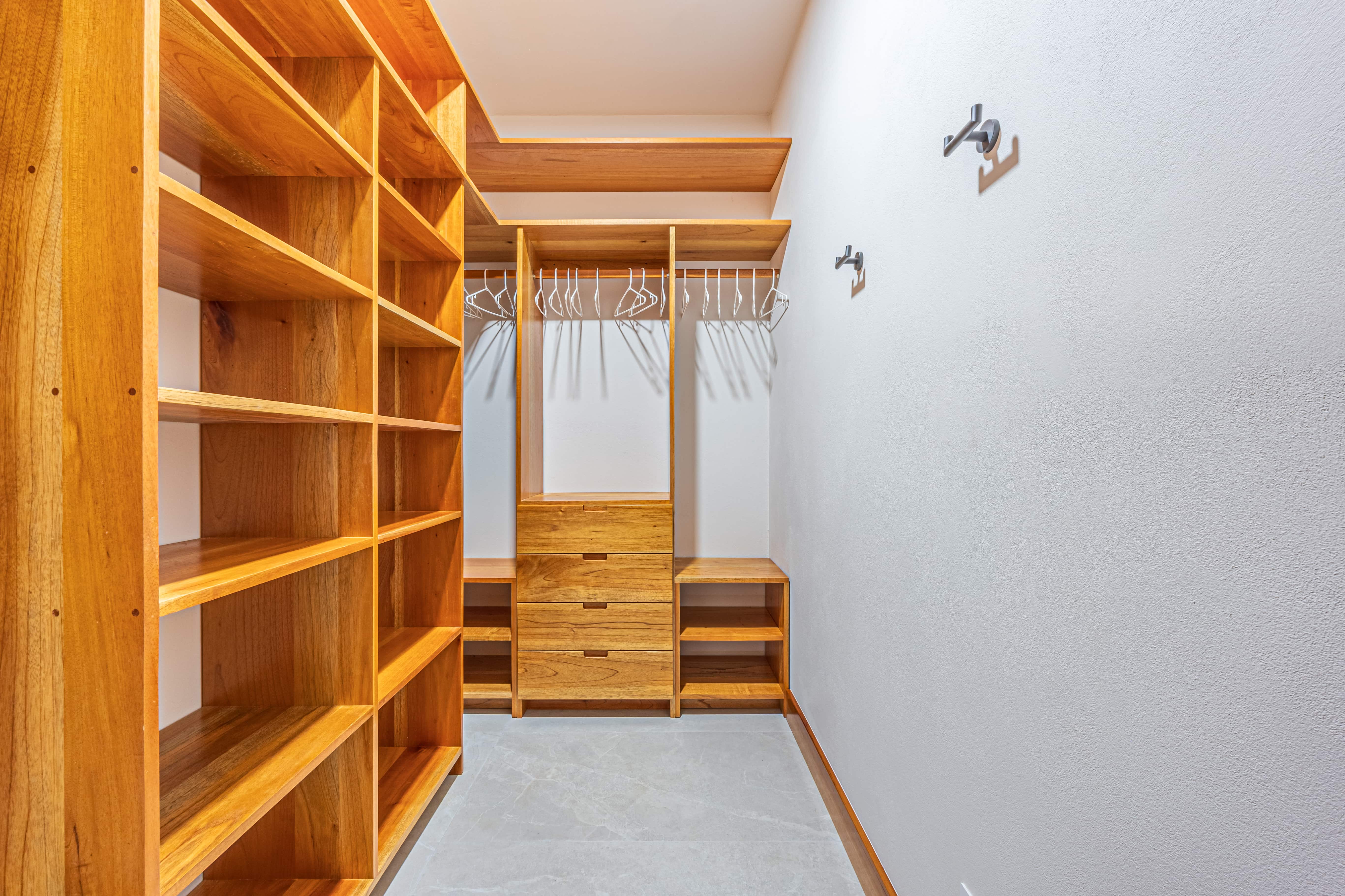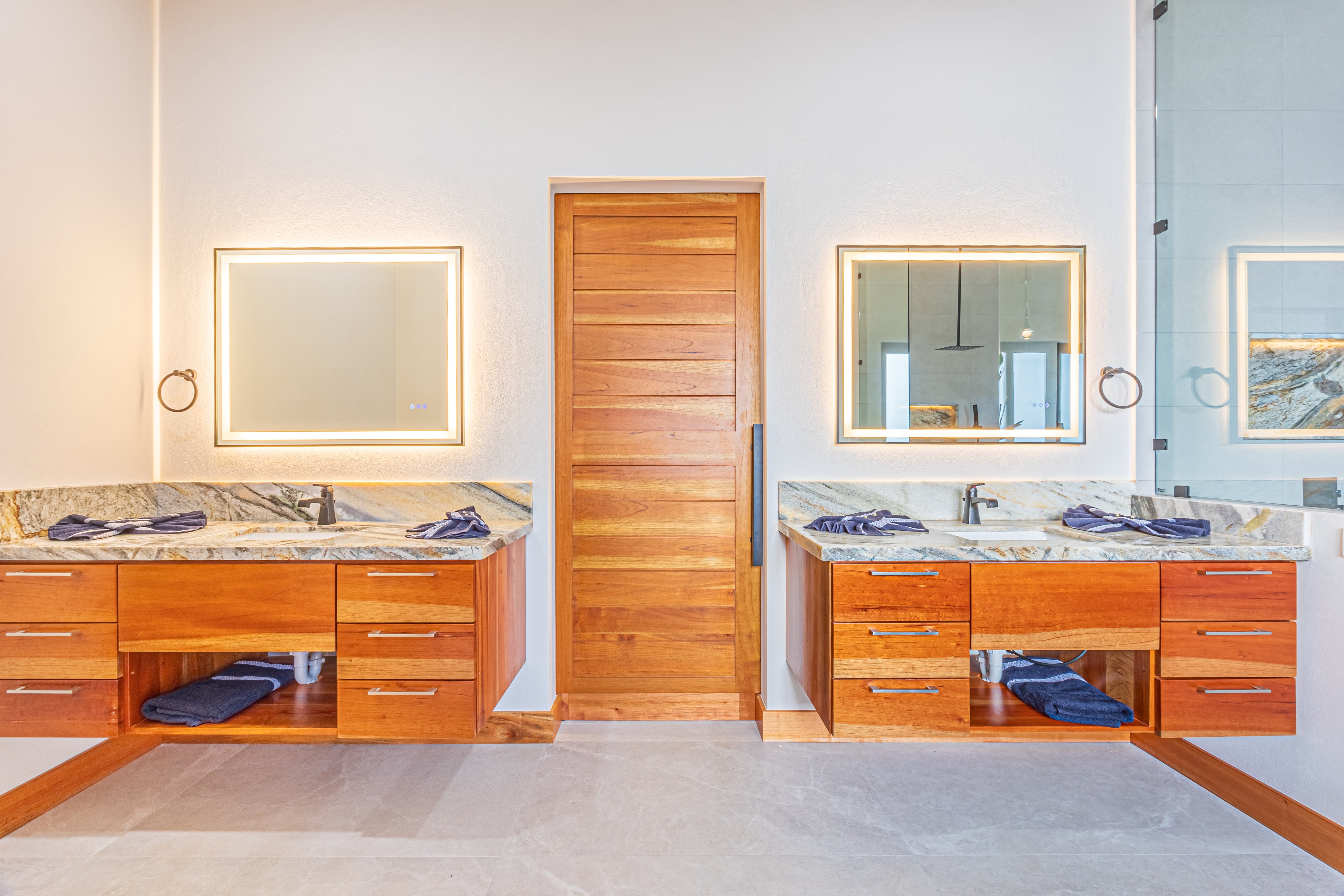 The master suite is a true private retreat, offering unobstructed ocean views, dual walk-in closets, and a spa-inspired bath with twin rain showers and a soaking tub that opens to the lush outdoors. A private 30’ x 12′ terrace with an integrated wet bar offers an intimate space to enjoy in privacy. A dedicated office space within the suite includes a custom guanacaste wood desk that faces the ocean view strategically placed to distract you from your work.