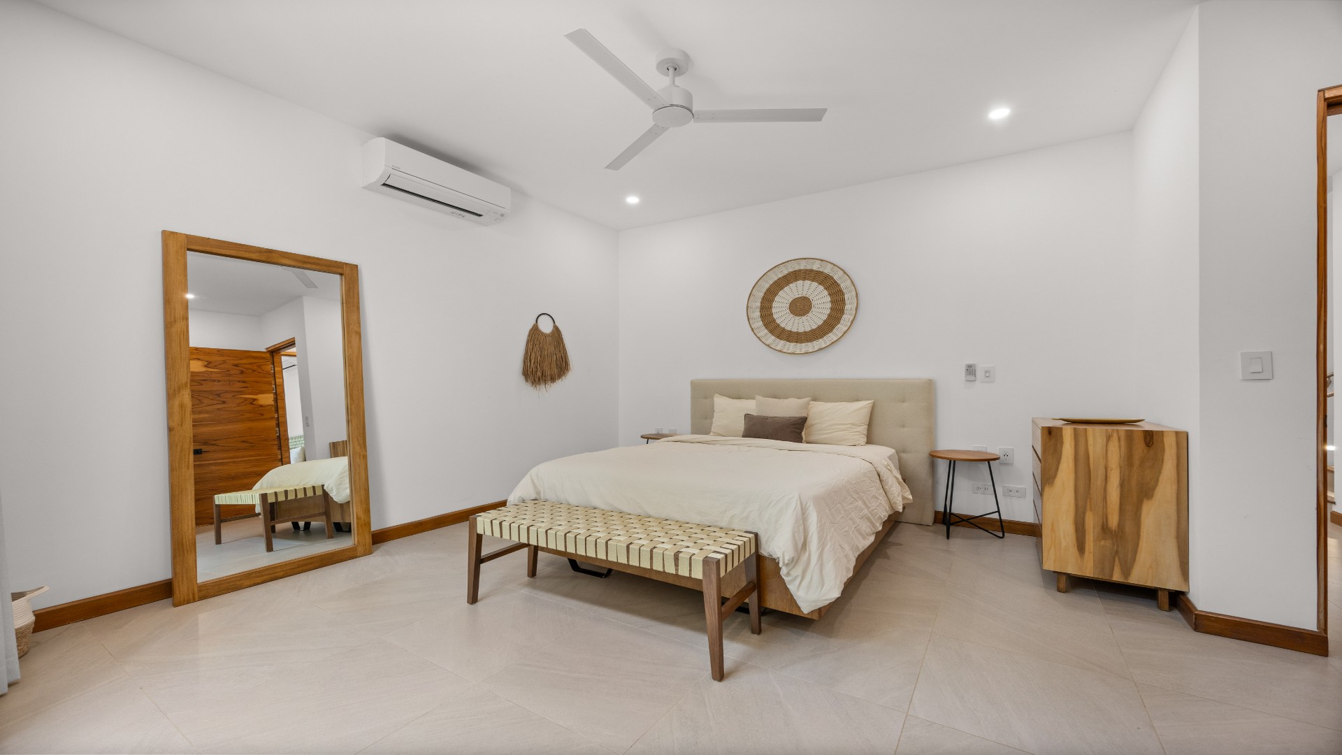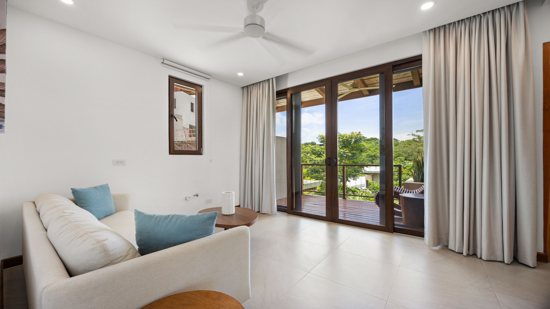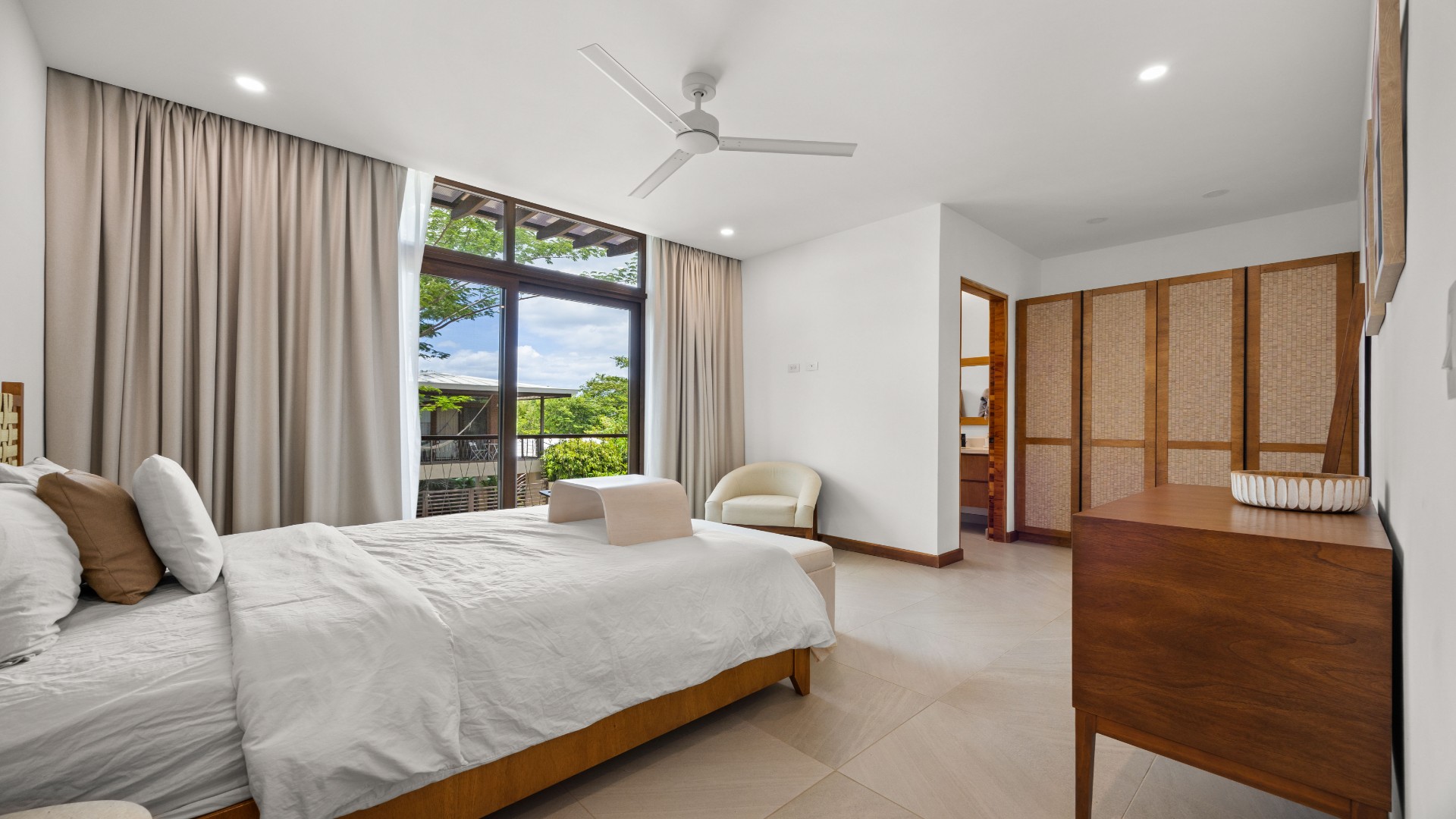 Each bedroom is thoughtfully designed with porcelain flooring and premium finishes. The primary suite offers a private balcony with partial views toward Langosta Beach, the second bedroom includes its own balcony, and the third bedroom features a private indoor garden, ideal for a yoga space or reading area.