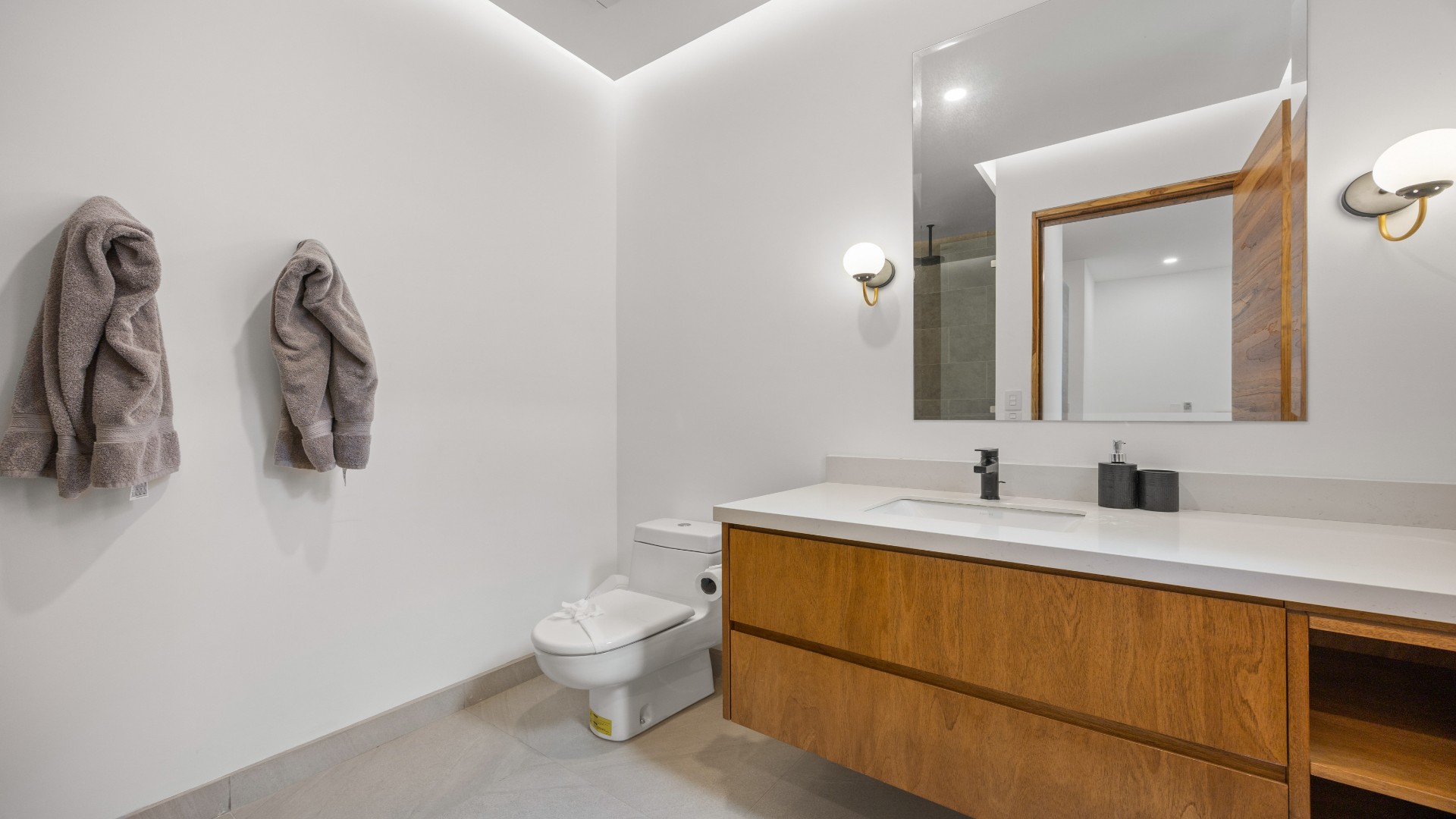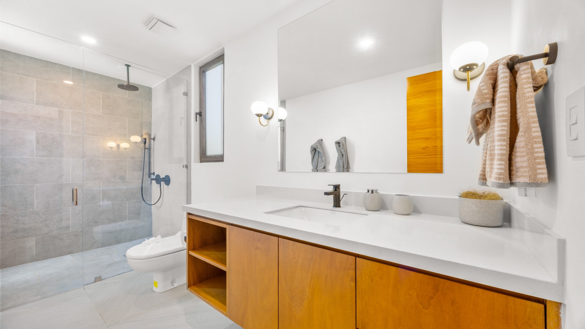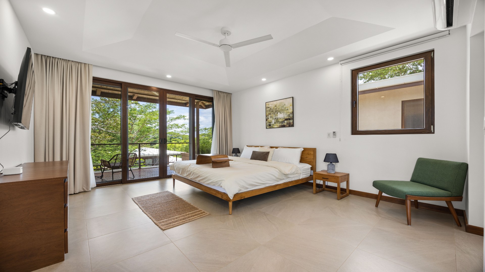Each bedroom is thoughtfully designed with porcelain flooring and premium finishes. The primary suite offers a private balcony with partial views toward Langosta Beach, the second bedroom includes its own balcony, and the third bedroom features a private indoor garden, ideal for a yoga space or reading area.
