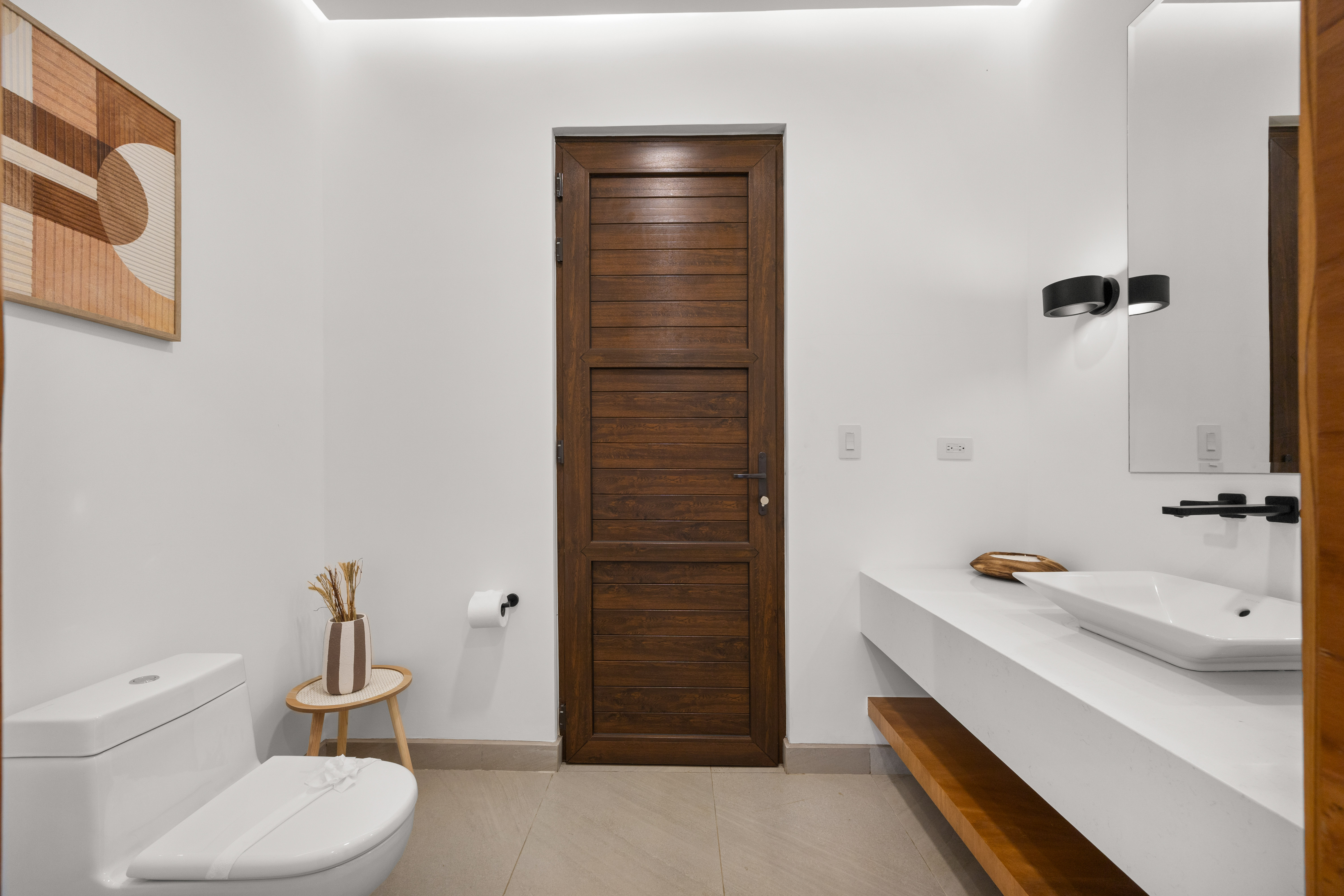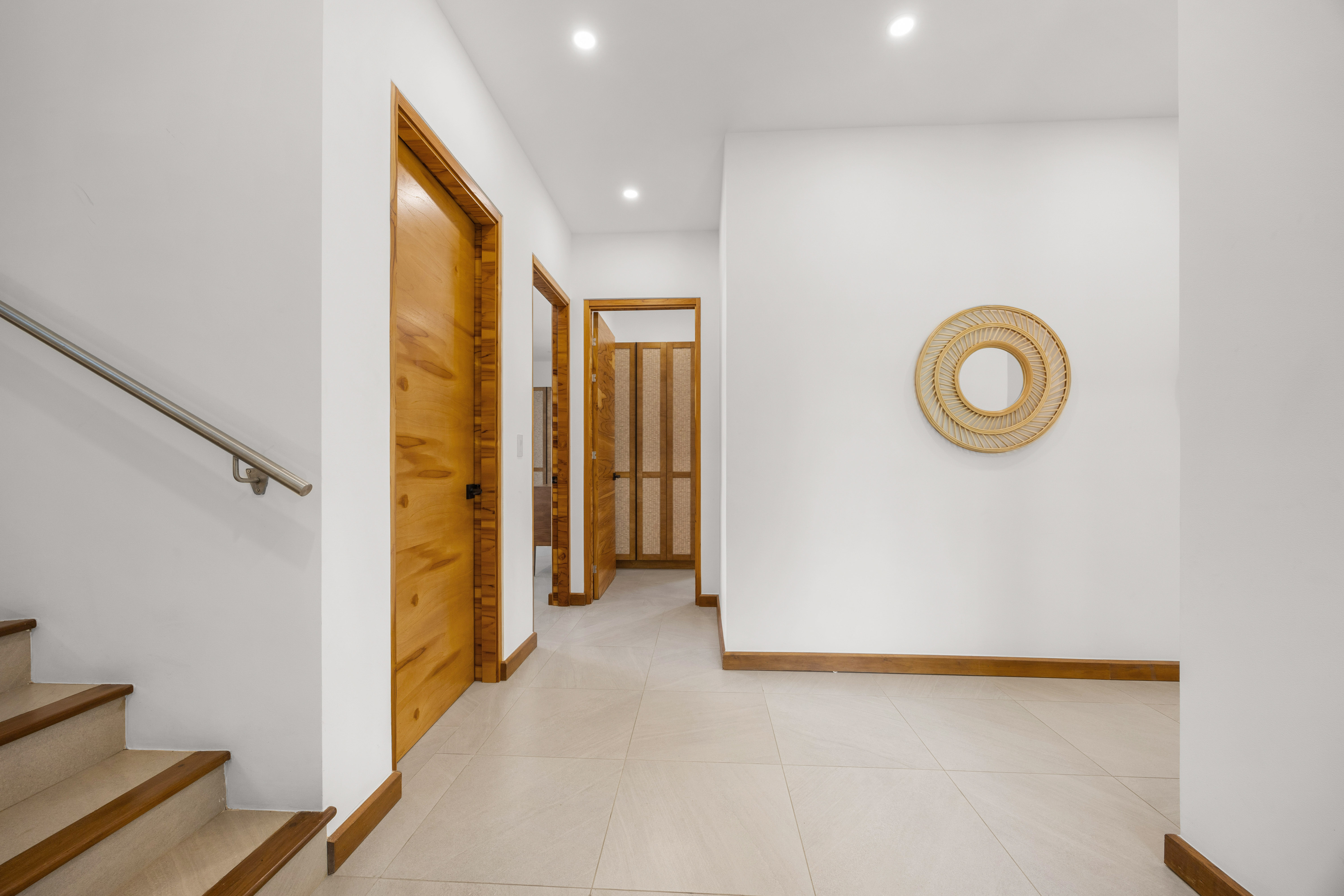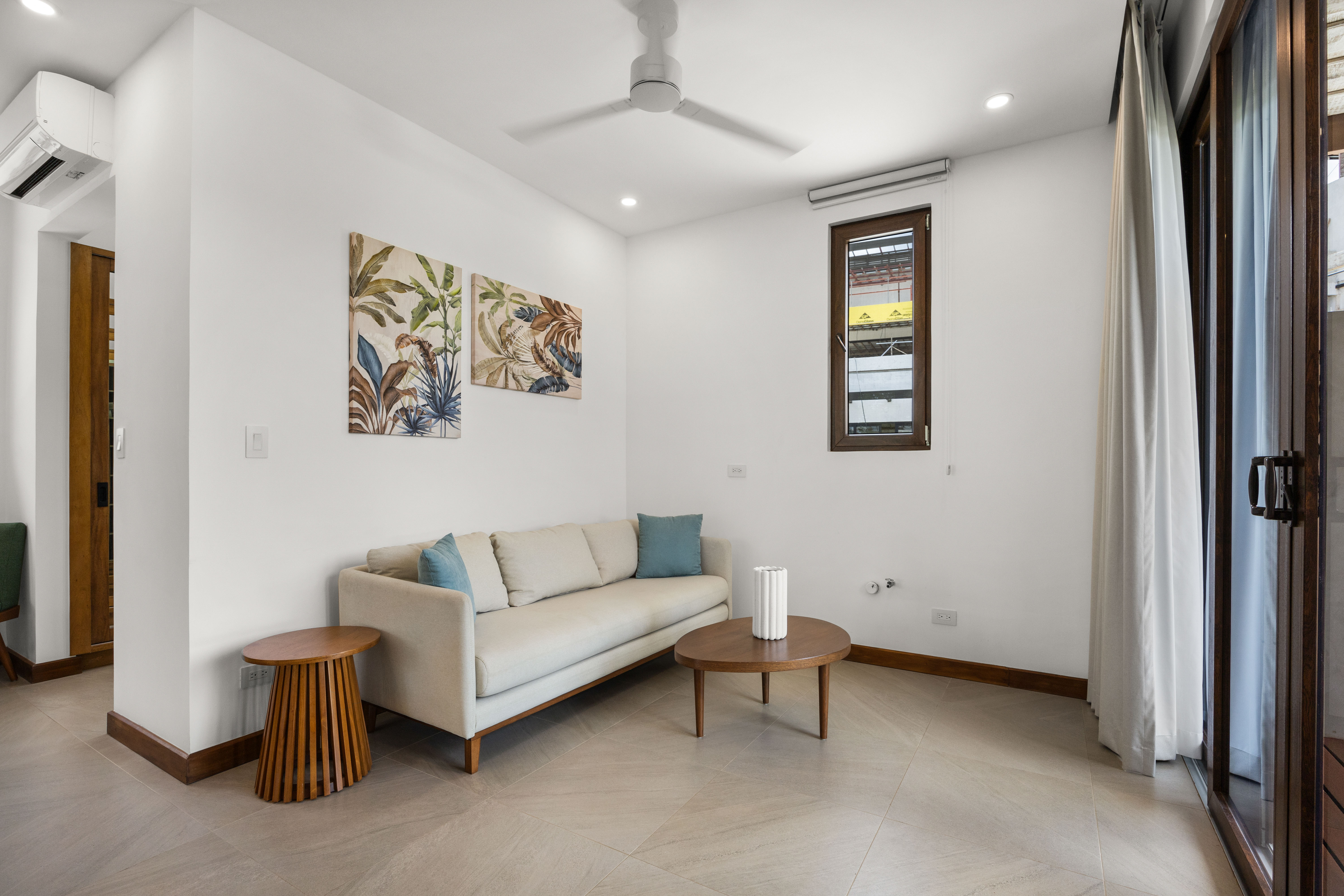Tranquila translates to serene, friendly, and calm, all words that this tropical home embodies. Model Home A is a stunning, three-story cream-colored contemporary home accented by brown trim and wooden trellises. The ground floor of this home serves as a comfortable and spacious garage for cars, bikes, or ATVs with ample storage space. The first floor has an internal access from the garage, as well as an external one, and upon entering you’ll find spacious rooms, floor-to-ceiling glass panels, and beautiful modern styling. The outside deck area and sparkling pool are simply the icing on the cake.