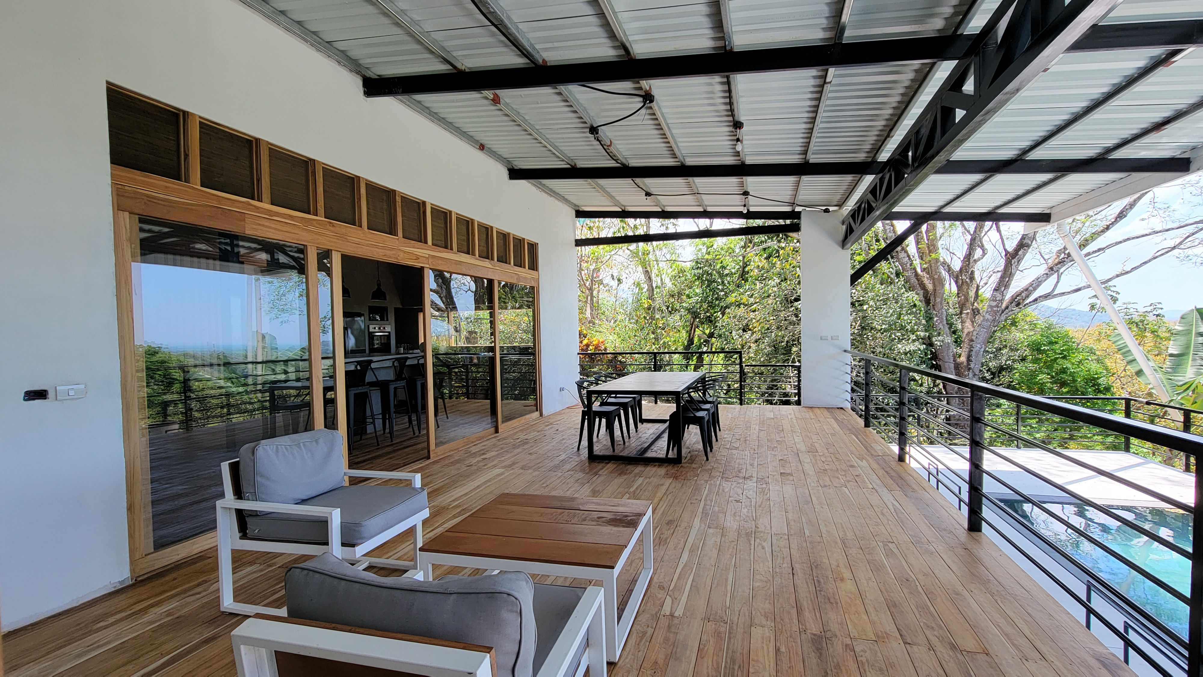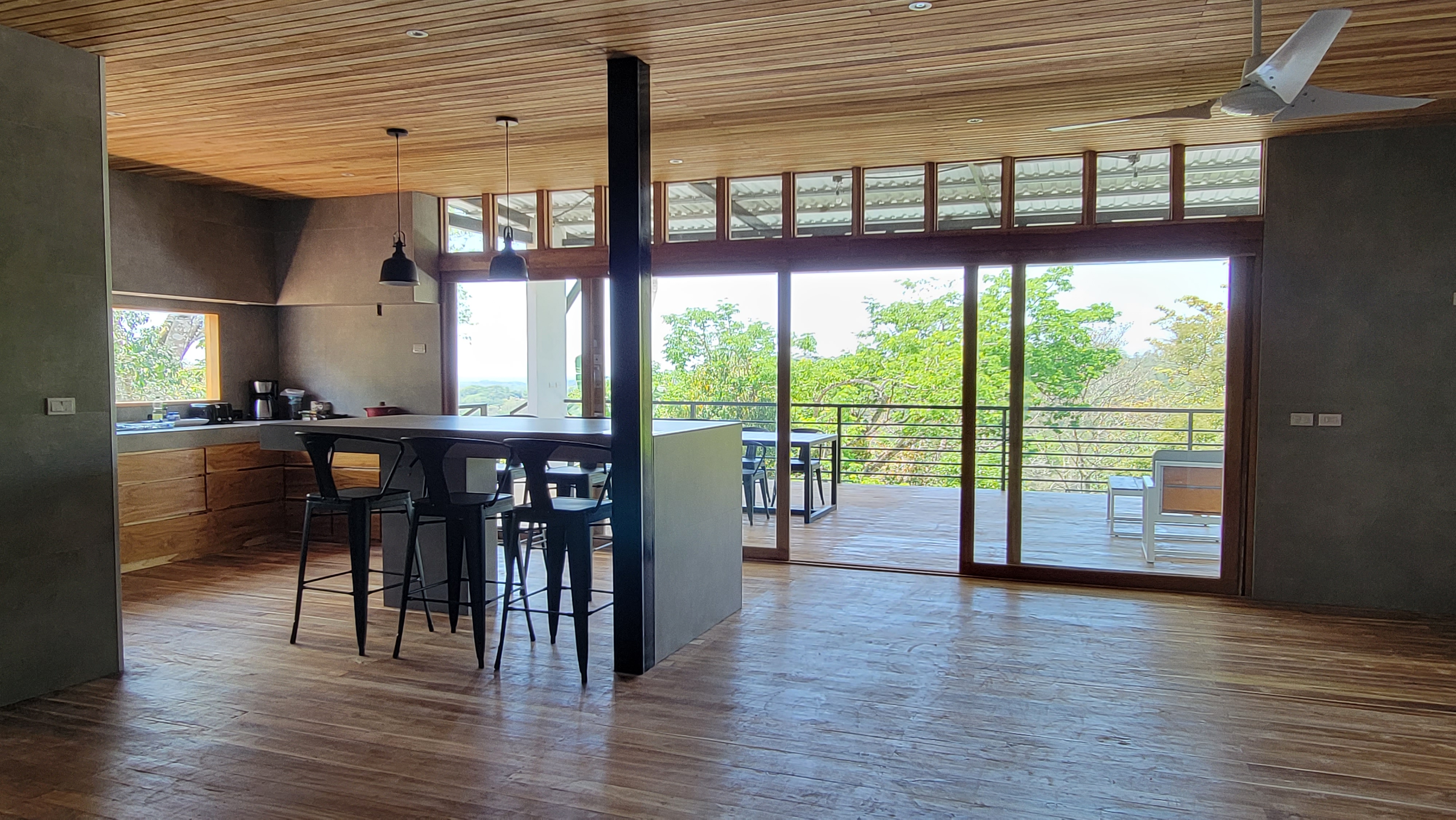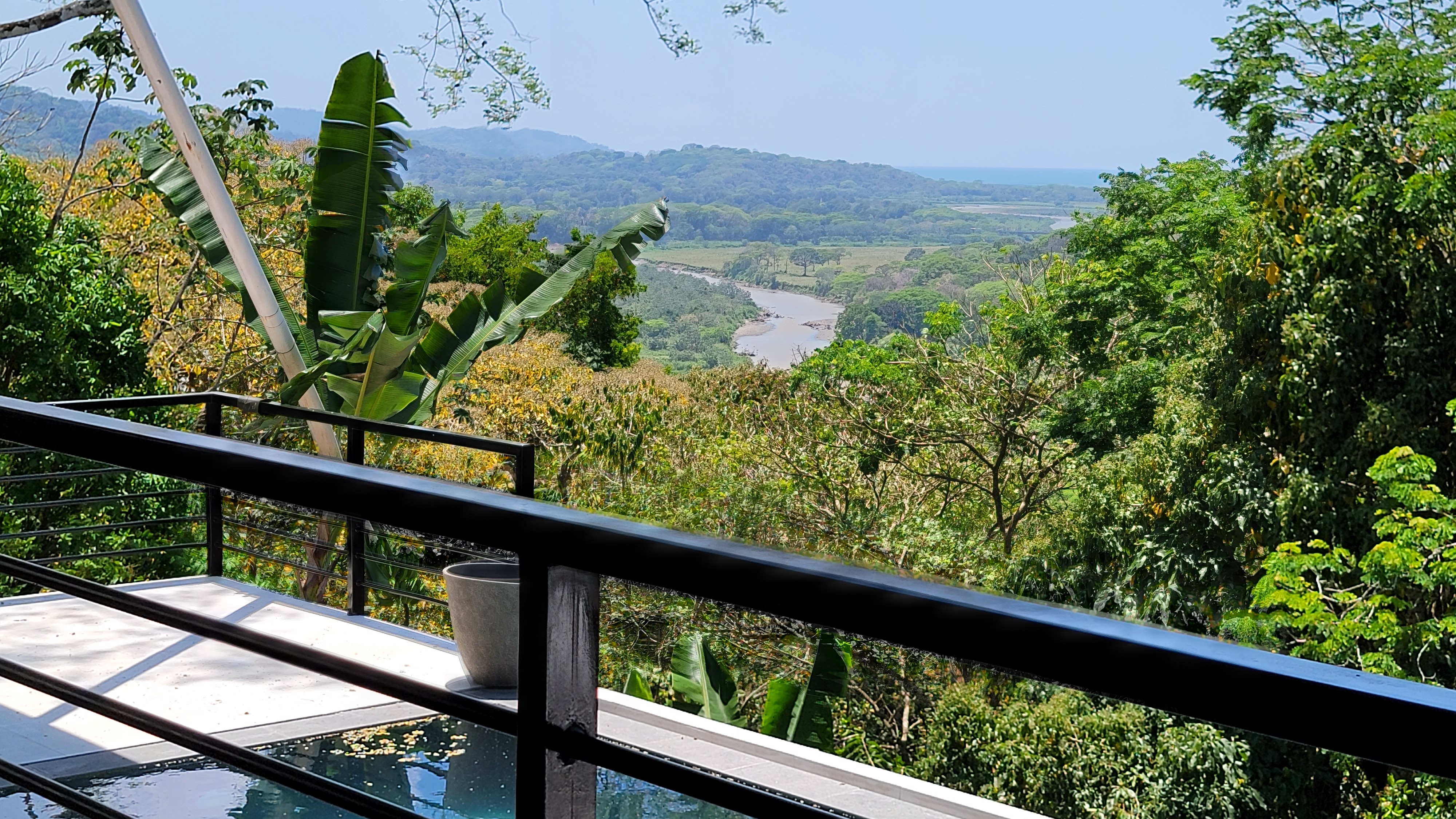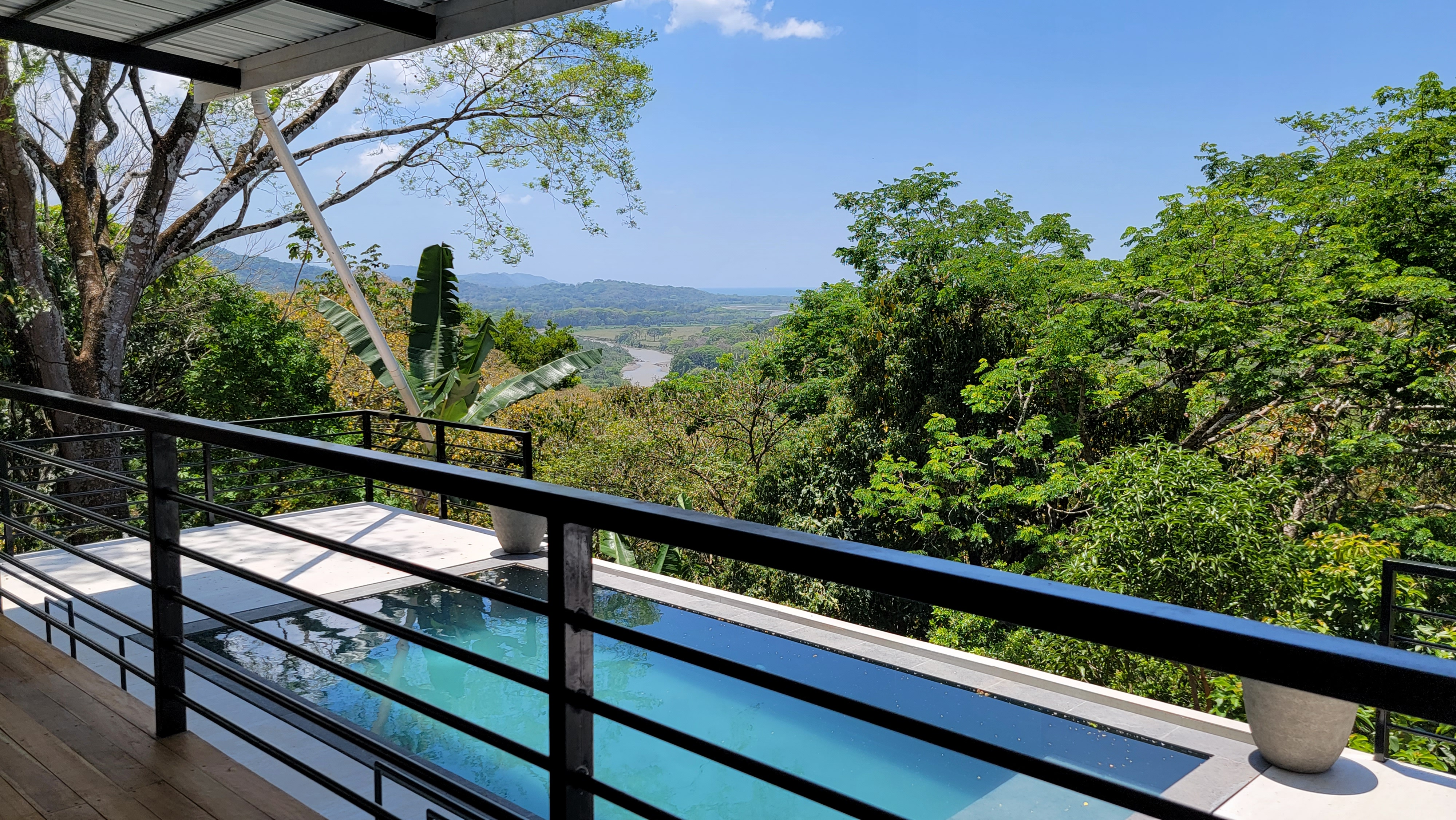 The first thing you notice when you walk into this stunningly beautiful home, are the beautiful teak wood floors and ceilings that provide an inviting warm feeling. Next you notice the breathtaking views through the floor to ceiling glass sliding doors which open to a beautiful covered teak wood entertainment deck overlooking the stunning rainforest river valley below. On top of the views being incredible, they can never be obscured as this home abuts the permanently protected Carara National Park Nature Preserve. With acres and acres of rainforest as your backyard backdrop, you will delight to see and hear all sorts of tropical birds, including toucans, humming birds, scarlet macaws and other wildlife, including monkeys, iguanas and coatis.