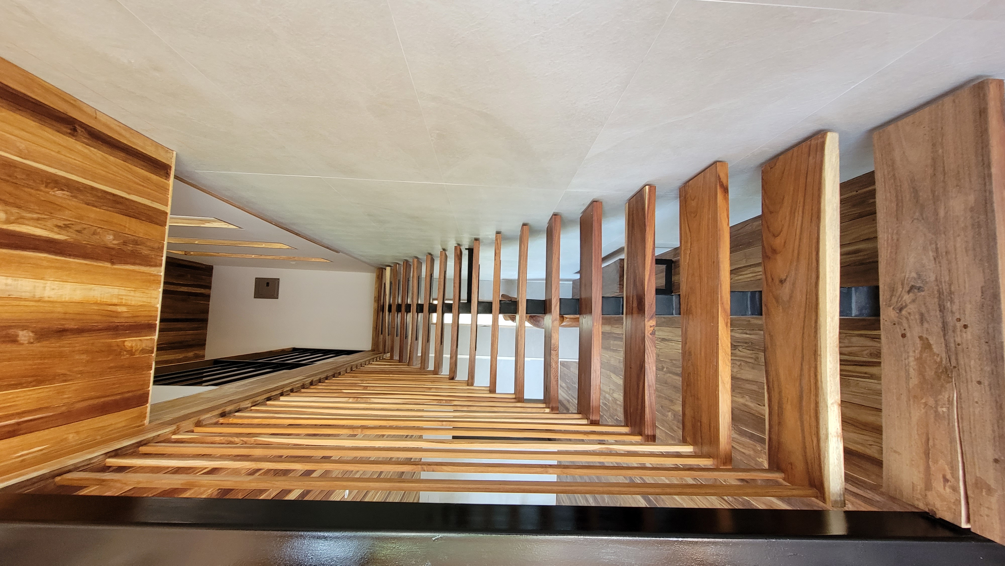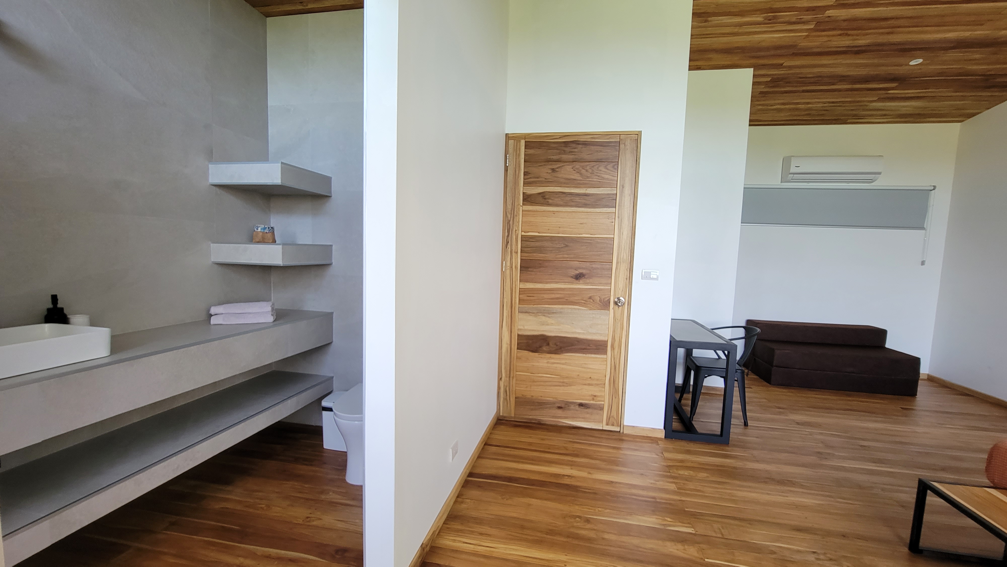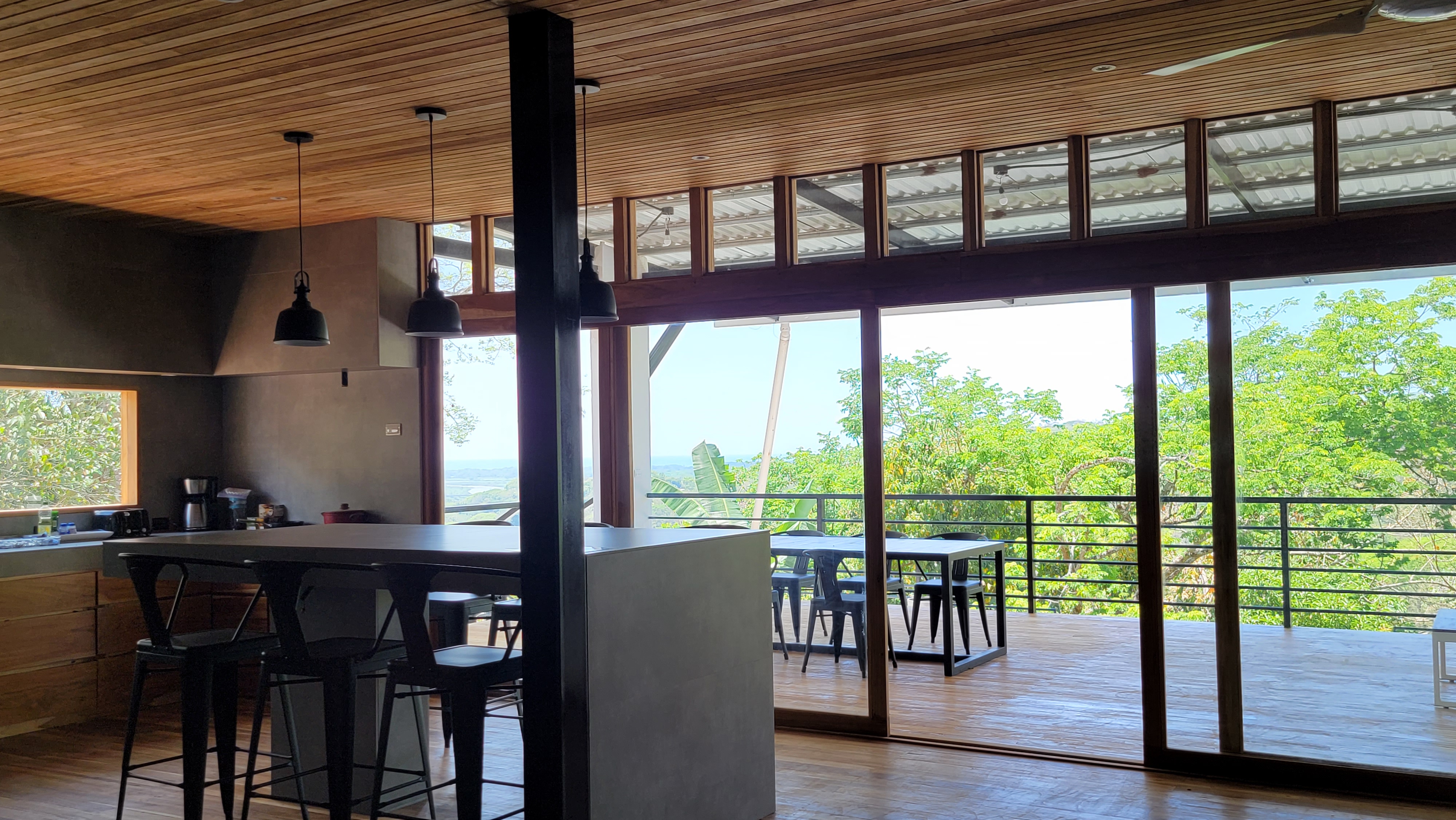 The house has a gated carport with a few large poured concrete steps leading down to its first entry level. This first level boasts a large open concept kitchen with polished concrete counters and dining table, an inviting living space, a guest half bath, laundry room, storage closet and the first of three master bedrooms, each with en suite bath. The first level bedroom takes full advantage of the amazing views with giant wood framed glass sliding doors to enjoy the view and mountain breezes too. On this floor, you can step out on your beautiful teak wood deck from the living area or bedroom to enjoy breathtaking sunsets over the river and ocean, moonlit nights and the sights and sounds of the jungle too.