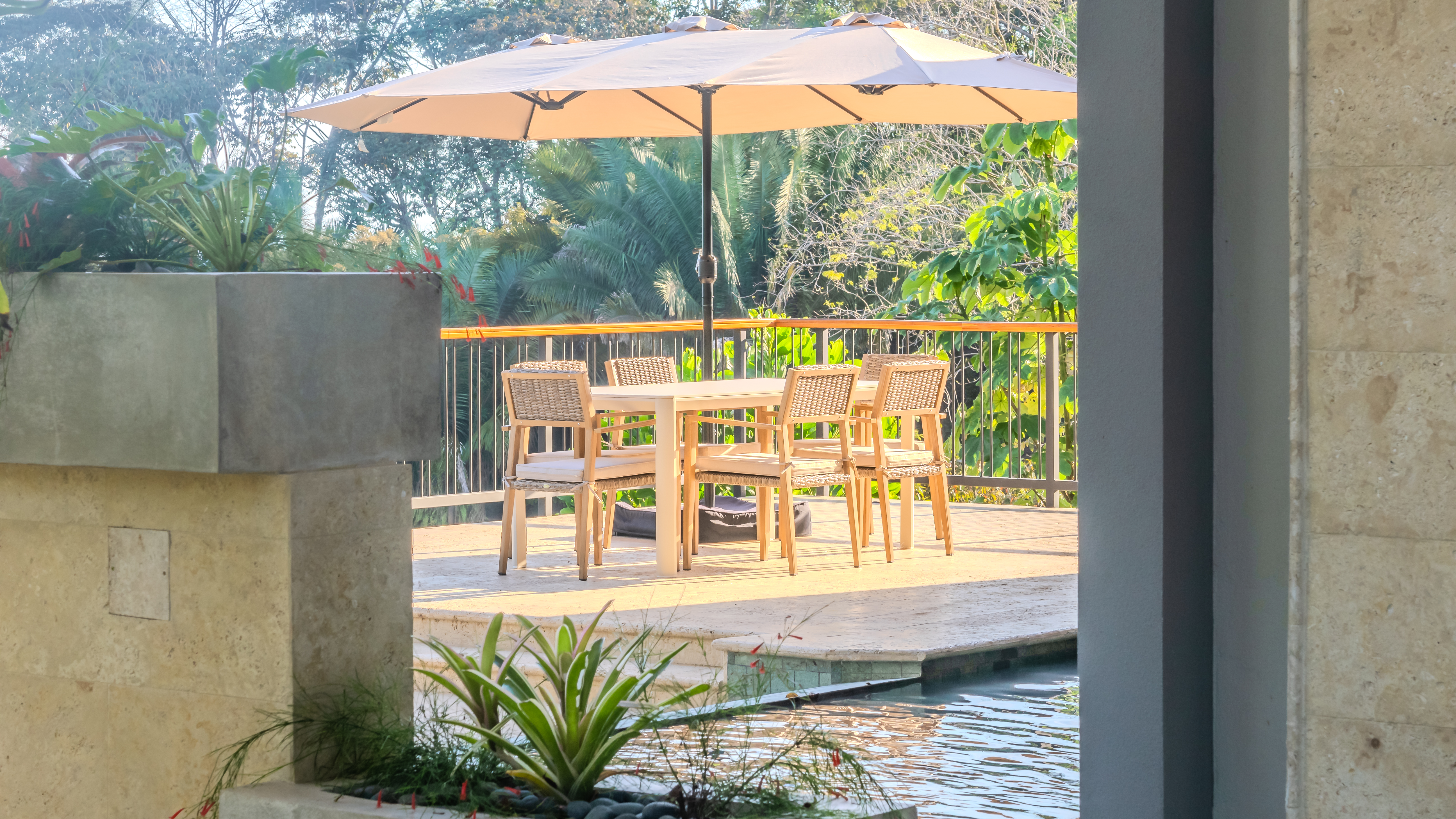 Outdoor Living Spaces: Impeccably landscaped gardens surround the estate, featuring a private pool with stunning jungle vistas, lush greenery, and a spacious patio—an idyllic setting for outdoor entertaining or tranquil reflection.
