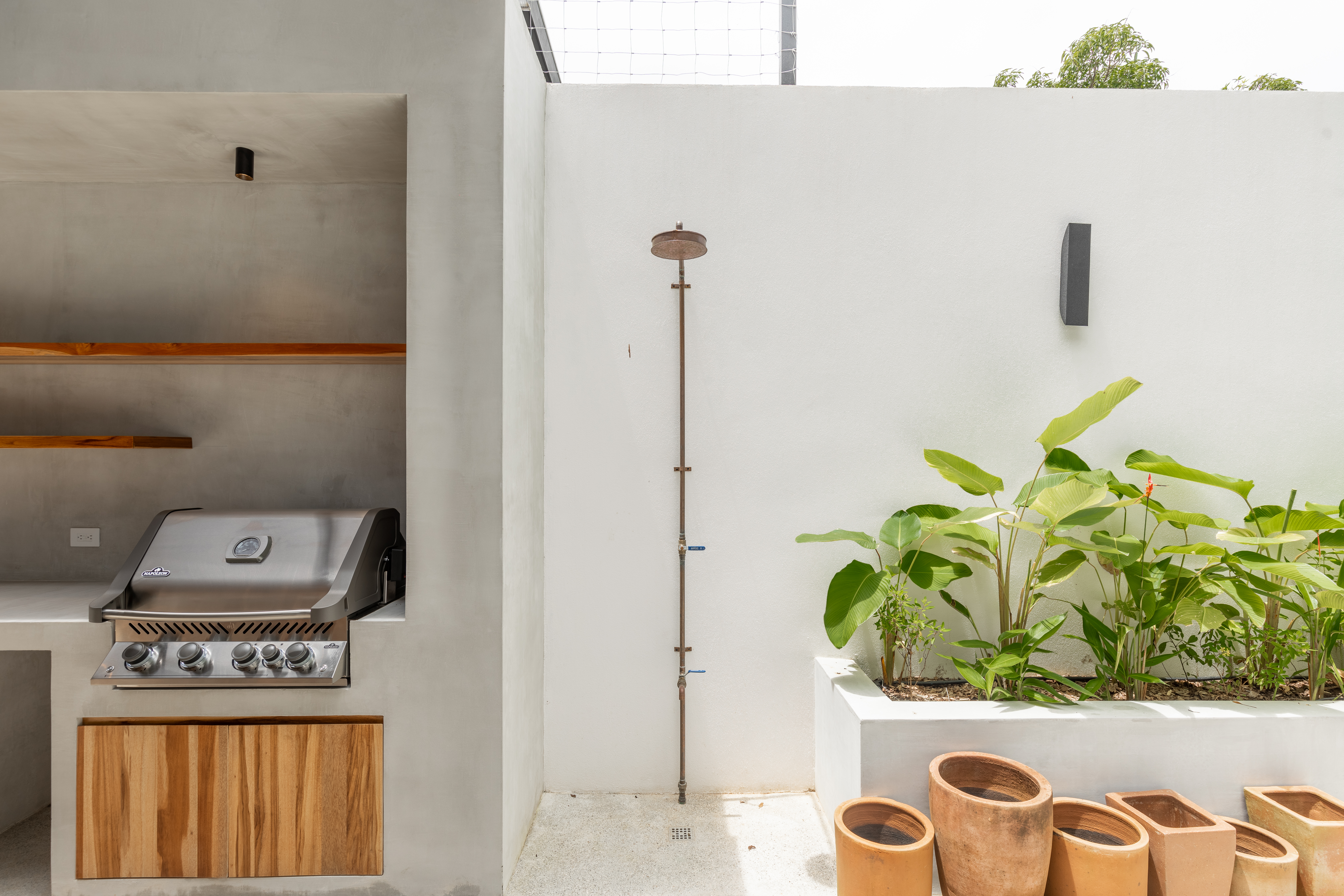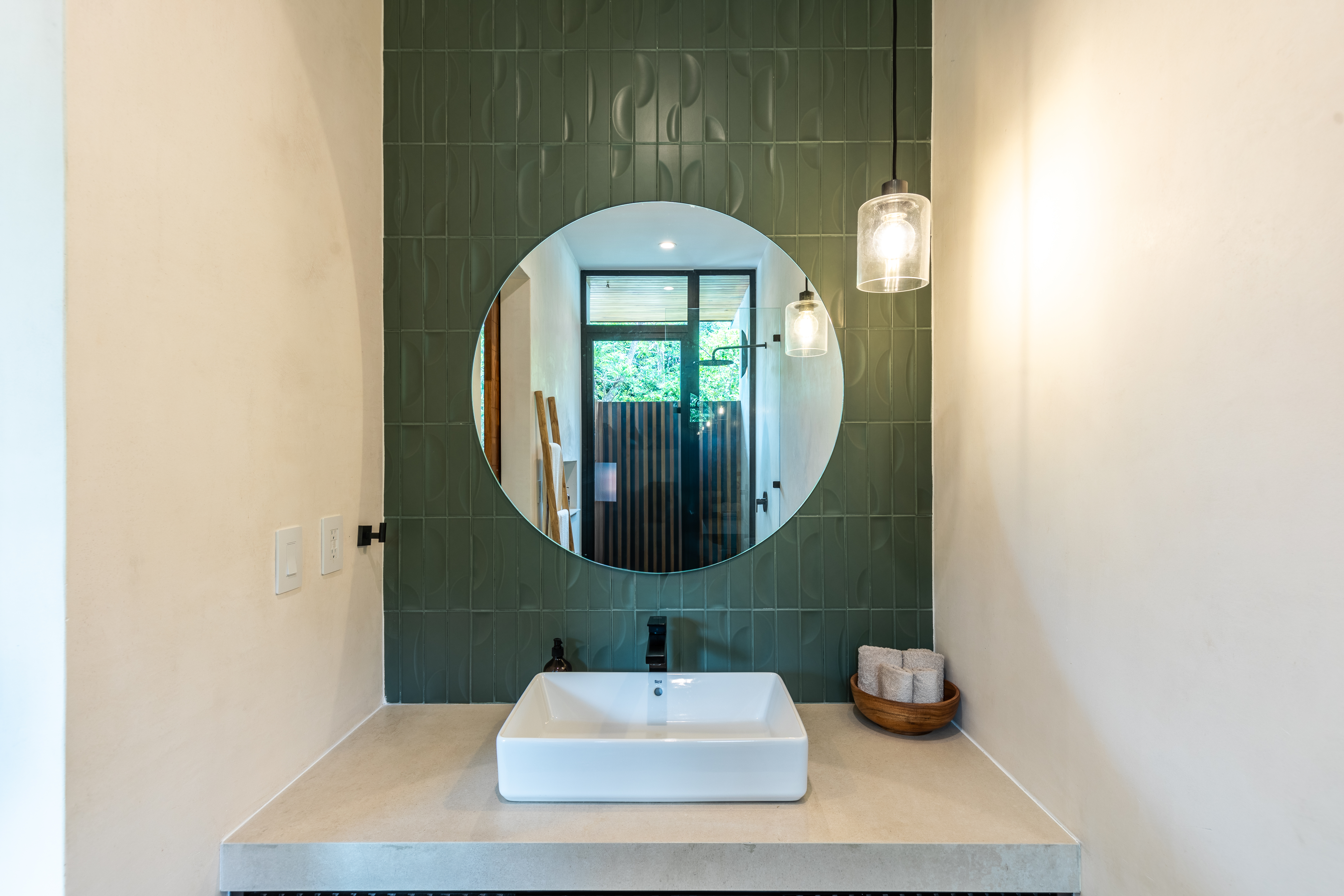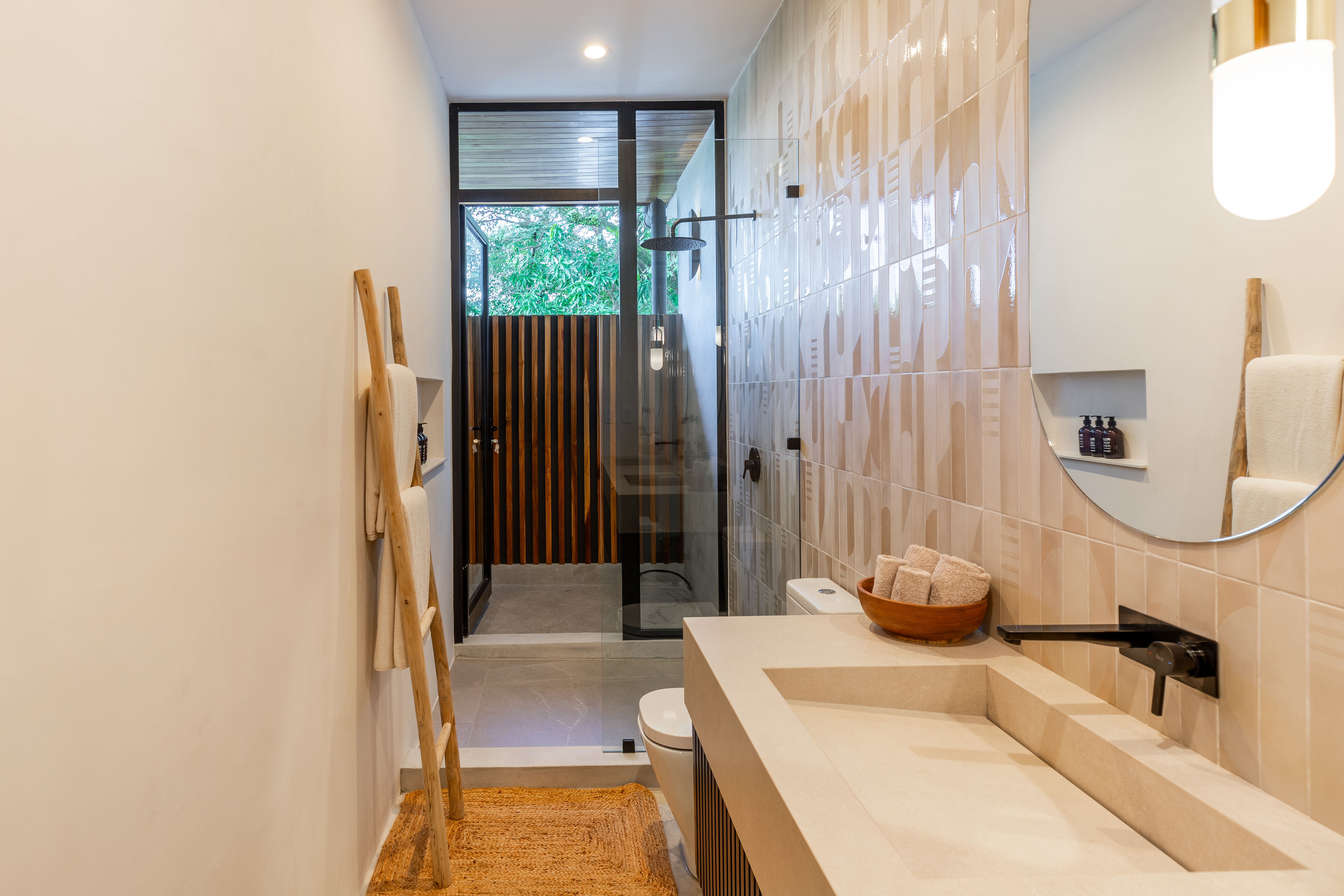 Private Pool with Jungle Views: Lounge by the pool on elegant sunbeds or cool off in the outdoor shower after a day at the beach.