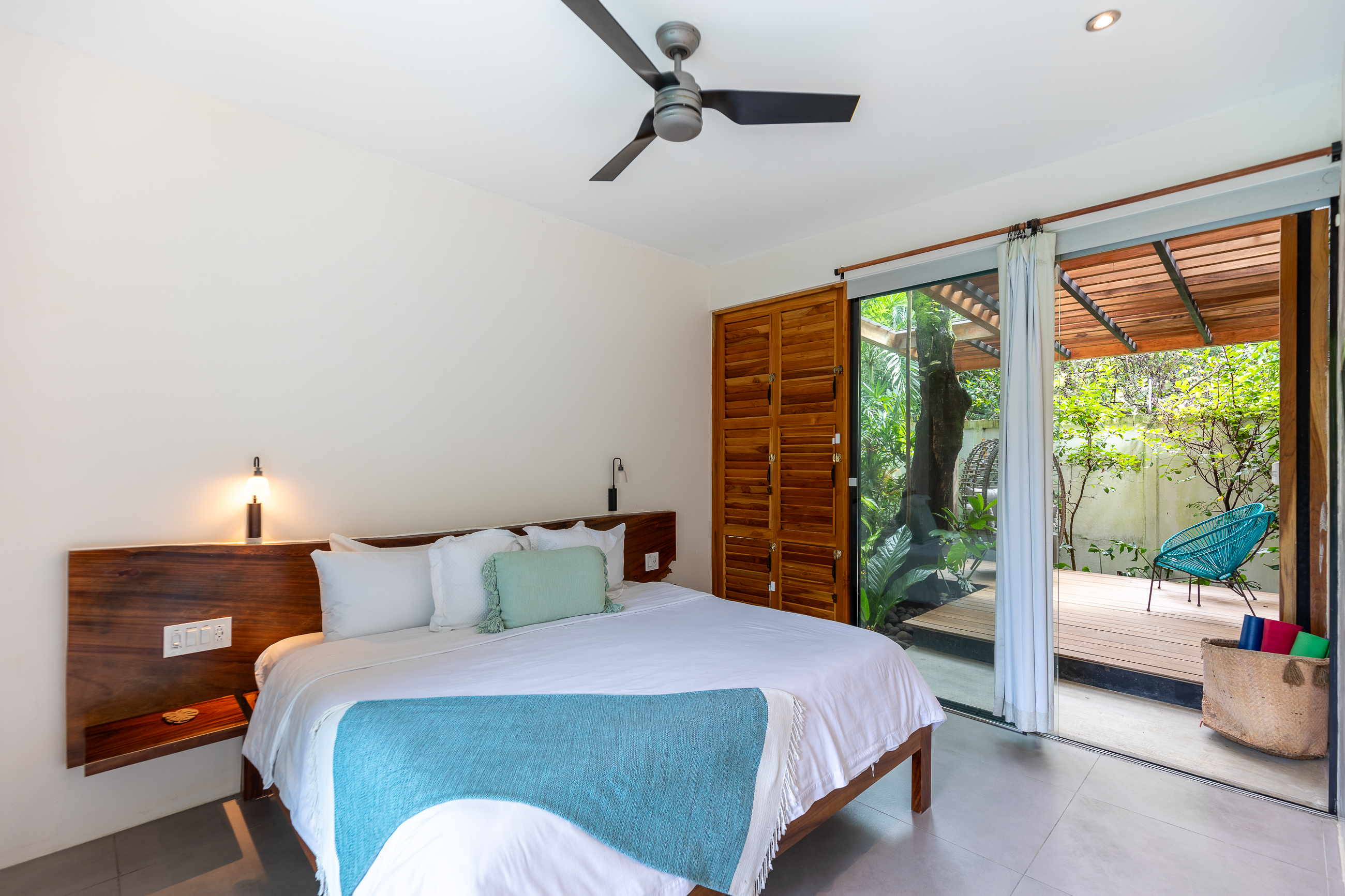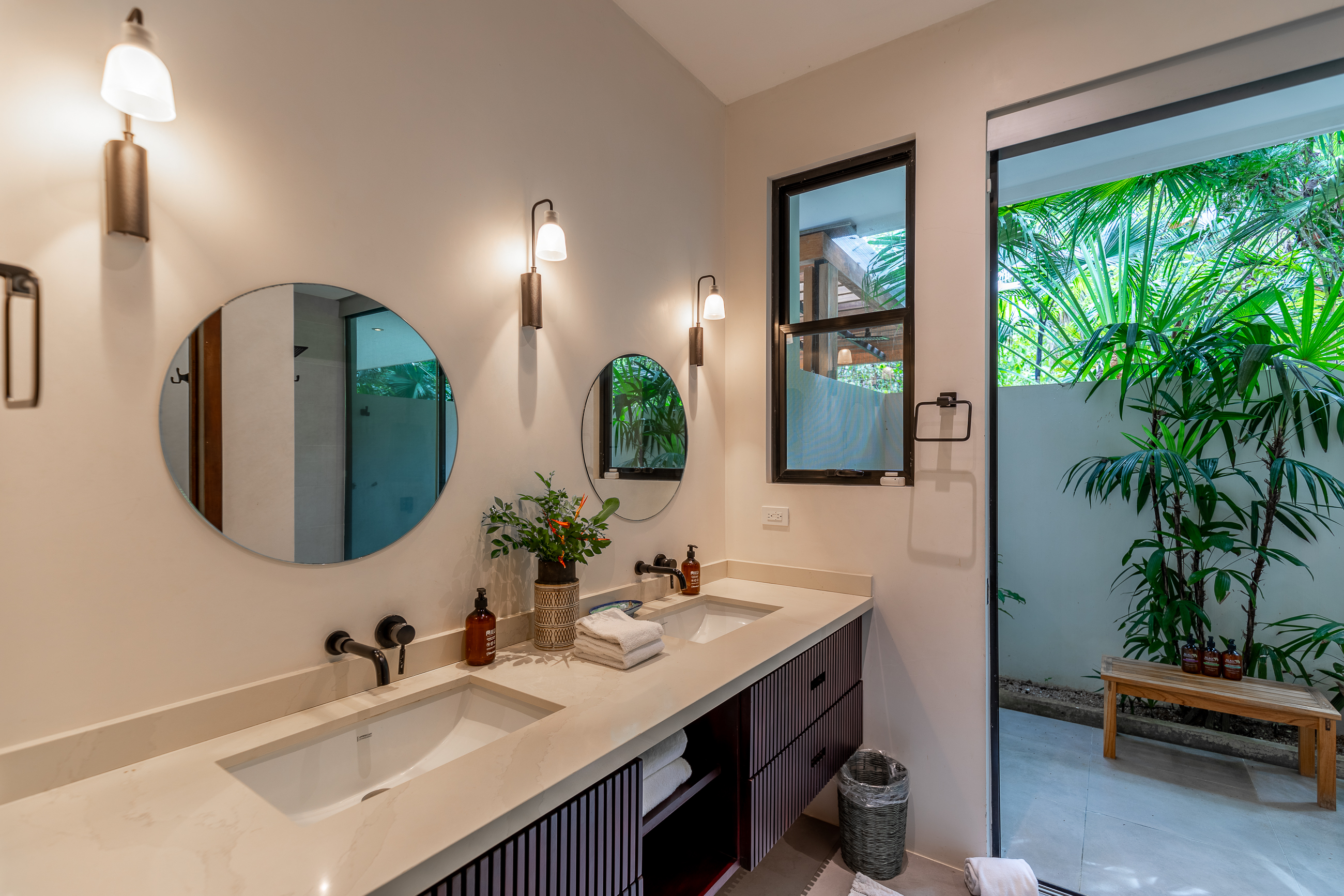 A new outdoor lounge area was added in 2021, with built-in cushioned seating, a large terrazzo table, and overhead lighting, all surrounded by the jungle and mature landscaping. This private area is a great place to socialize, kick up your feet and enjoy a glass of wine after a day at the beach. Also, a covered, private yoga shala that overlooks the jungle was added in 2021. The yoga shala is completely private where you will only hear the sounds of birds and monkeys as you focus on your daily yoga or meditation practice. A wicker hammock hangs in the corner of the shala for a perfect spot to read or relax.