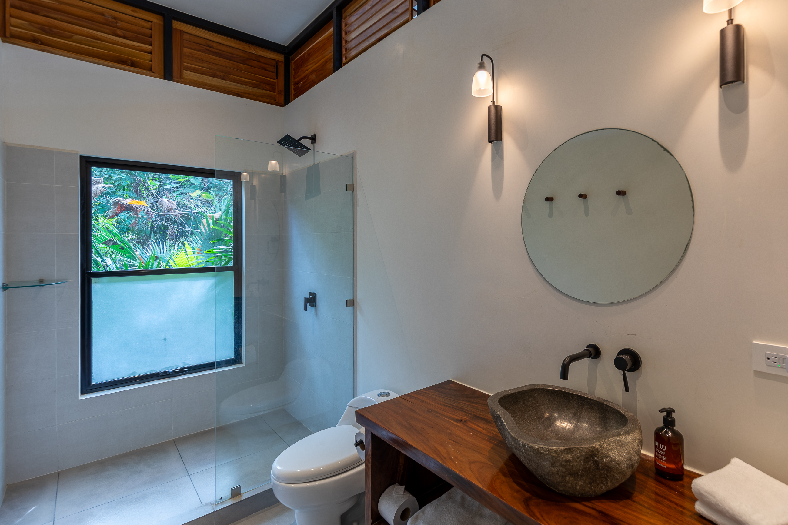 There are 3 bedrooms and 3 bathrooms, plus a main floor powder room. Each bedroom includes a ceiling fan, an en-suite bathroom, creating three Primary suites, as well as its own air condition unit. The main floor Primary steps out to the pool in the front. In addition to the indoor shower, you can step out into a large, outdoor garden shower that is fully enclosed. Upstairs, the second Primary suite opens to a French balcony overlooking the pool, while the third Master suite opens to a balcony overlooking the hillside jungle.