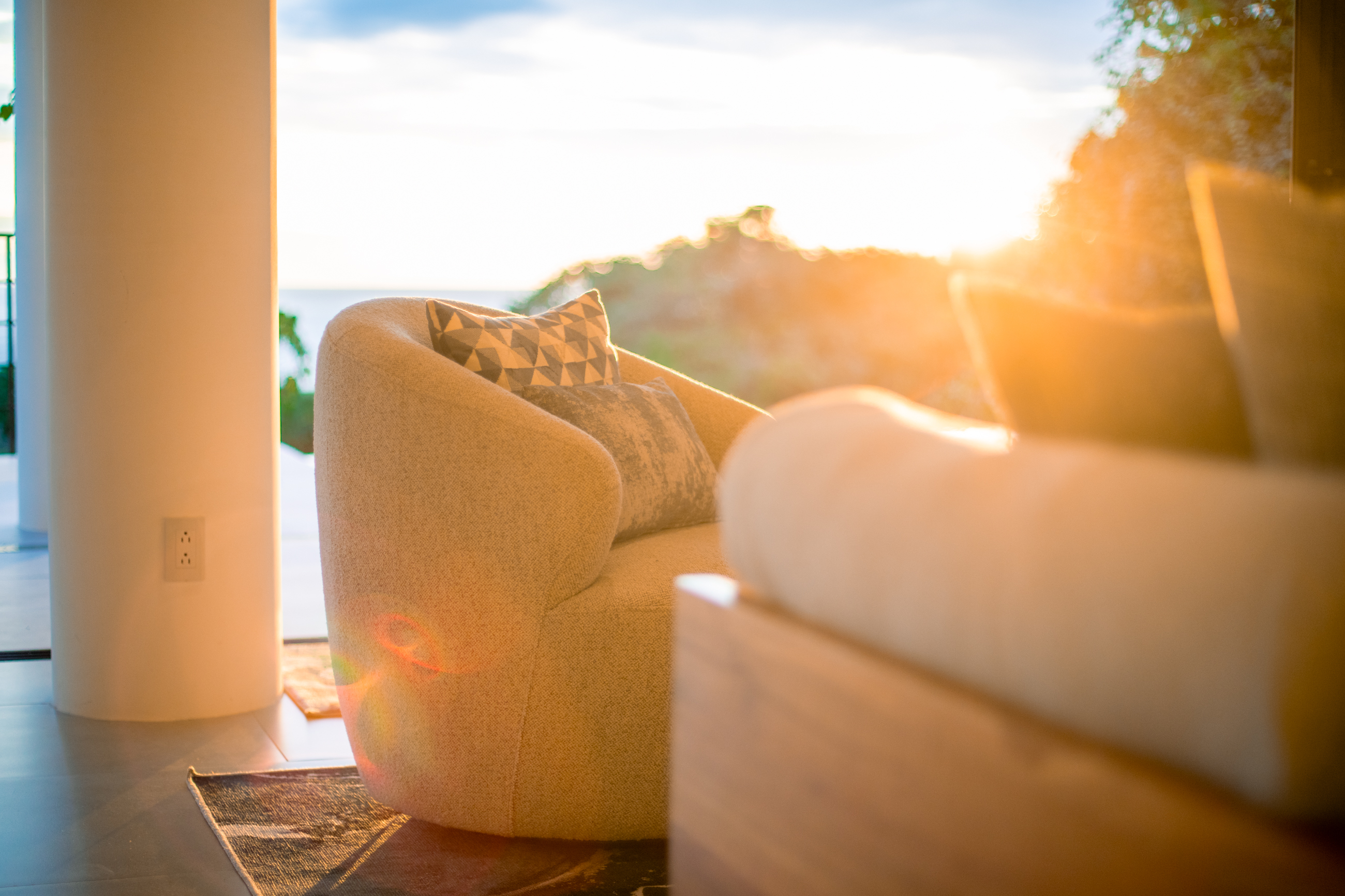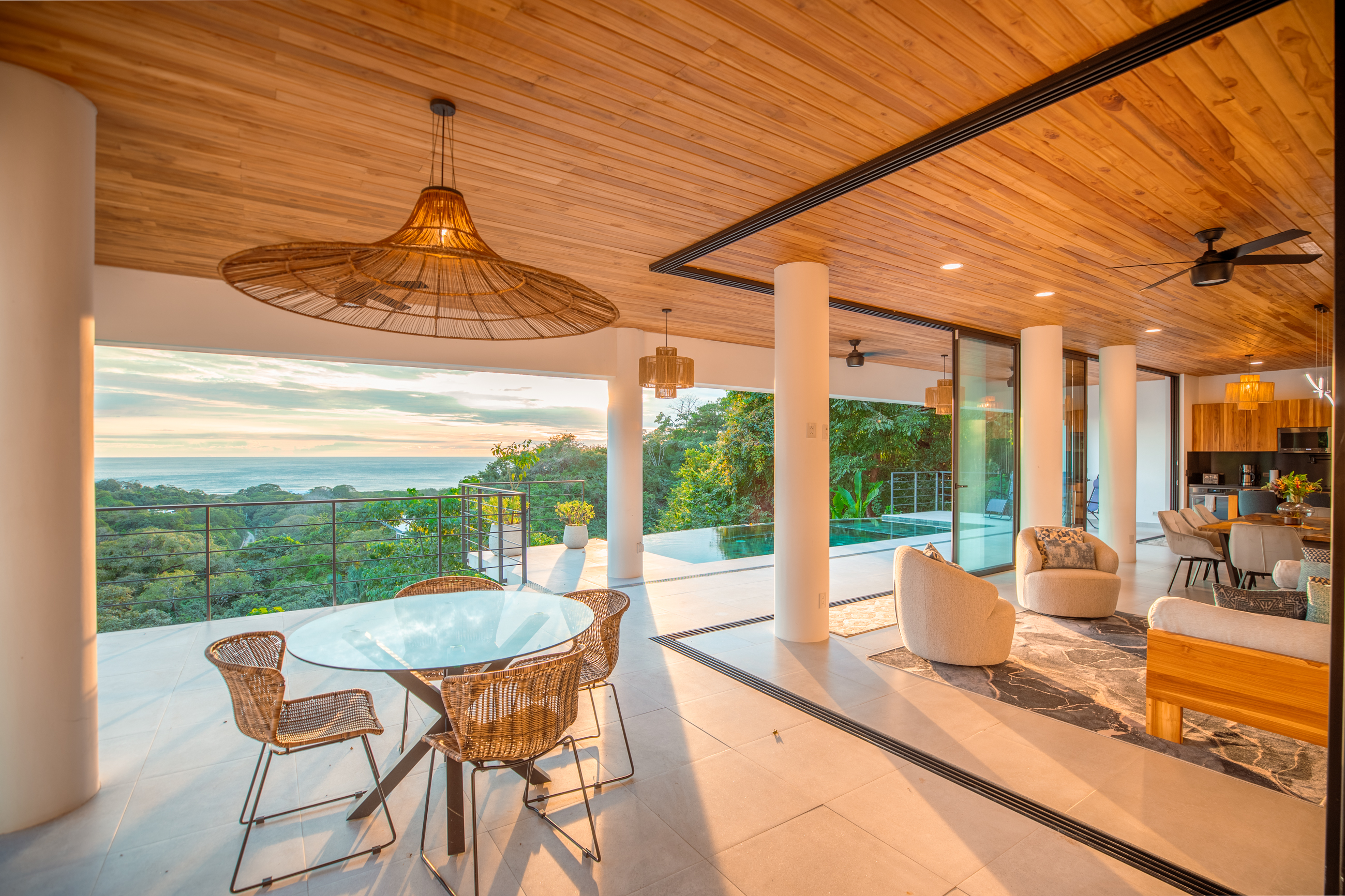 The villa emanates an atmosphere of airy spaciousness, with an open-concept design that encourages gatherings. In the state-of-the-art gourmet kitchen, you'll find a wine fridge and ice maker, complemented by custom cabinetry crafted from locally sourced wood and stone materials. Blurring the boundaries between indoor and outdoor living, expansive glass windows and sliding doors reveal a mesmerizing panorama and endless ocean expanse.