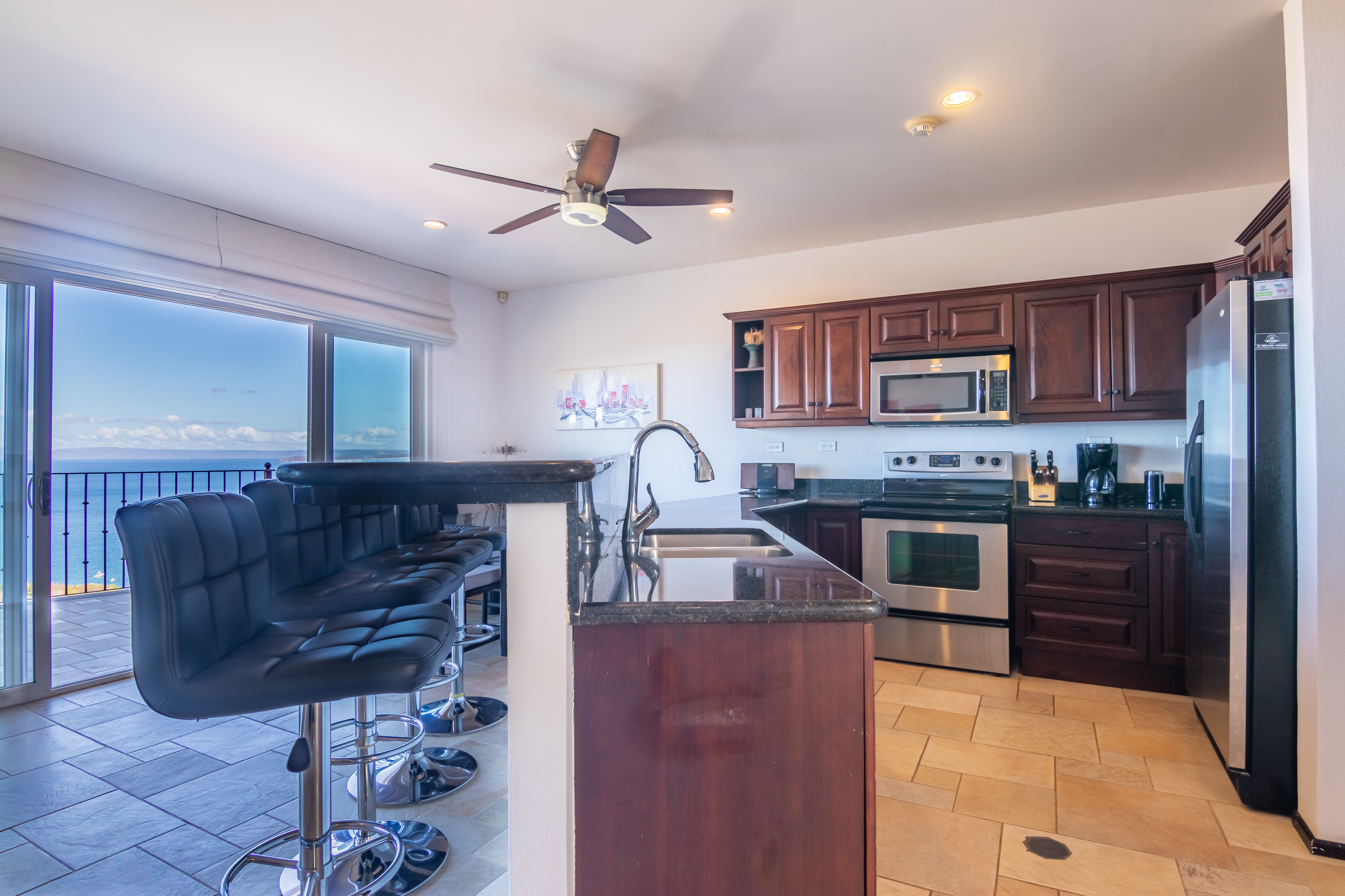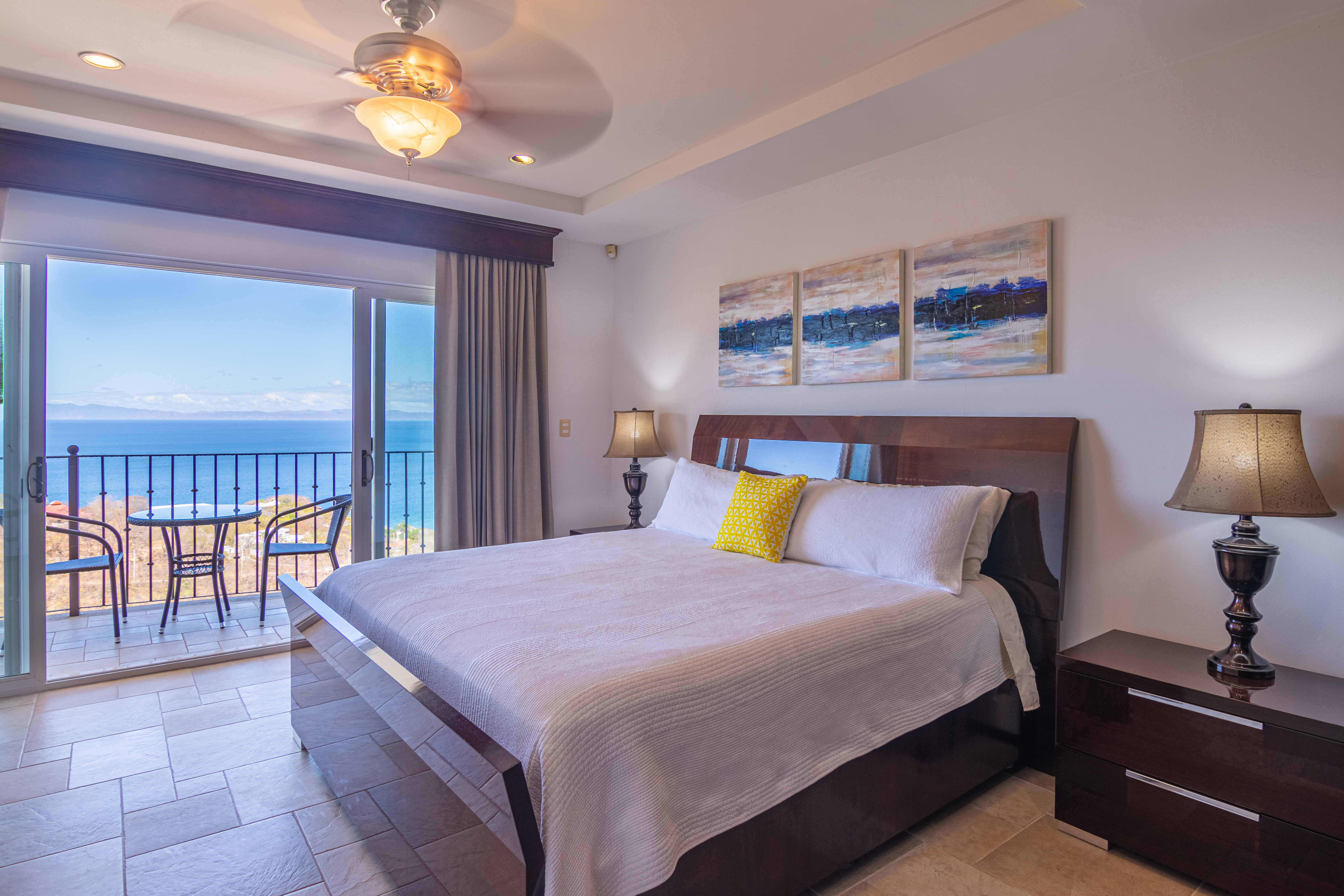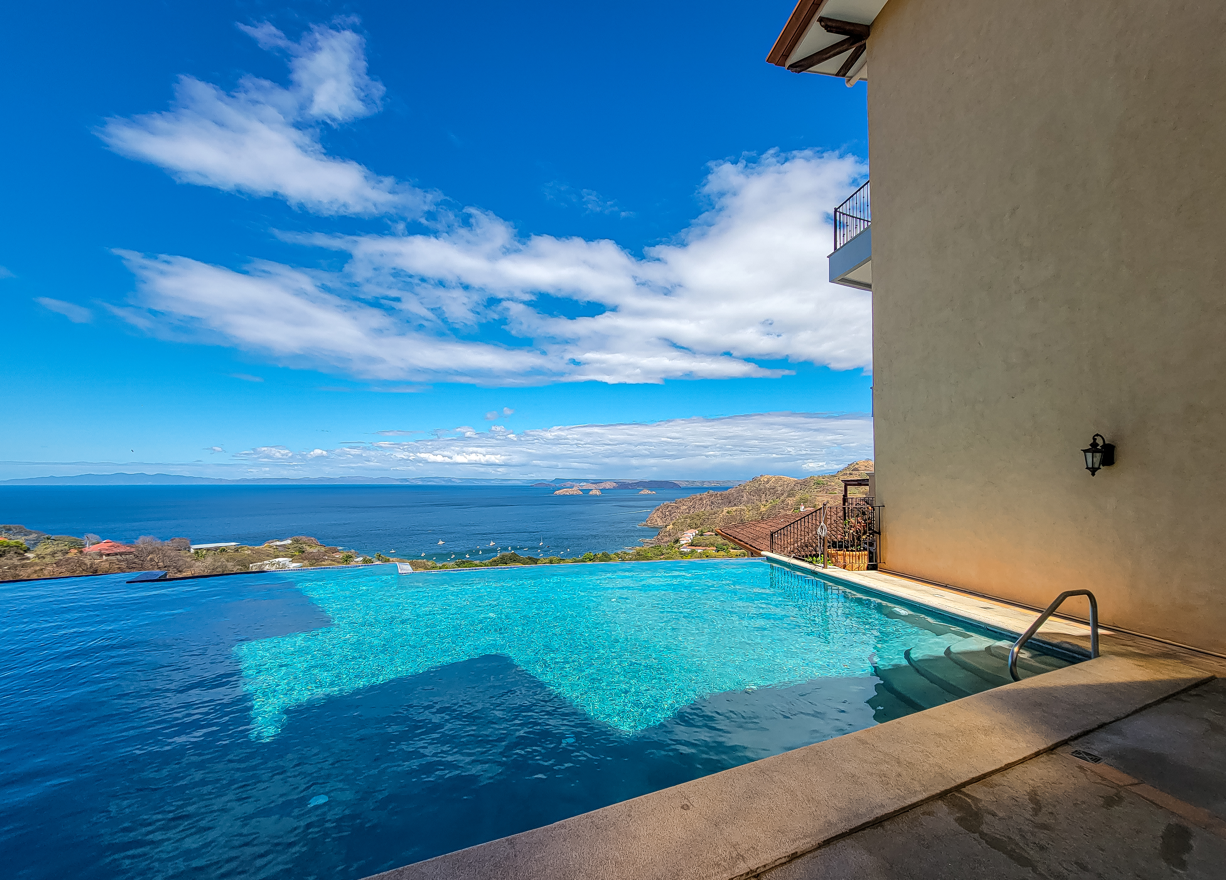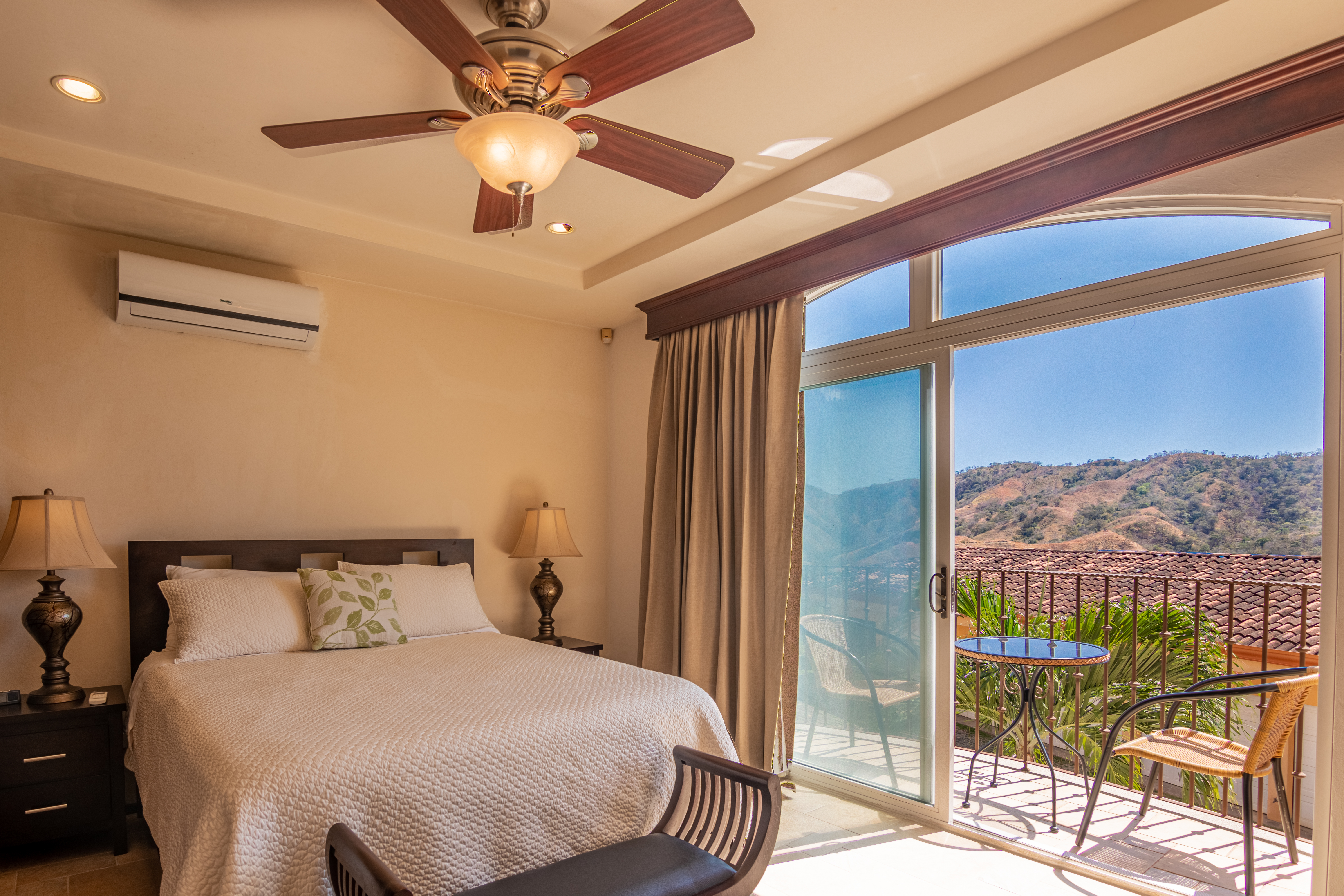 Enjoy luxury living in Corona Del Mar gated development with only 12 units offering the best ocean views’ condos in the area. Be amazed by the spectacular panorama of the Pacifico Ocean, mountains and Santa Rosa National park as you enter the main door of this two-level 2,860 sf fully furnished and equipped unit. Living and dining areas offer ample space for entertaining and open up to a large balcony. The spacious kitchen has hardwood cabinets, granite countertops and stainless-steel appliances. One of the bedrooms is conveniently located on the main level. Second level accommodates three more bedrooms. The master suite includes a walk-in-closet and en-suite bath. All upper bedrooms have good size patios to enjoy the magnificent views all around. This condo is located very close to the oversized infinity pool that comes with a lounge and BBQ areas. Each unit has a separate enclosed garage and a storage unit. The development offers an equipped ocean view gym, gated entry and a guard on site. Only few minutes to most beautiful beaches, 10 minutes from center of Playas del Coco with all the amenities, and 30 minutes to Liberia International Airport. Don’t delay living your dreams and call today to inquire!