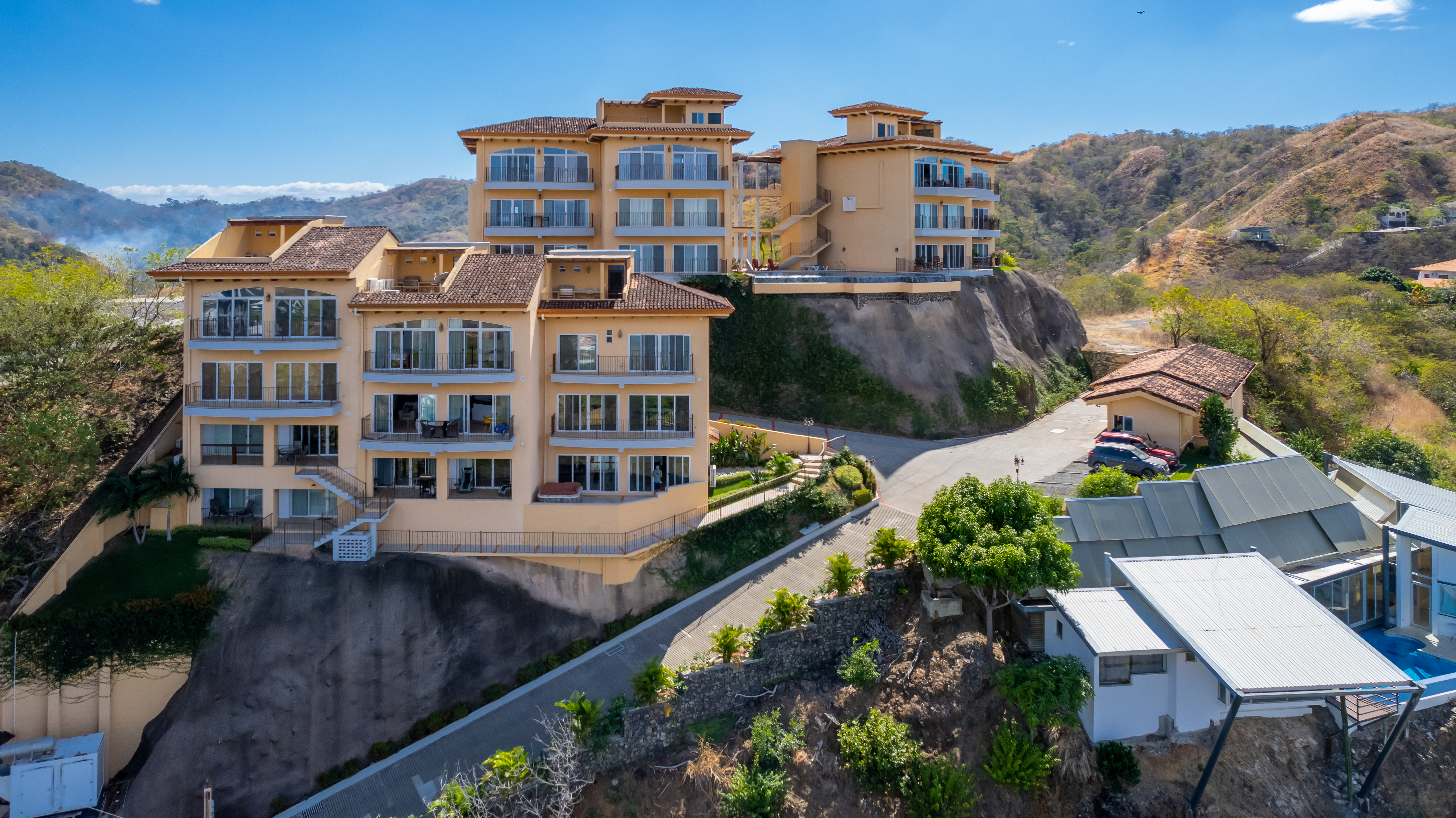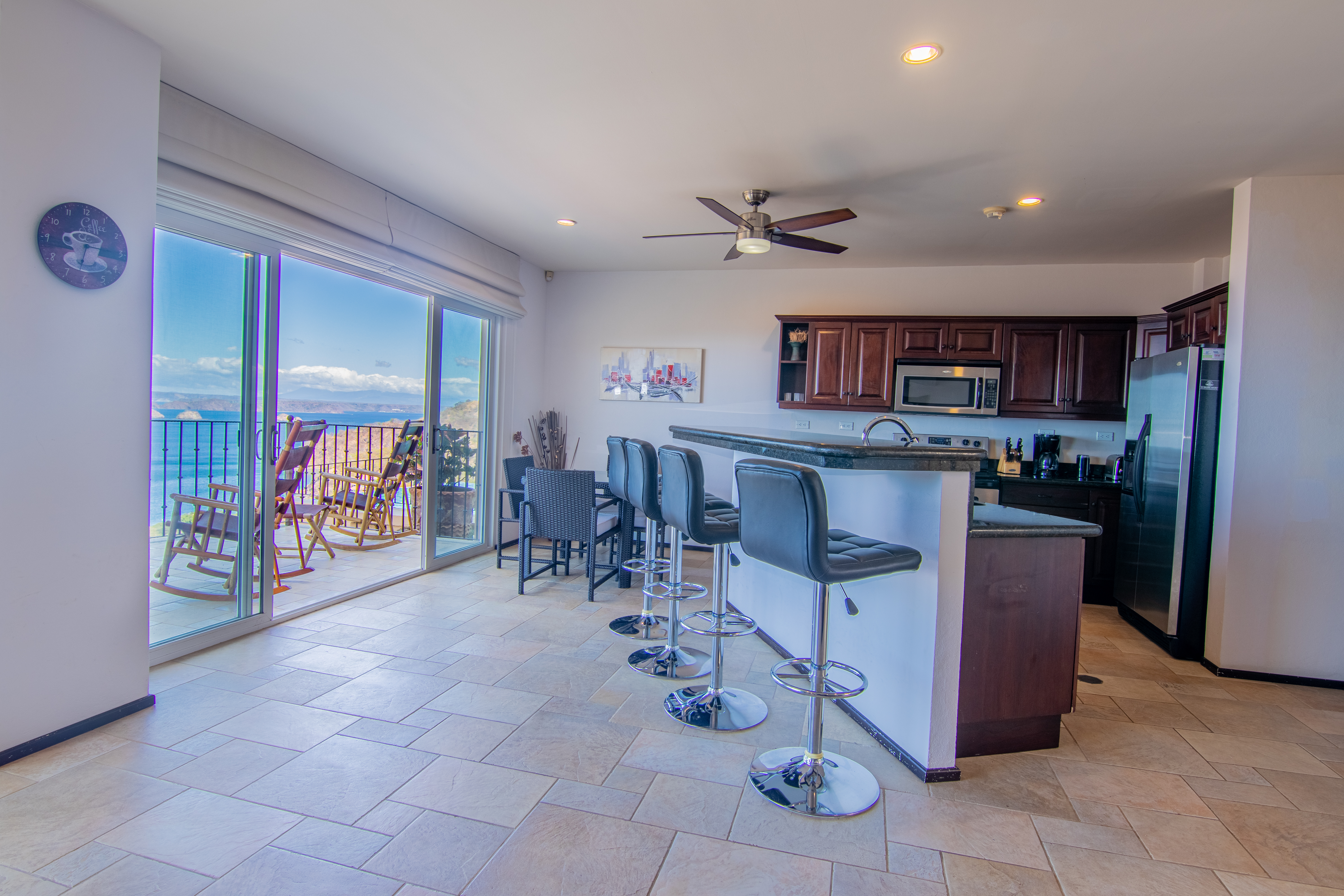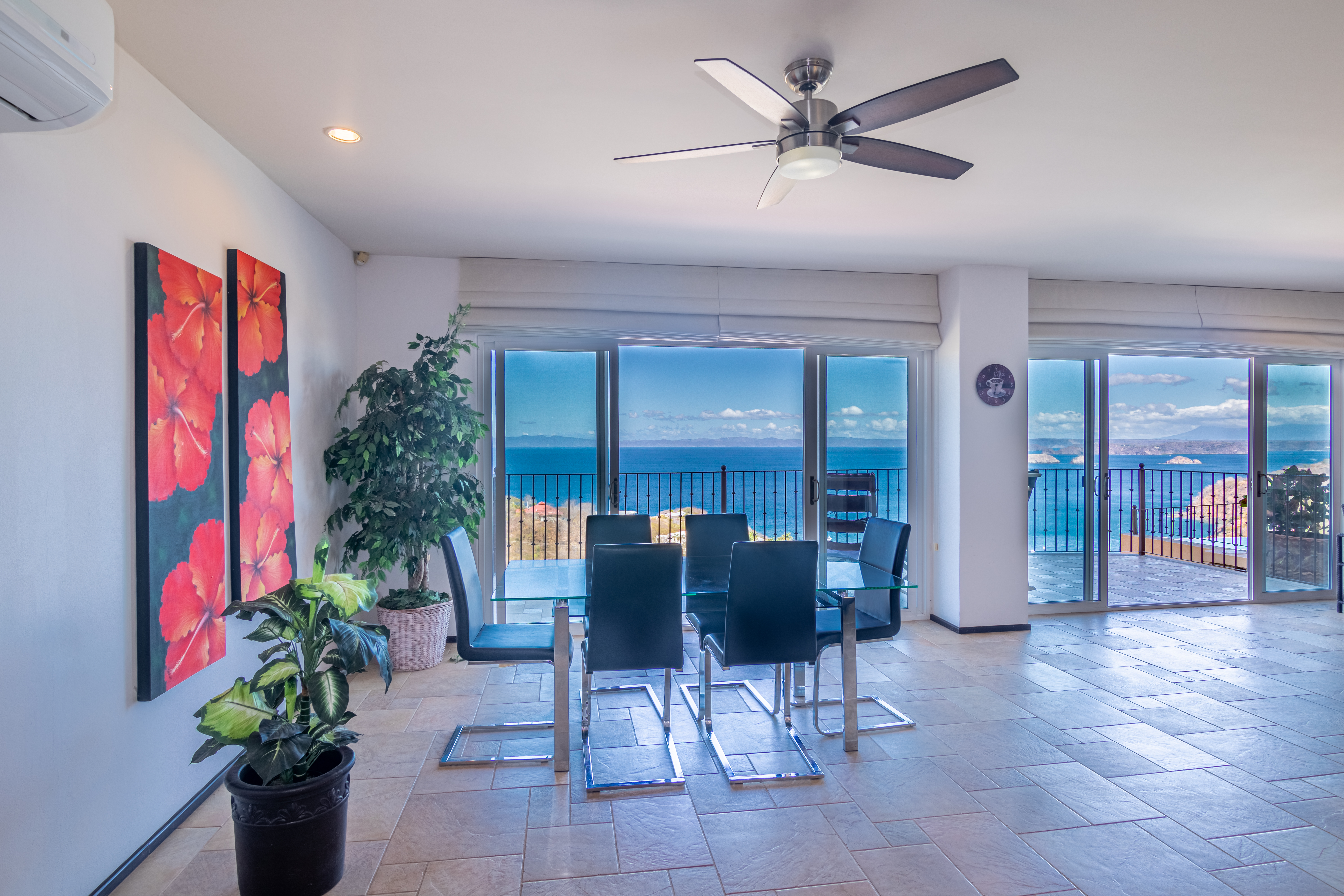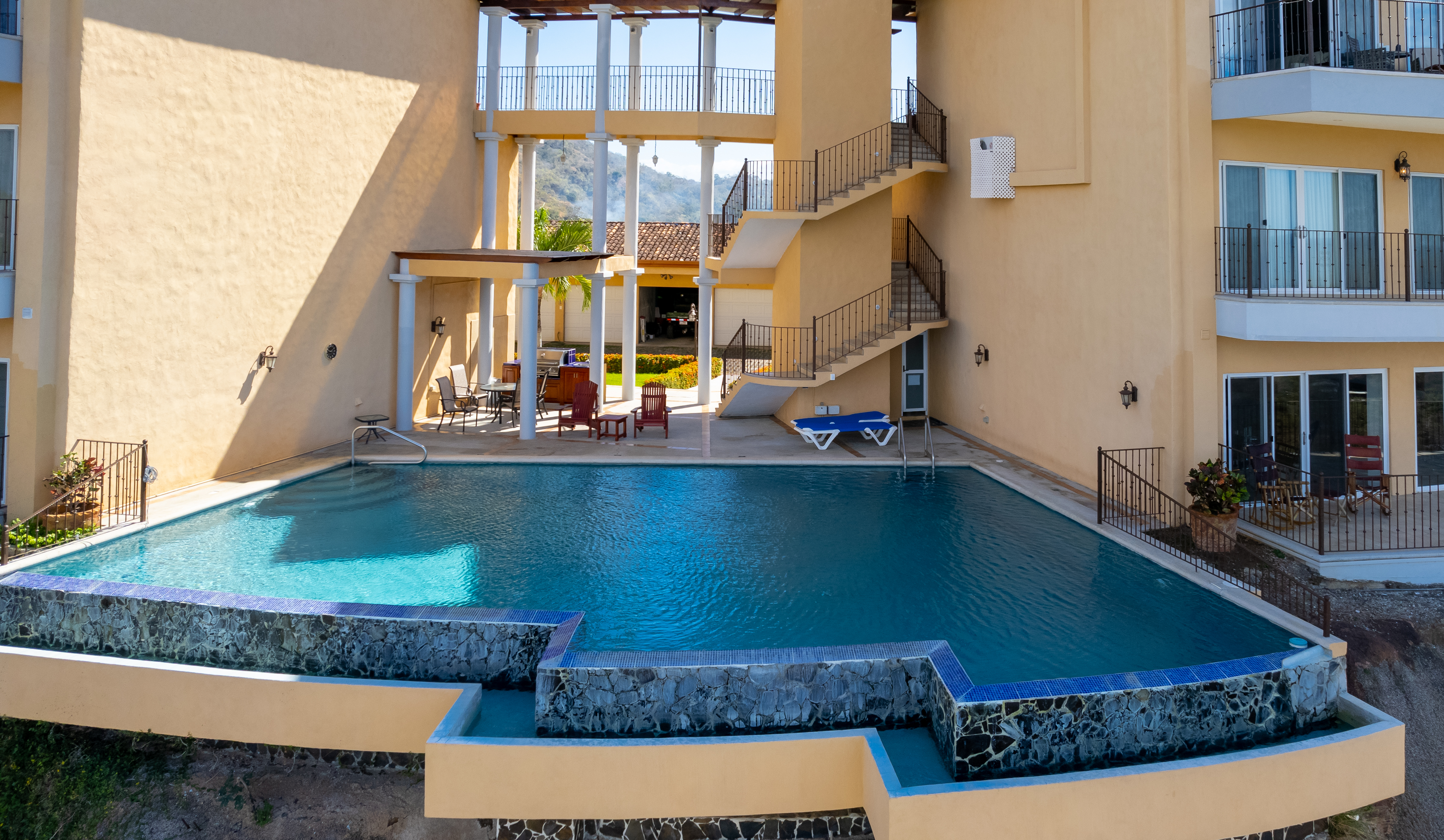Enjoy luxury living in Corona Del Mar gated development with only 12 units offering the best ocean views’ condos in the area. Be amazed by the spectacular panorama of the Pacifico Ocean, mountains and Santa Rosa National park as you enter the main door of this two-level 2,860 sf fully furnished and equipped unit. Living and dining areas offer ample space for entertaining and open up to a large balcony. The spacious kitchen has hardwood cabinets, granite countertops and stainless-steel appliances. One of the bedrooms is conveniently located on the main level. Second level accommodates three more bedrooms. The master suite includes a walk-in-closet and en-suite bath. All upper bedrooms have good size patios to enjoy the magnificent views all around. This condo is located very close to the oversized infinity pool that comes with a lounge and BBQ areas. Each unit has a separate enclosed garage and a storage unit. The development offers an equipped ocean view gym, gated entry and a guard on site. Only few minutes to most beautiful beaches, 10 minutes from center of Playas del Coco with all the amenities, and 30 minutes to Liberia International Airport. Don’t delay living your dreams and call today to inquire!