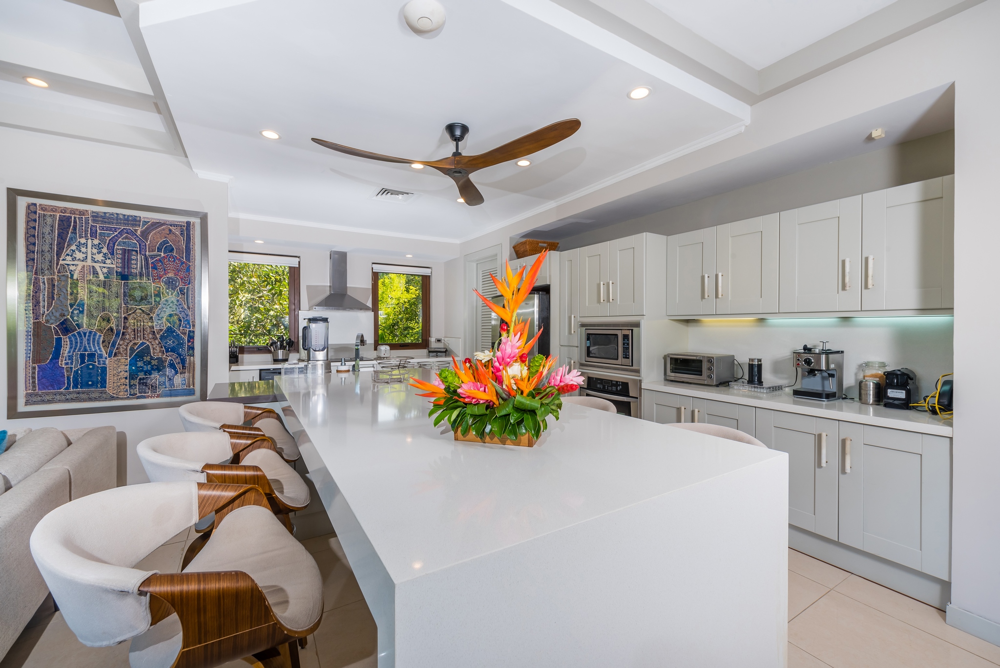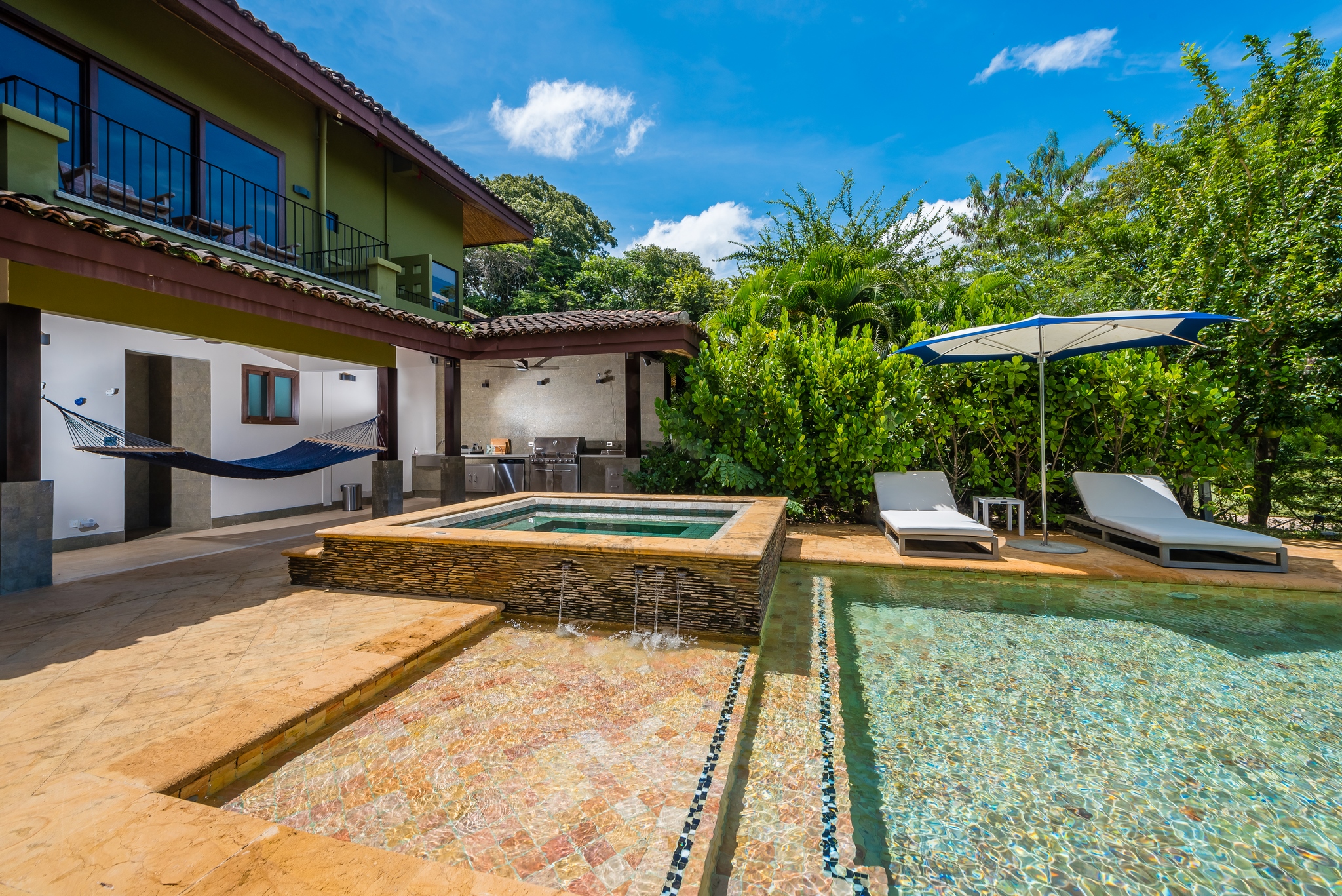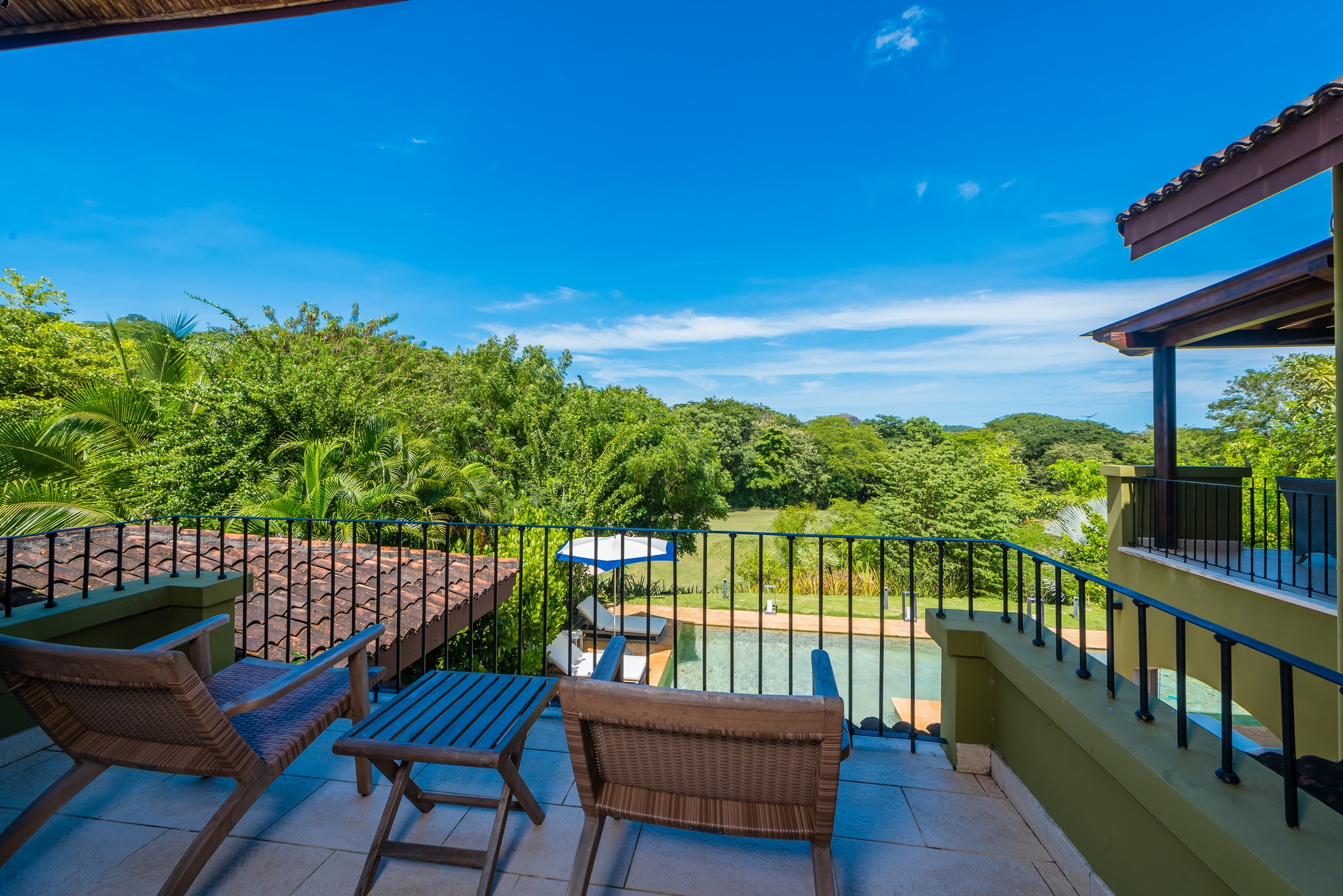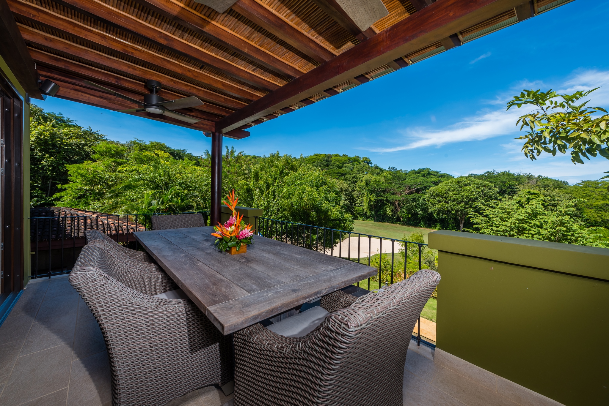 Each bedroom has its own bathroom. The primary bedroom in beautiful greens and blues, has its own entry onto the covered veranda and, in the en suite, its own jacuzzi tub. Imagine taking your morning coffee while gazing into the expanse of the Robert Trent Jones II golf course and listening to myriad tropical birds. Three more bedrooms include another master suite with king bed, a large room with two queens, and a whimsical bunk room, perfect for the kids.