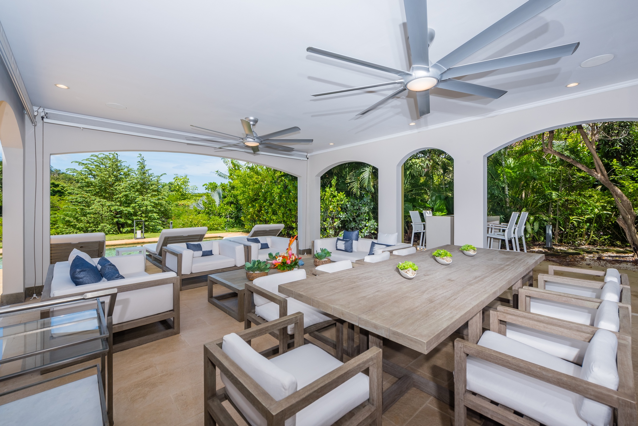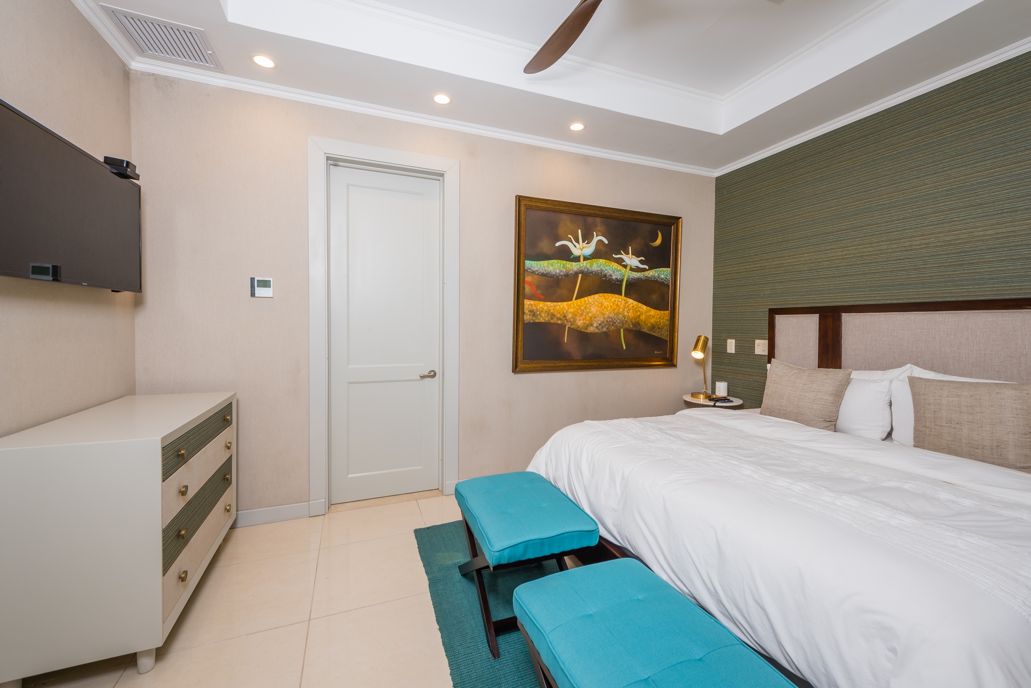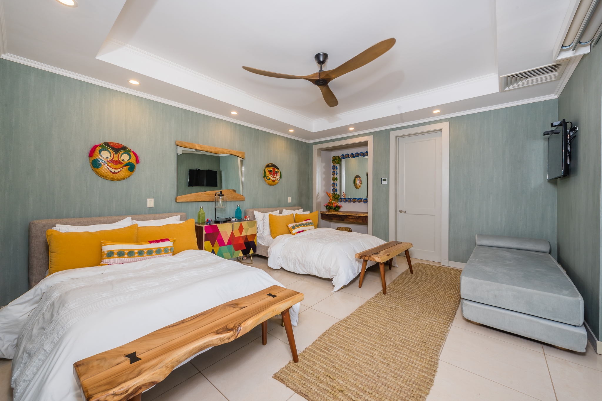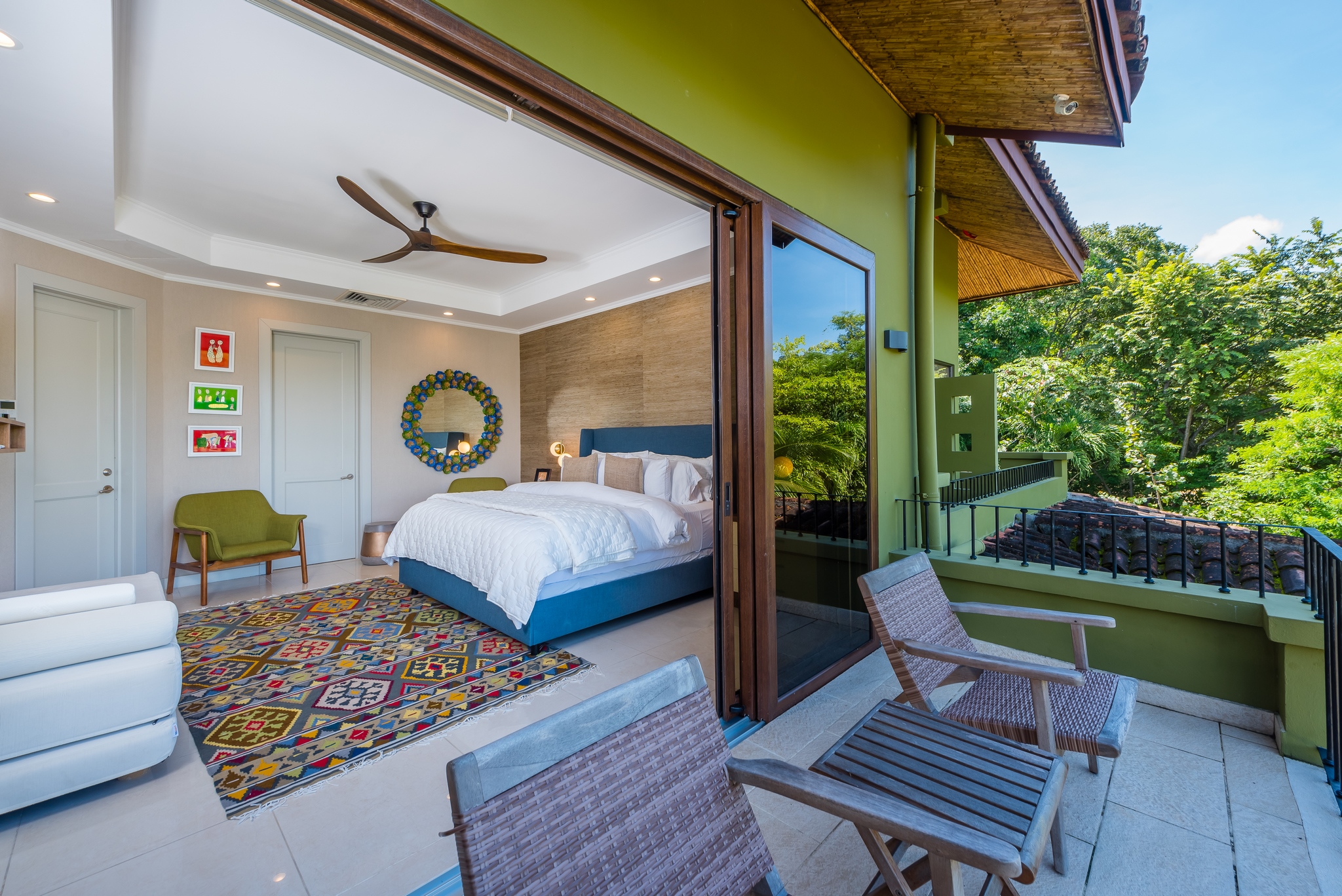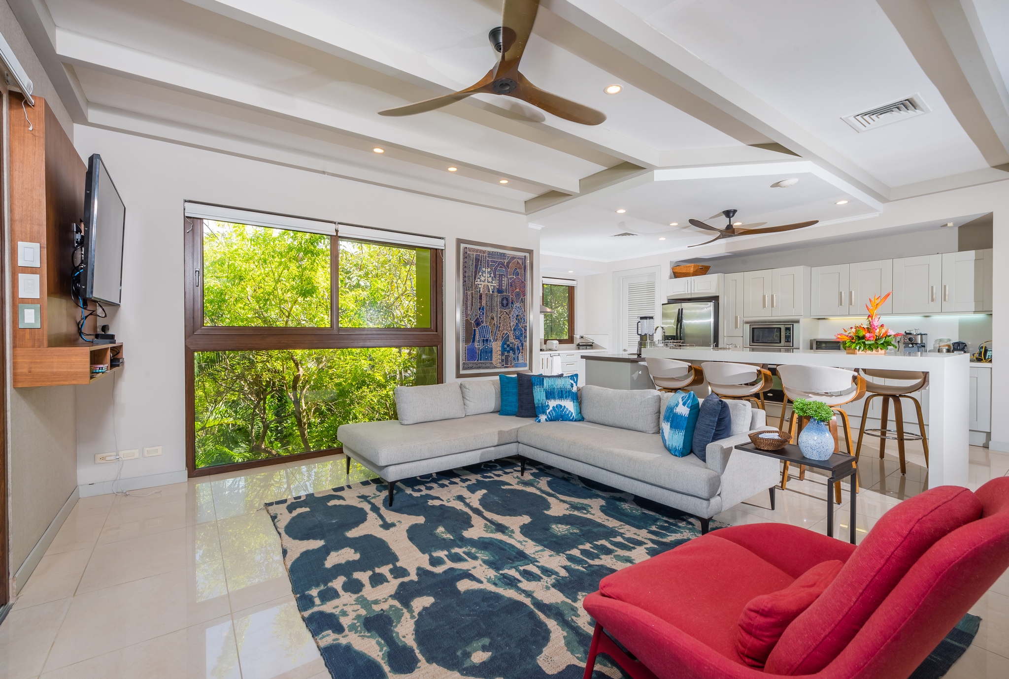 Each bedroom has its own bathroom. The primary bedroom in beautiful greens and blues, has its own entry onto the covered veranda and, in the en suite, its own jacuzzi tub. Imagine taking your morning coffee while gazing into the expanse of the Robert Trent Jones II golf course and listening to myriad tropical birds. Three more bedrooms include another master suite with king bed, a large room with two queens, and a whimsical bunk room, perfect for the kids.