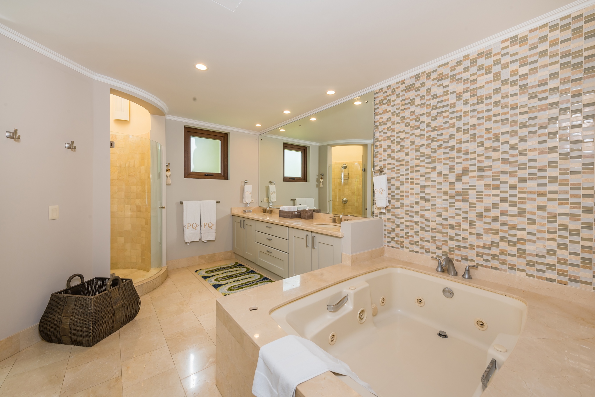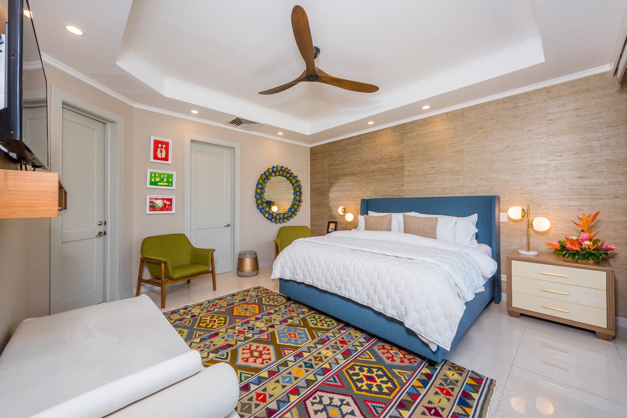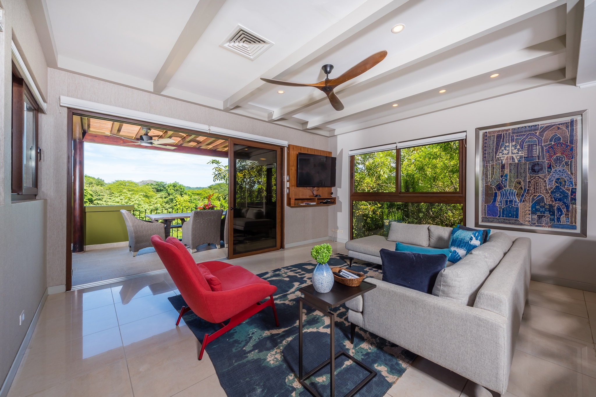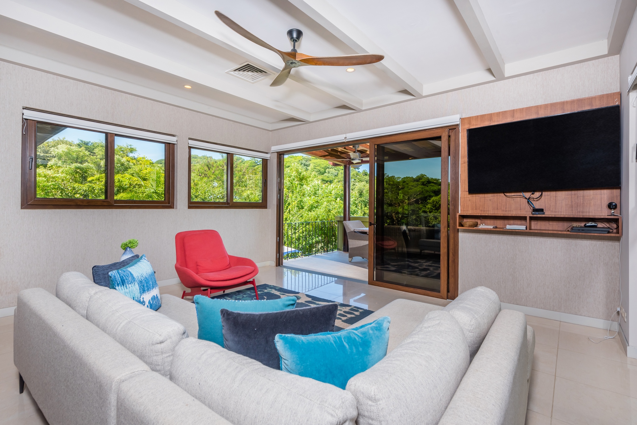 Each bedroom has its own bathroom. The primary bedroom in beautiful greens and blues, has its own entry onto the covered veranda and, in the en suite, its own jacuzzi tub. Imagine taking your morning coffee while gazing into the expanse of the Robert Trent Jones II golf course and listening to myriad tropical birds. Three more bedrooms include another master suite with king bed, a large room with two queens, and a whimsical bunk room, perfect for the kids.