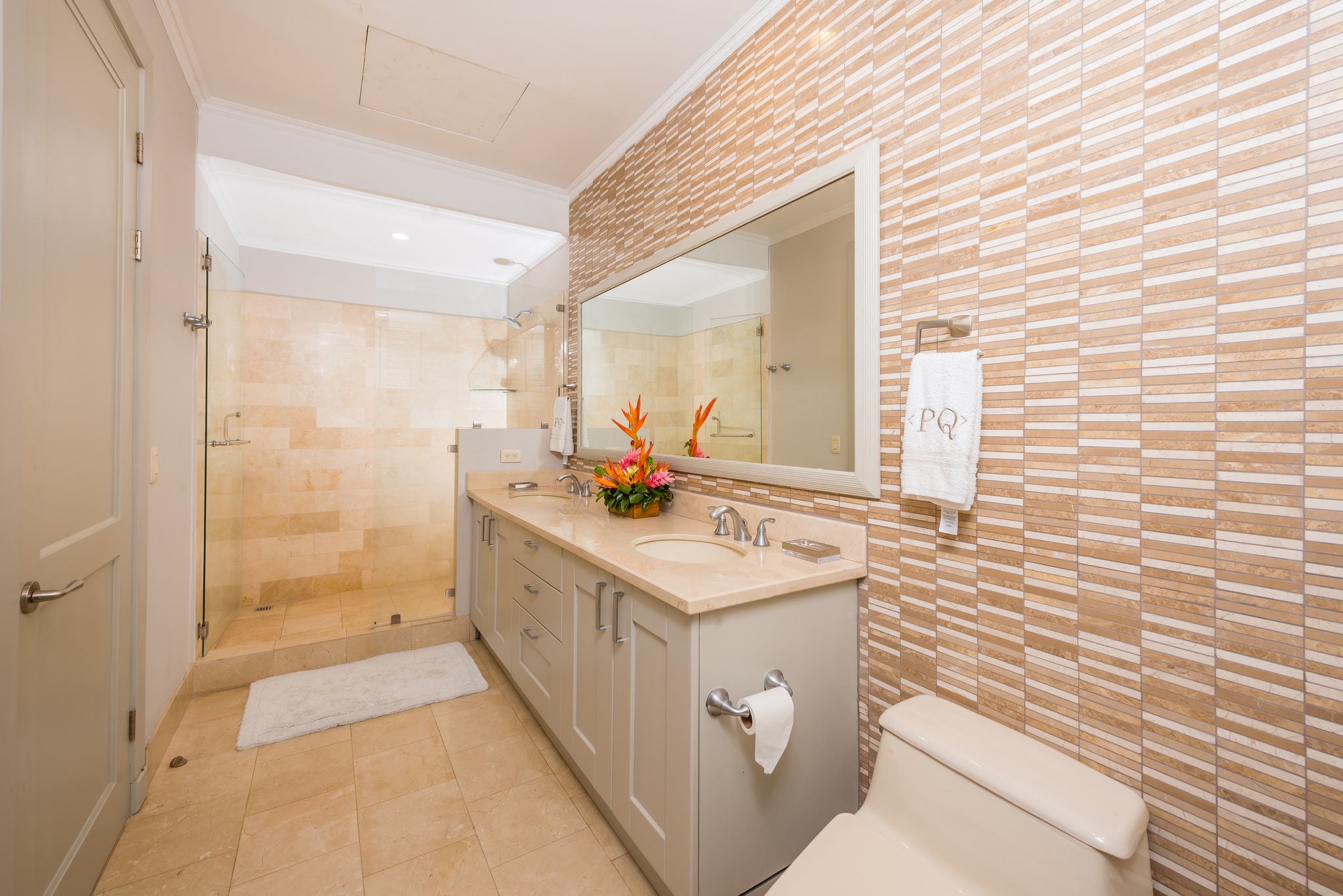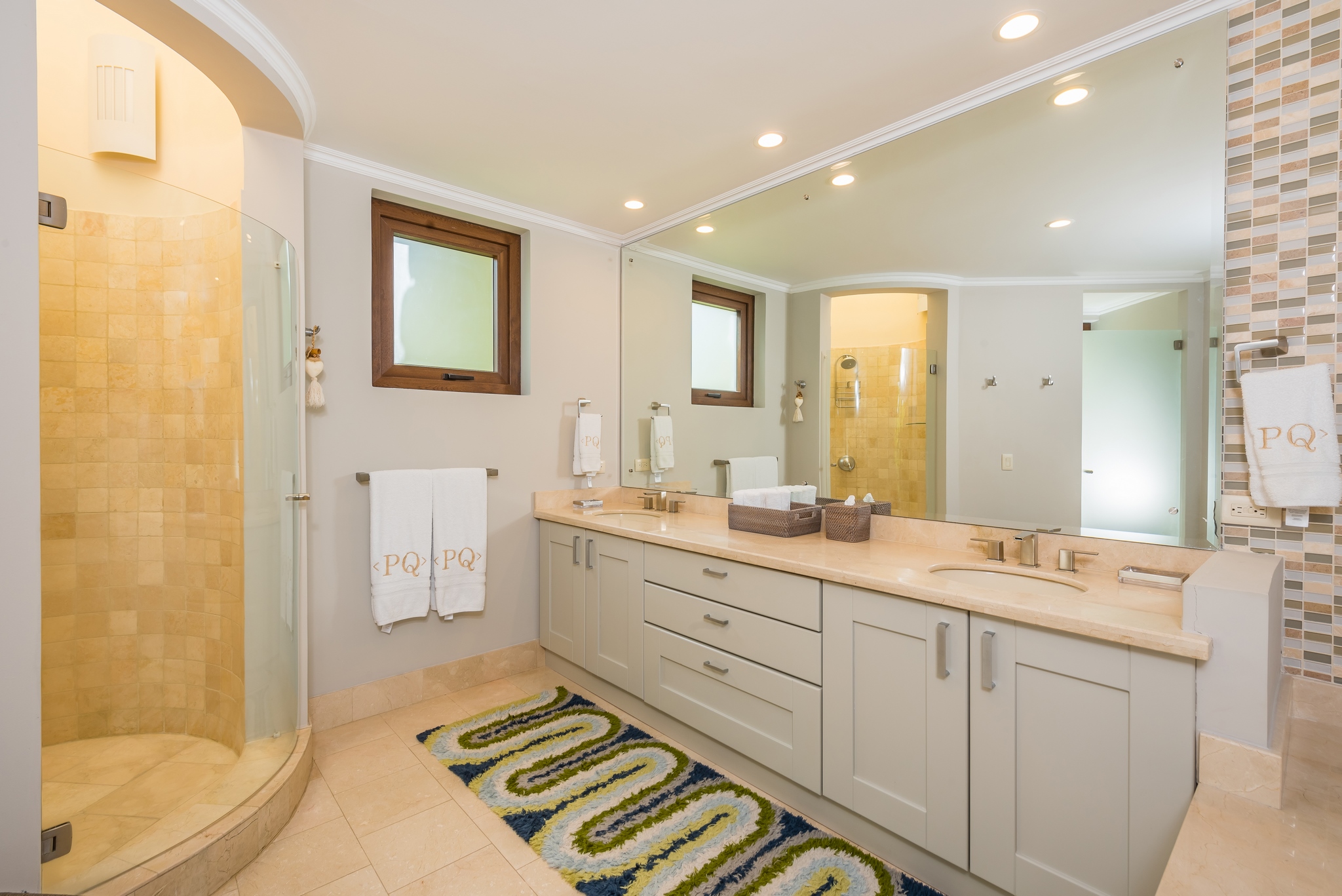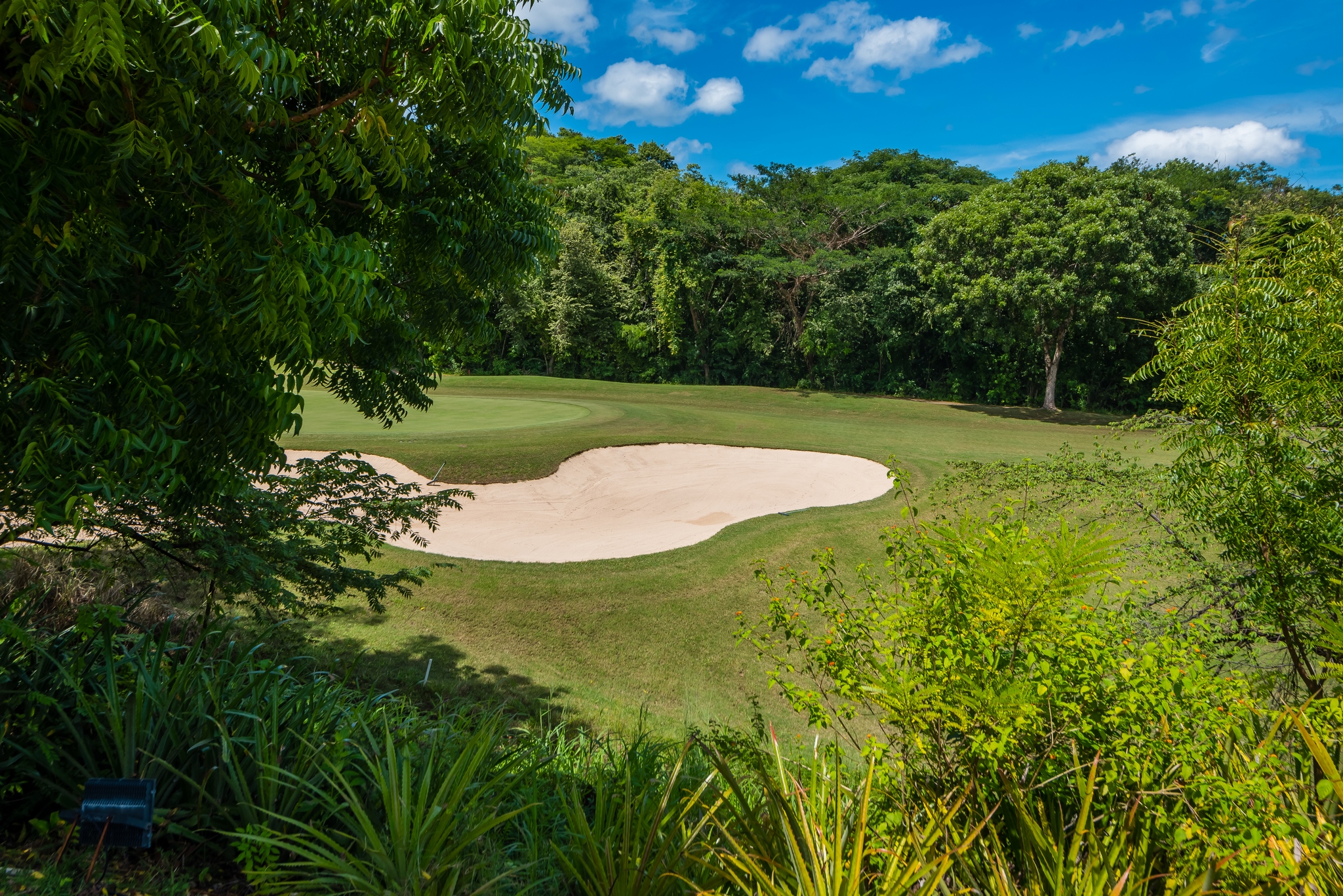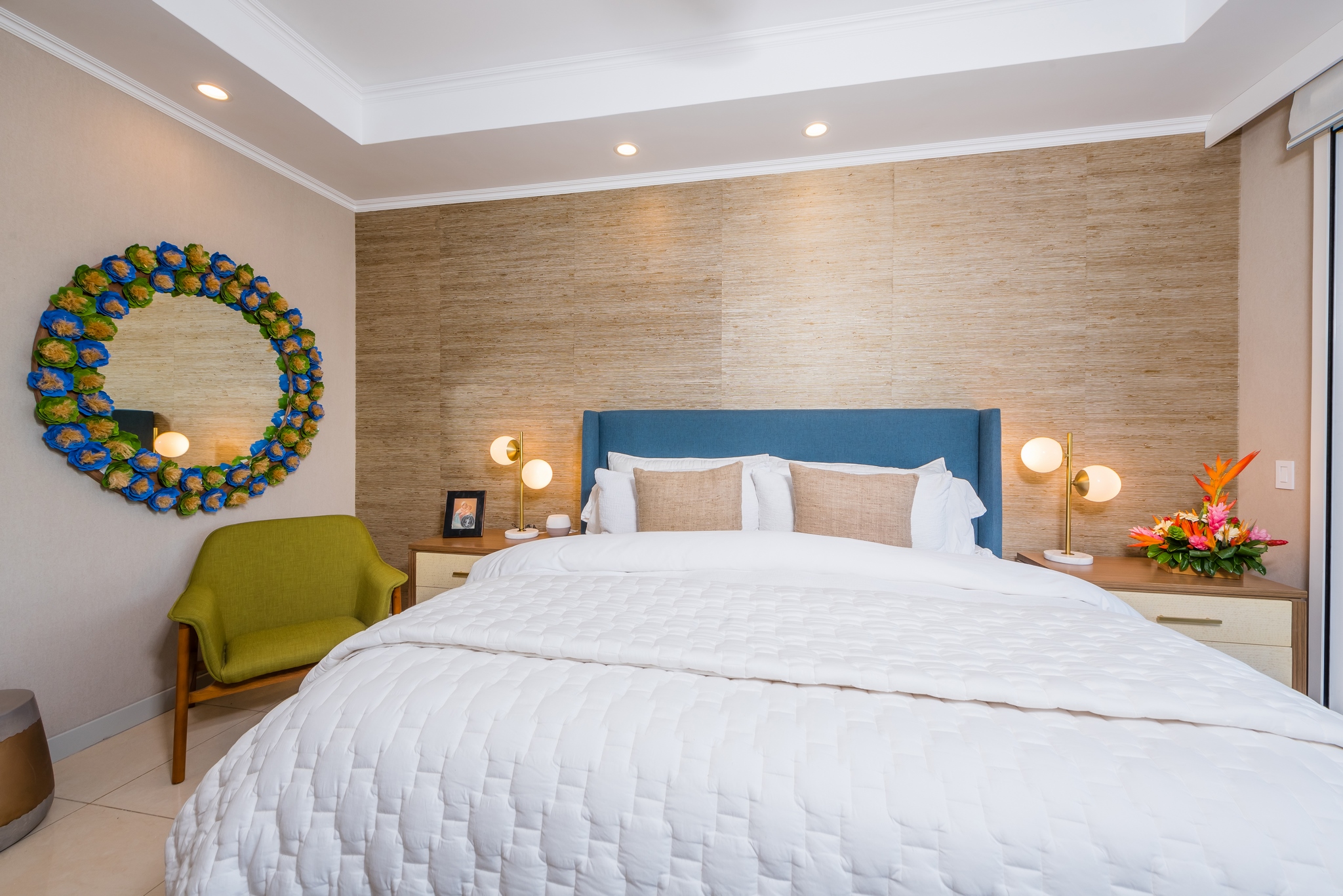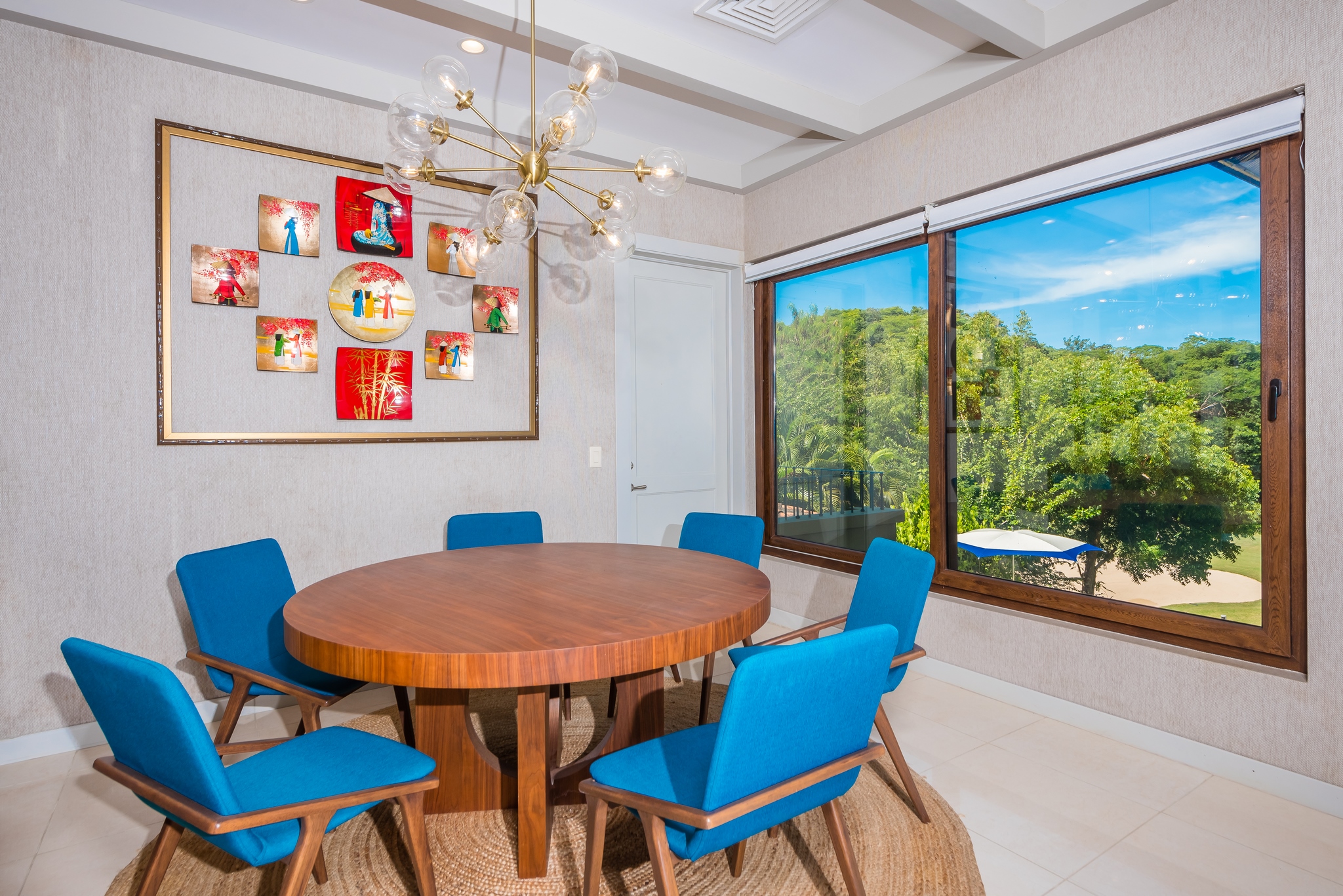 Each bedroom has its own bathroom. The primary bedroom in beautiful greens and blues, has its own entry onto the covered veranda and, in the en suite, its own jacuzzi tub. Imagine taking your morning coffee while gazing into the expanse of the Robert Trent Jones II golf course and listening to myriad tropical birds. Three more bedrooms include another master suite with king bed, a large room with two queens, and a whimsical bunk room, perfect for the kids.
