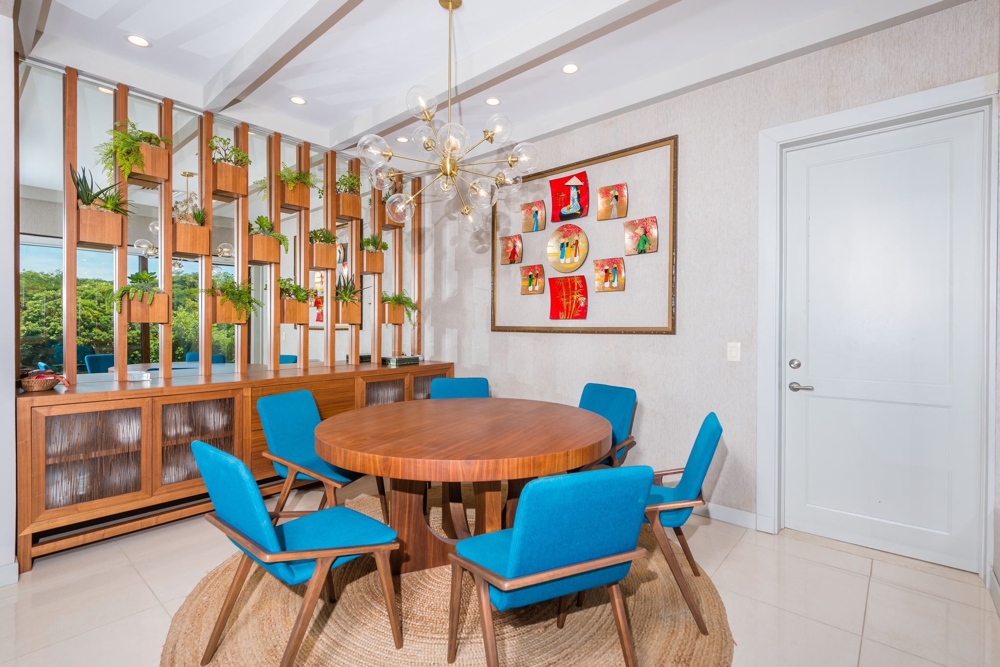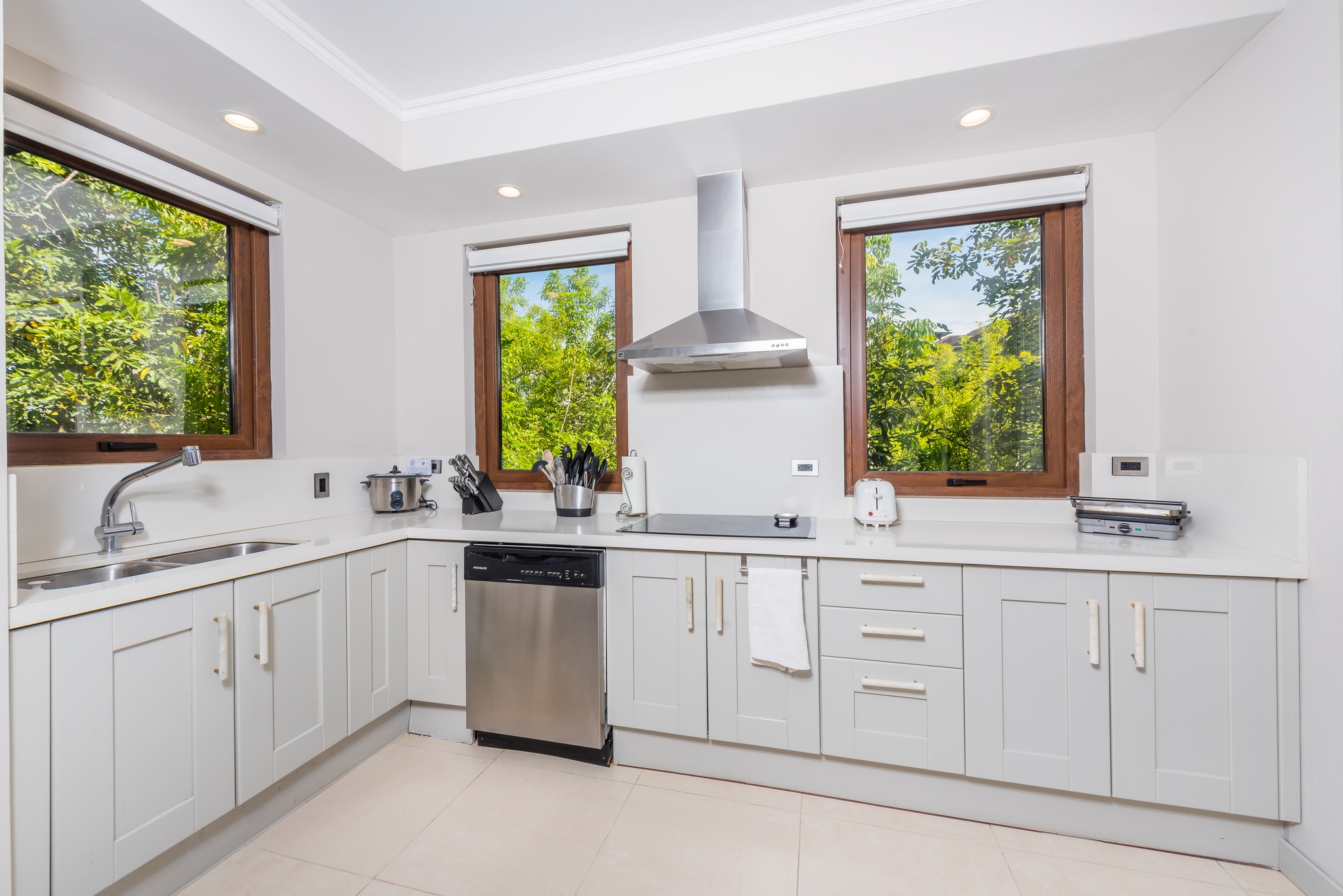 The open concept kitchen, living and dining area opens directly onto the covered outdoor veranda with gorgeous views and space for dining and extra seating. The brand new kitchen features loads of storage, plenty of room for multiple chefs, and high end appliances. The comfortable living room and modern dining room have custom lighting and art.