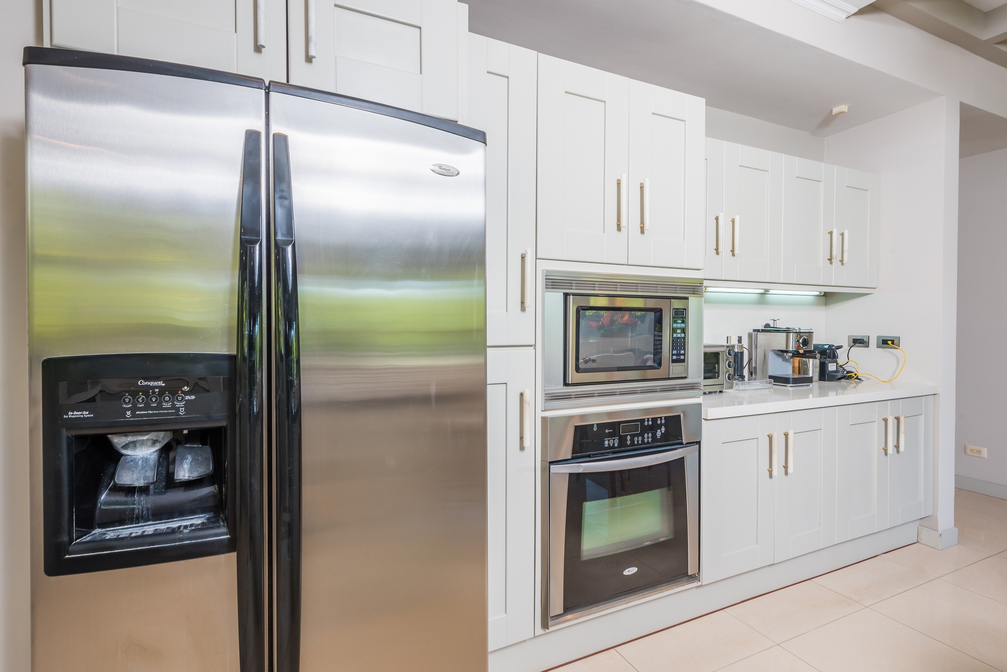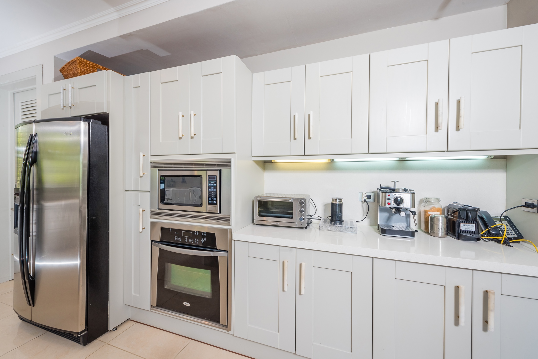 Downstairs, the villa opens onto the massive outdoor entertainment area featuring a state of the art outdoor kitchen, with dishwasher, a covered dining and seating area, and the newly renovated custom pool with jacuzzi. This pool is so big, there’s room for everyone to enjoy. Just inside you’ll appreciate the kitchenette with double ovens to complement the outdoor kitchen, and two refrigerators for wine and beverages. They thought of everything!