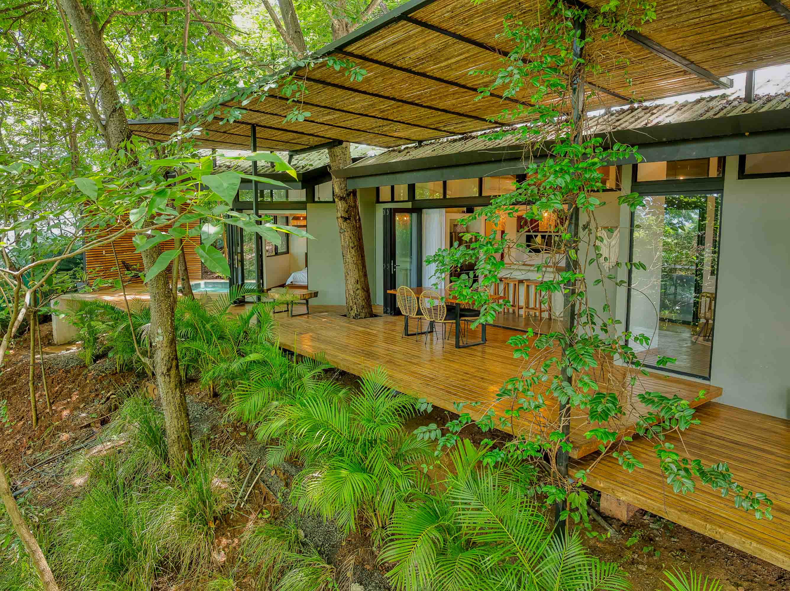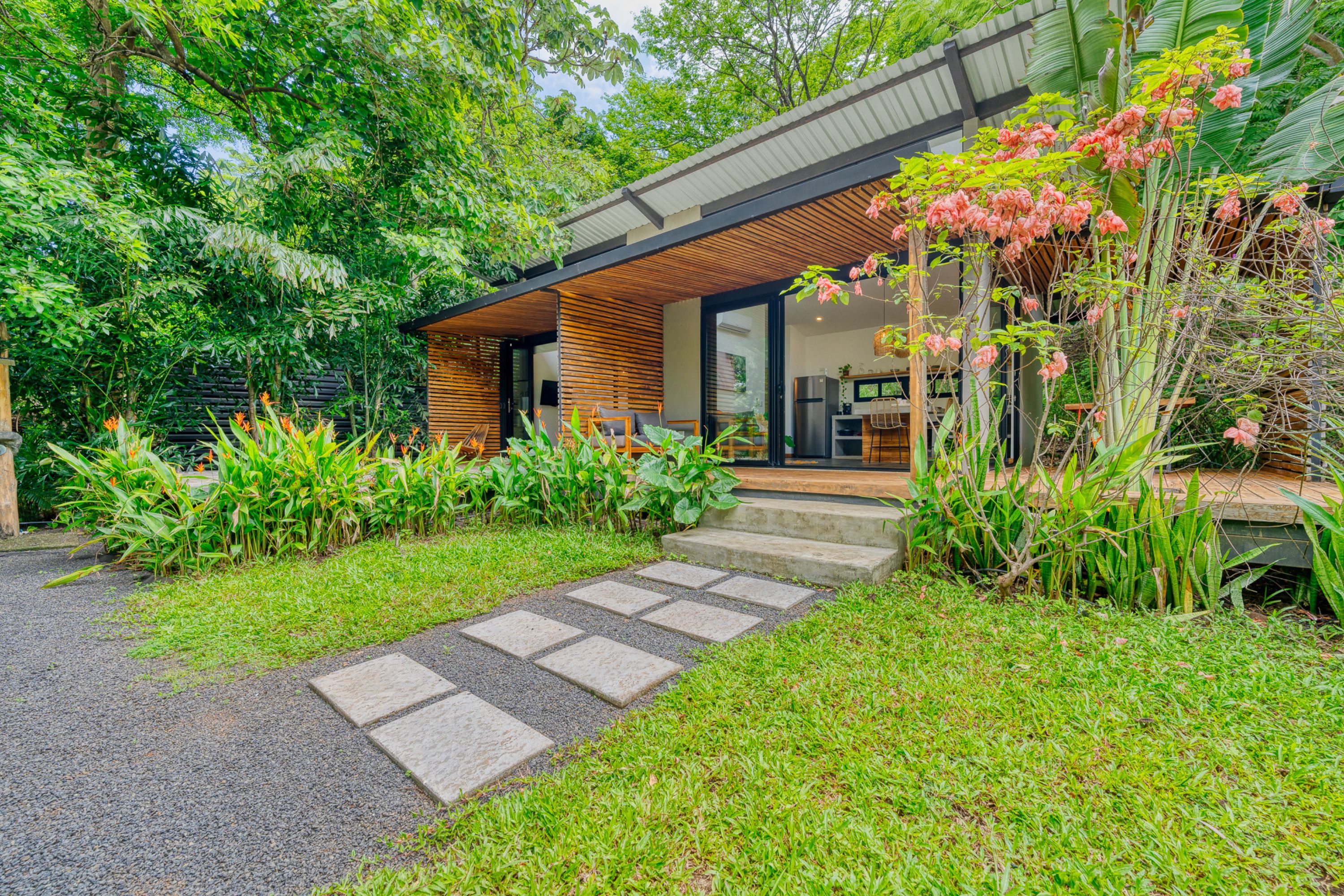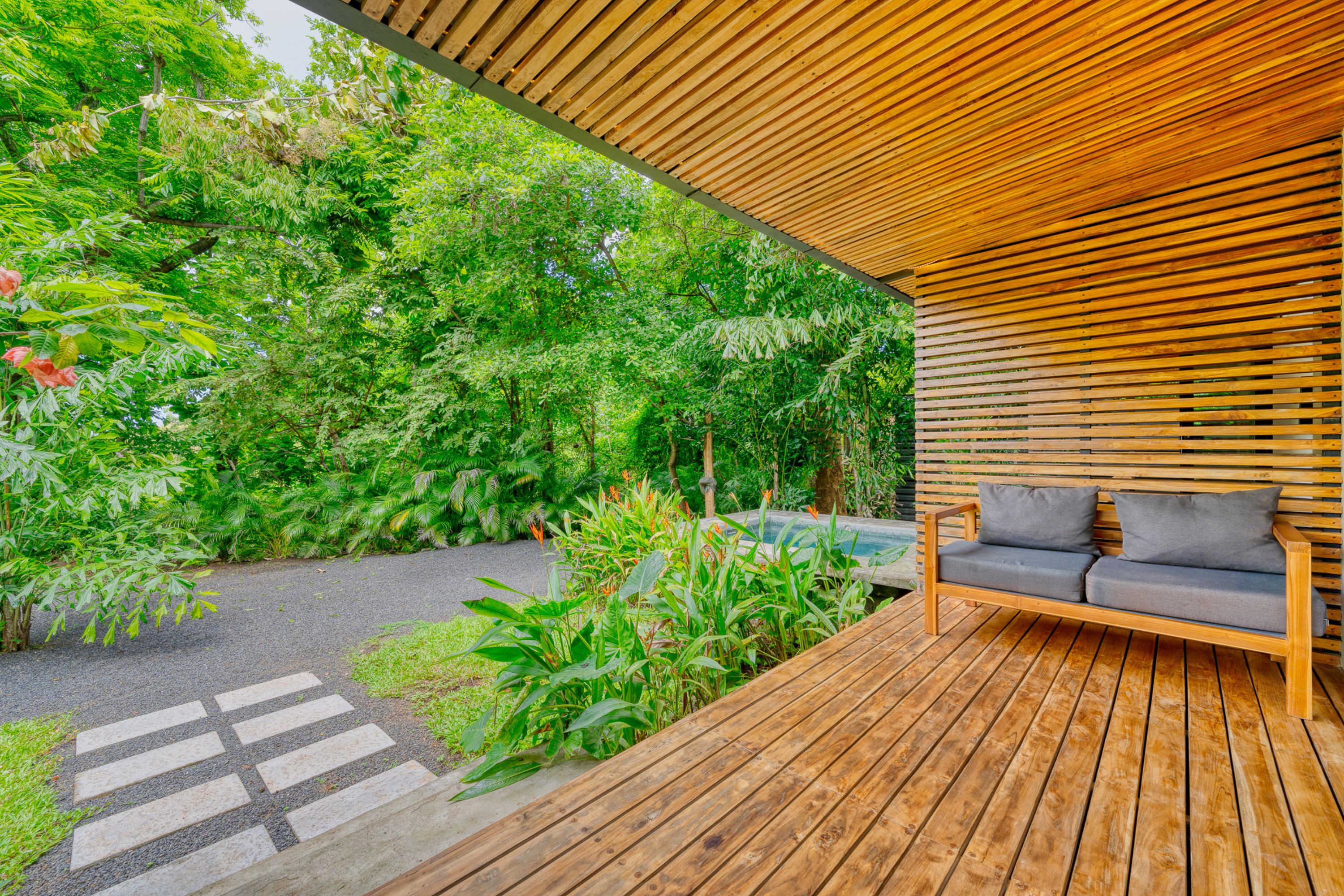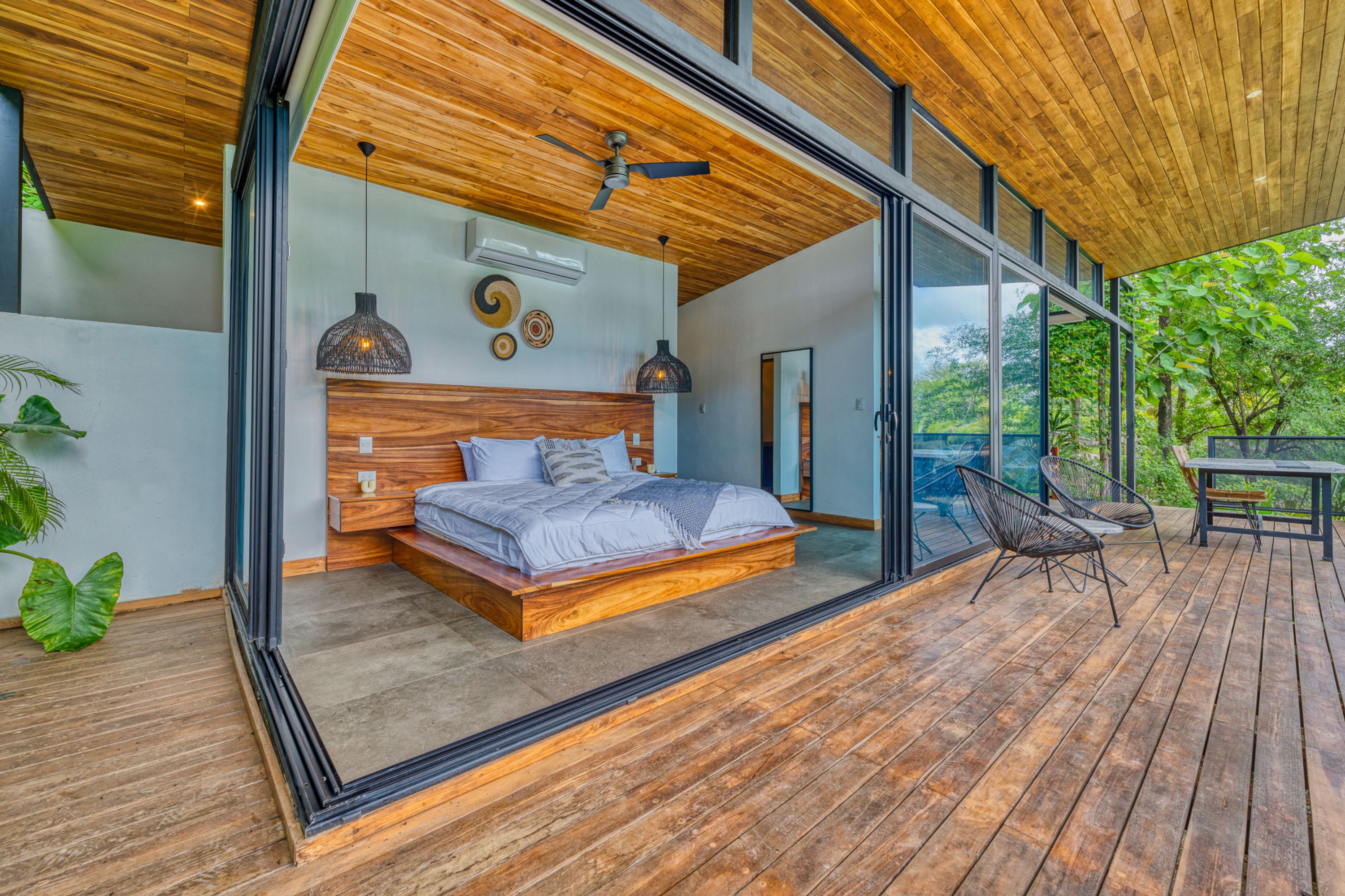 The main residence, a stunning 2-bedroom Balinese-inspired home, was originally built in 2018 and beautifully renovated in 2024. Each bedroom includes an en-suite bathroom with indoor/outdoor showers, immersing you in the tropical experience. The open-concept kitchen and living area flow seamlessly onto a spacious wooden deck that overlooks lush greenery — and during the dry season, offers peekaboo ocean views. A deep plunge pool with a seating area completes the space, perfect for relaxing after a day of sun and surf.