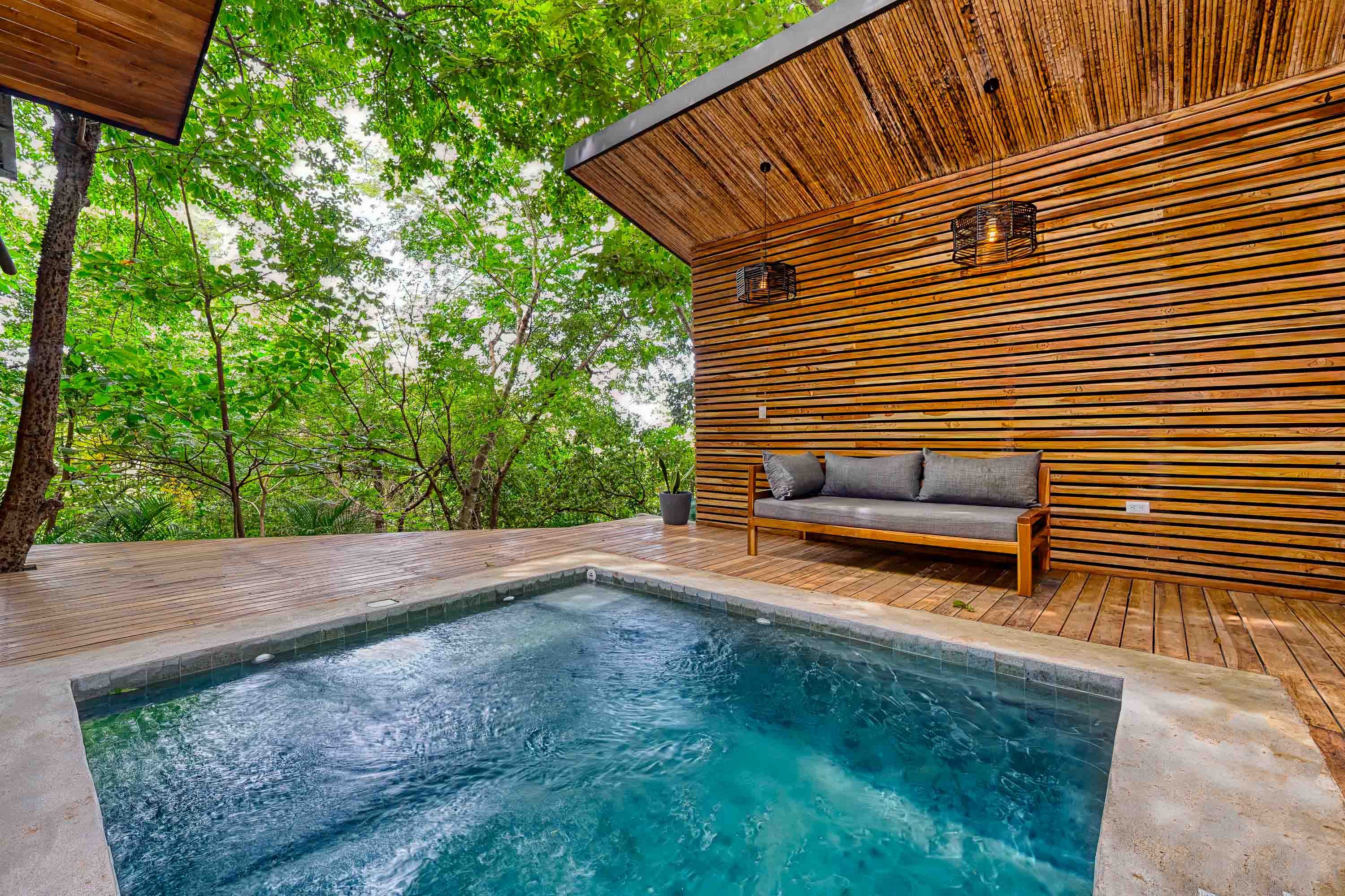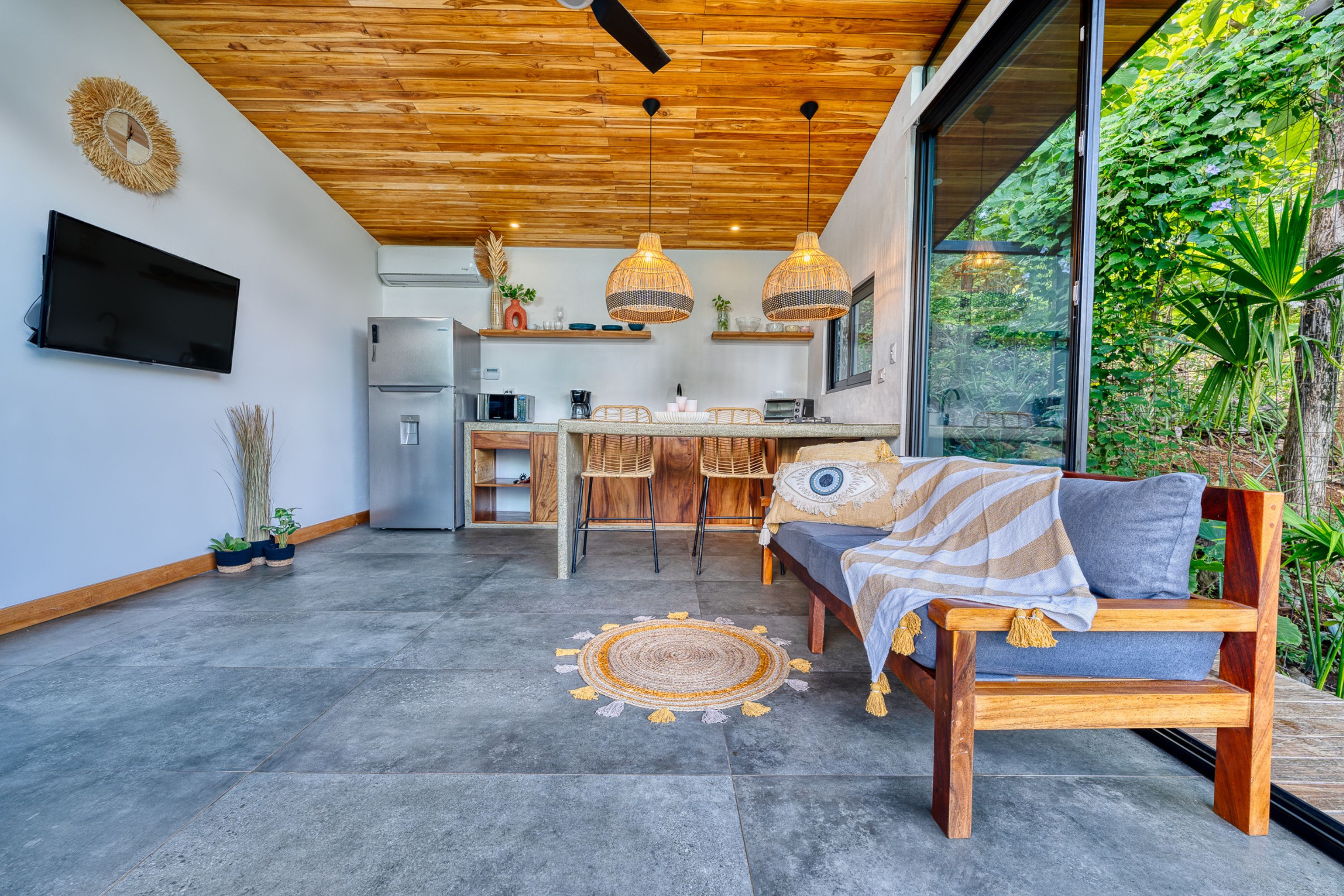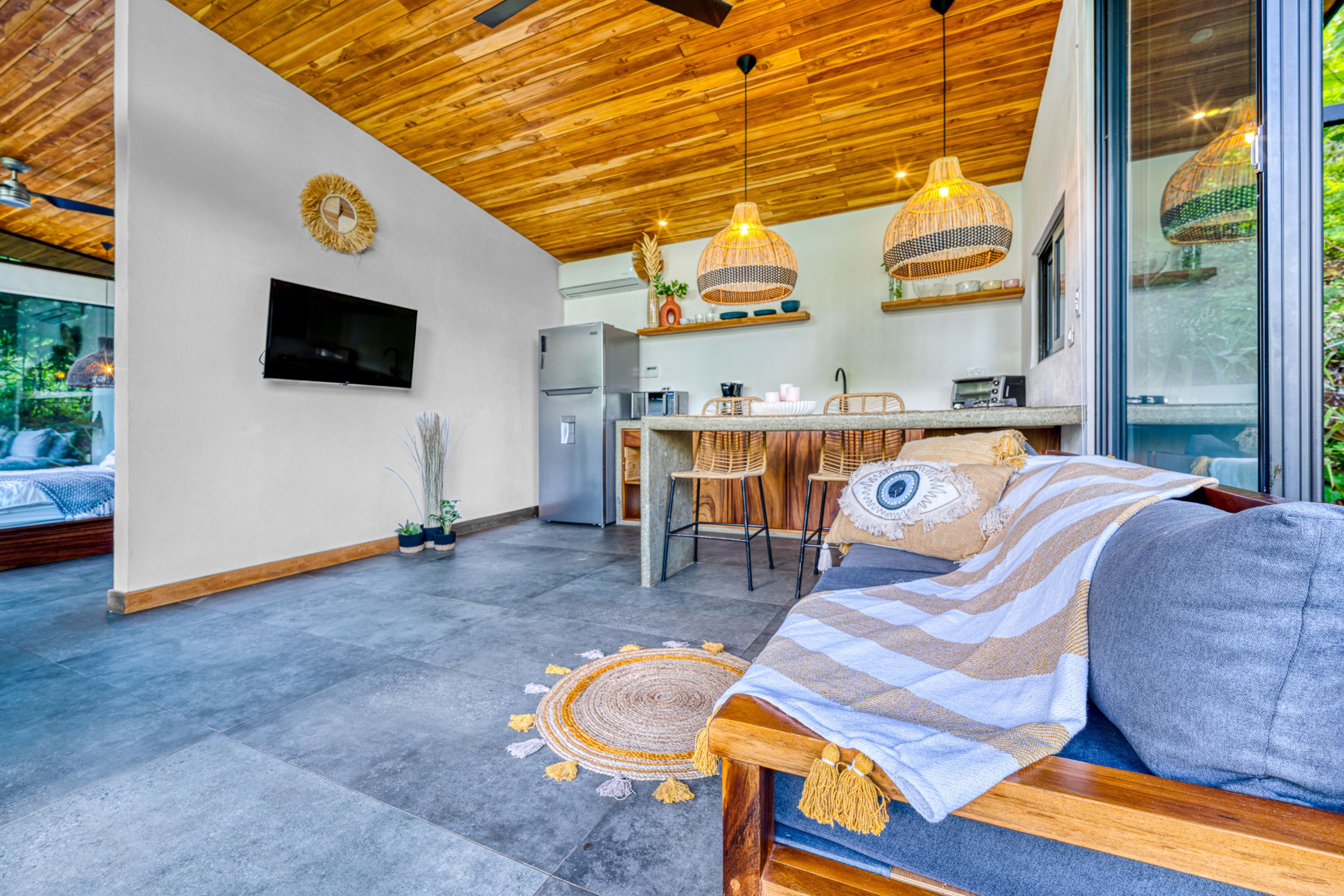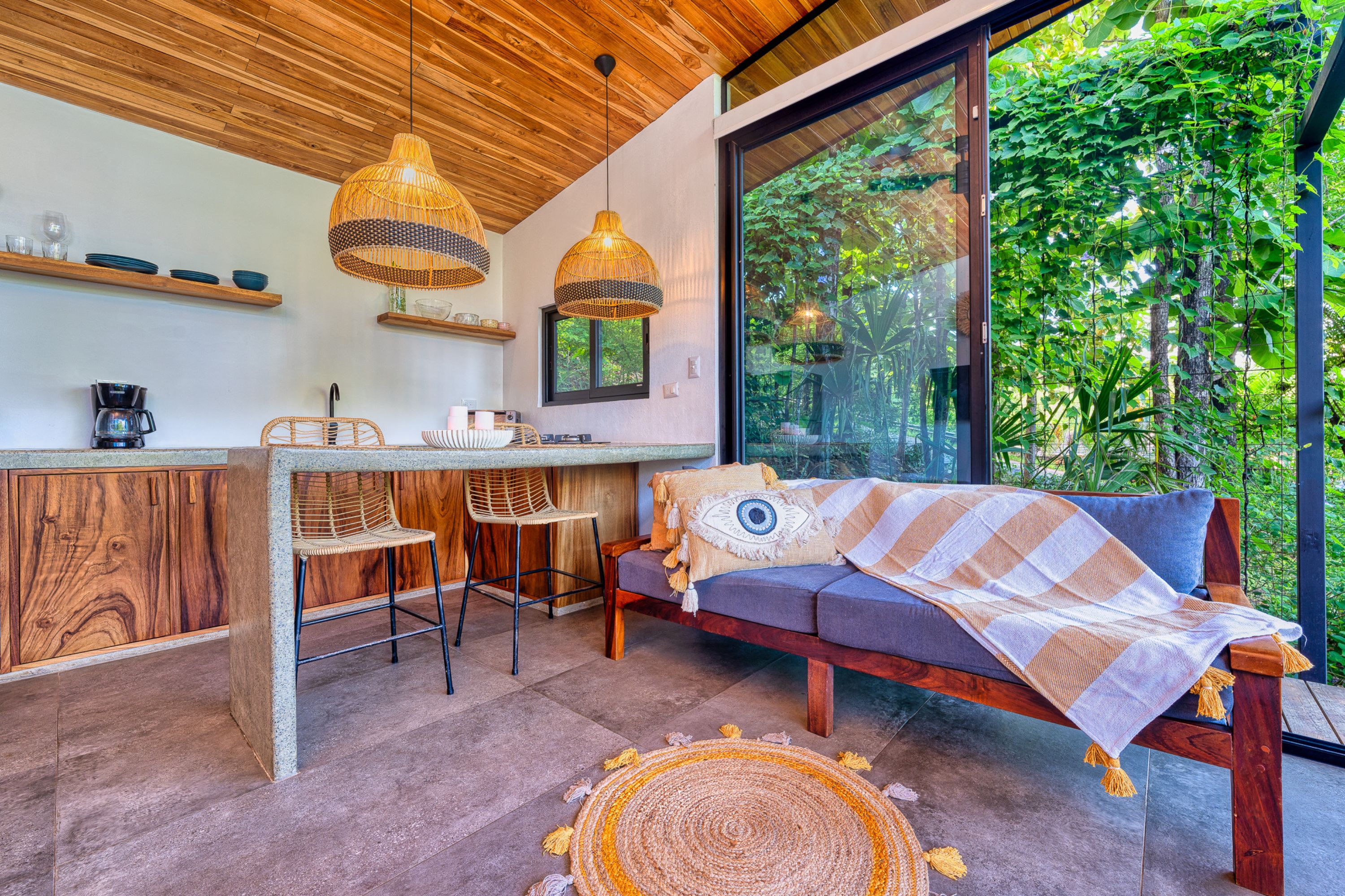 The main residence, a stunning 2-bedroom Balinese-inspired home, was originally built in 2018 and beautifully renovated in 2024. Each bedroom includes an en-suite bathroom with indoor/outdoor showers, immersing you in the tropical experience. The open-concept kitchen and living area flow seamlessly onto a spacious wooden deck that overlooks lush greenery — and during the dry season, offers peekaboo ocean views. A deep plunge pool with a seating area completes the space, perfect for relaxing after a day of sun and surf.